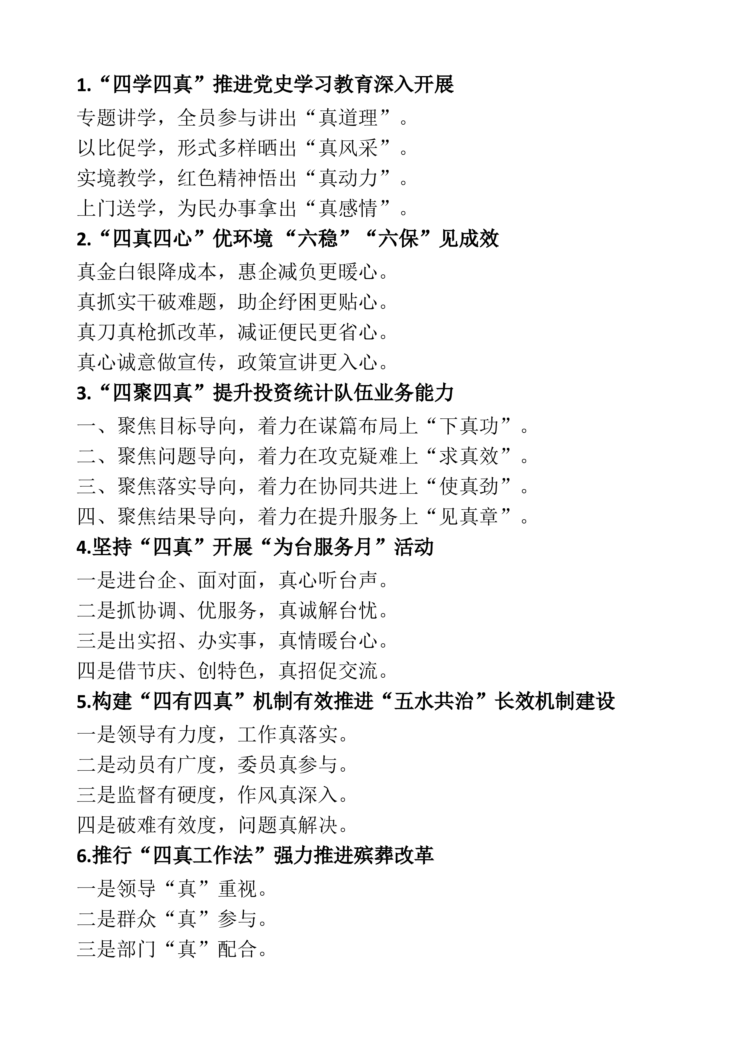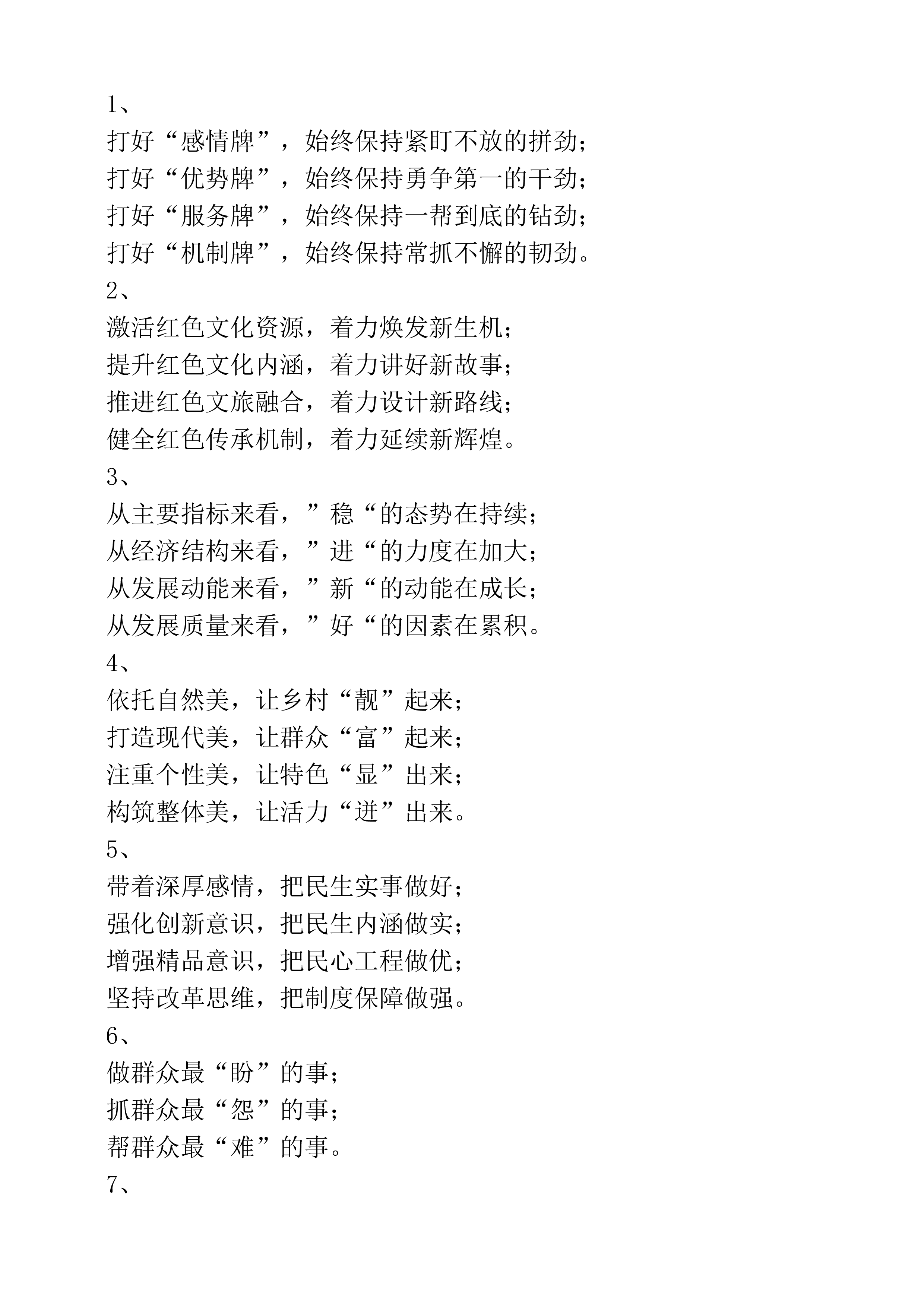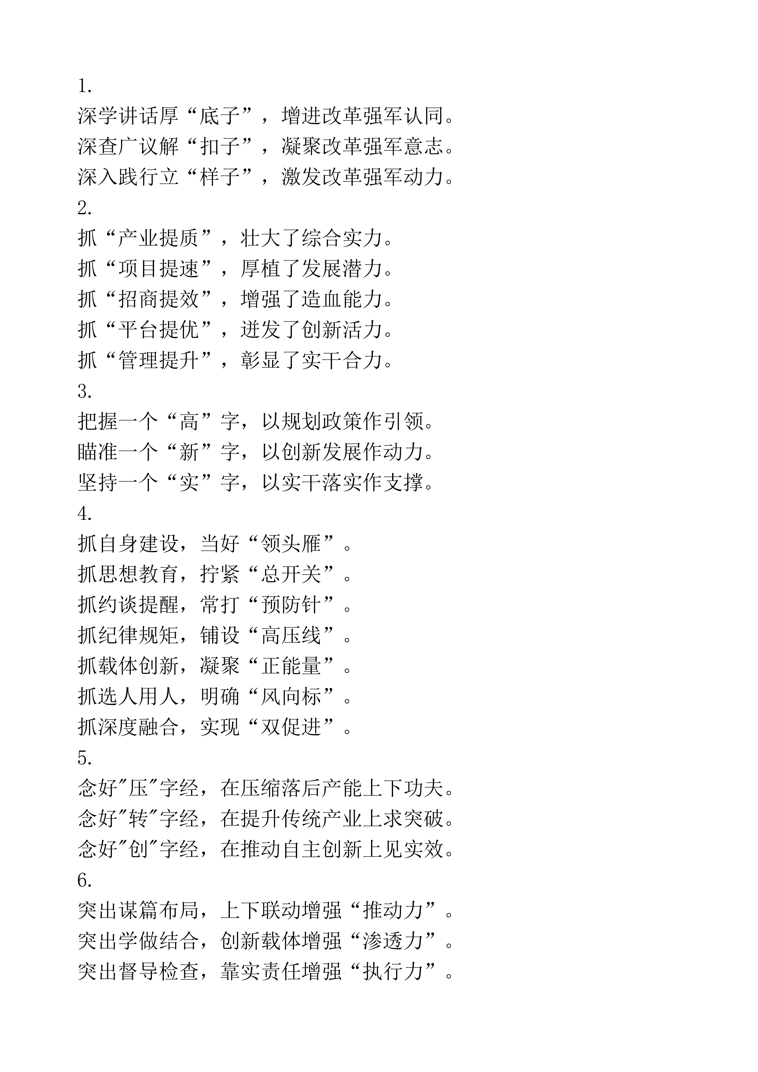 1.深学讲话厚“底子”,增进改革强军认同。深查广议解“扣子”,凝聚改革强军意志。深入践行立“样子”,激发改革强军动力。2.抓“产业提质”,壮大了综合实力。抓“项目提速”,厚植了发展潜力。抓“招商提效”,增强了造血能力。抓“平台提优”,迸发了创新活力。抓“管理提升”,彰显了实干合力。3.把握一个“高”字,以规划政策作引领。瞄准一个“新”字,以创新发展作动力。坚持一个“实”字,以实干落实作支撑。4.抓自身建设,当好“领头雁”。抓思想教育,拧紧“总开关”。抓约谈提醒,常打“预防针”。抓纪律规矩,铺设“高压线”。抓载体创新,凝聚“正能量”。抓选人用人,明确“风向标”。抓深度融合,实现“双促进”。5.念...