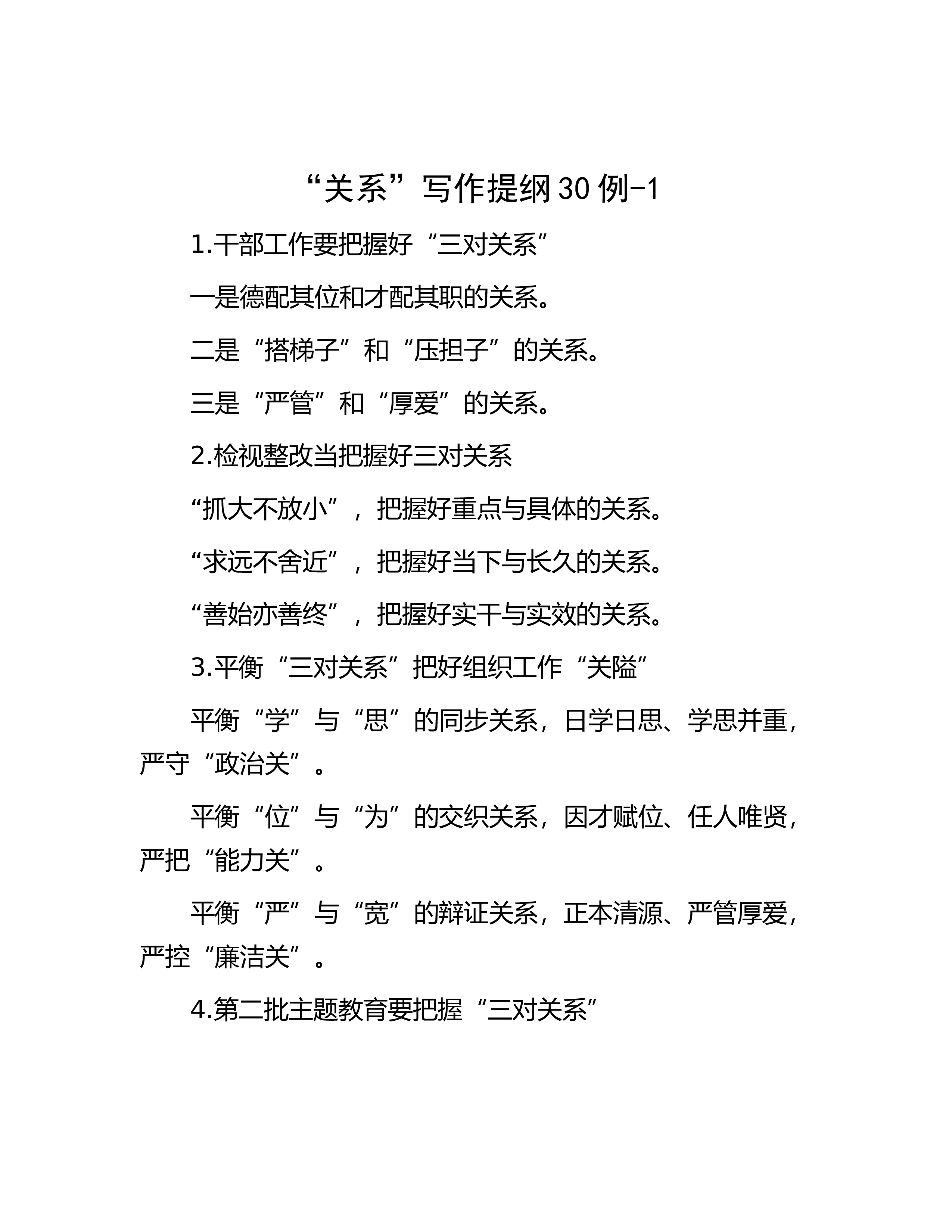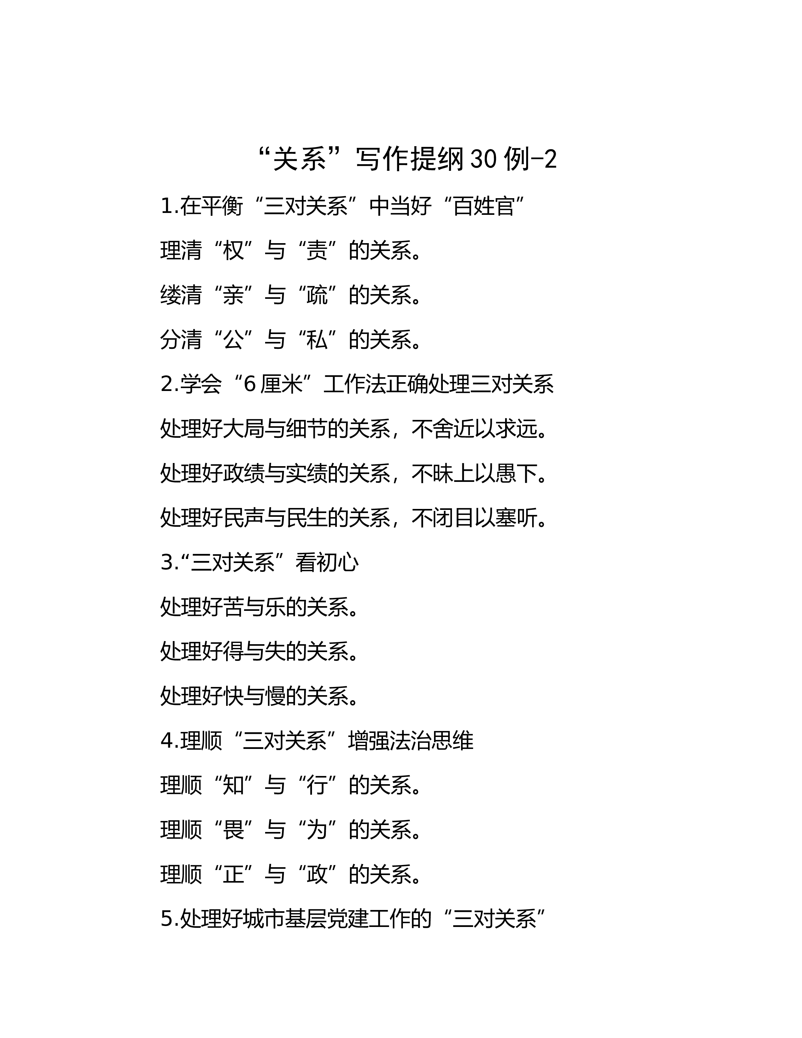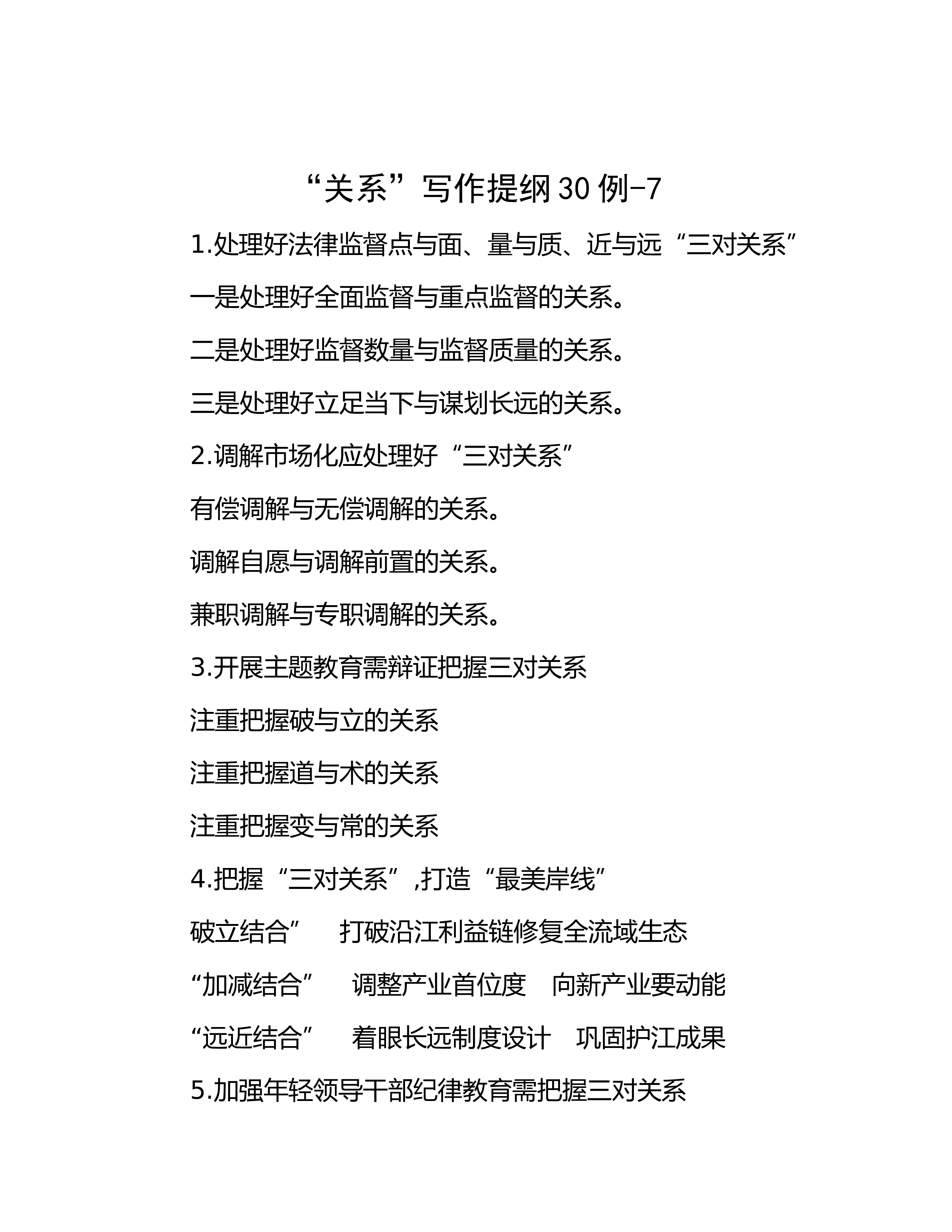 “关系”写作提纲30例-71.处理好法律监督点与面、量与质、近与远“三对关系”一是处理好全面监督与重点监督的关系。二是处理好监督数量与监督质量的关系。三是处理好立足当下与谋划长远的关系。2.调解市场化应处理好“三对关系”有偿调解与无偿调解的关系。调解自愿与调解前置的关系。兼职调解与专职调解的关系。3.开展主T教育需辩证把握三对关系注重把握破与立的关系注重把握道与术的关系注重把握变与常的关系4.把握“三对关系”,打造“最美岸线”破立结合” 打破沿江利益链修复全流域生态“加减结合” 调整产业首位度 向新产业要动能“远近结合” 着眼长远制度设计 巩固护江成果5.加强年轻领导干部纪律教育需把握三对关系...