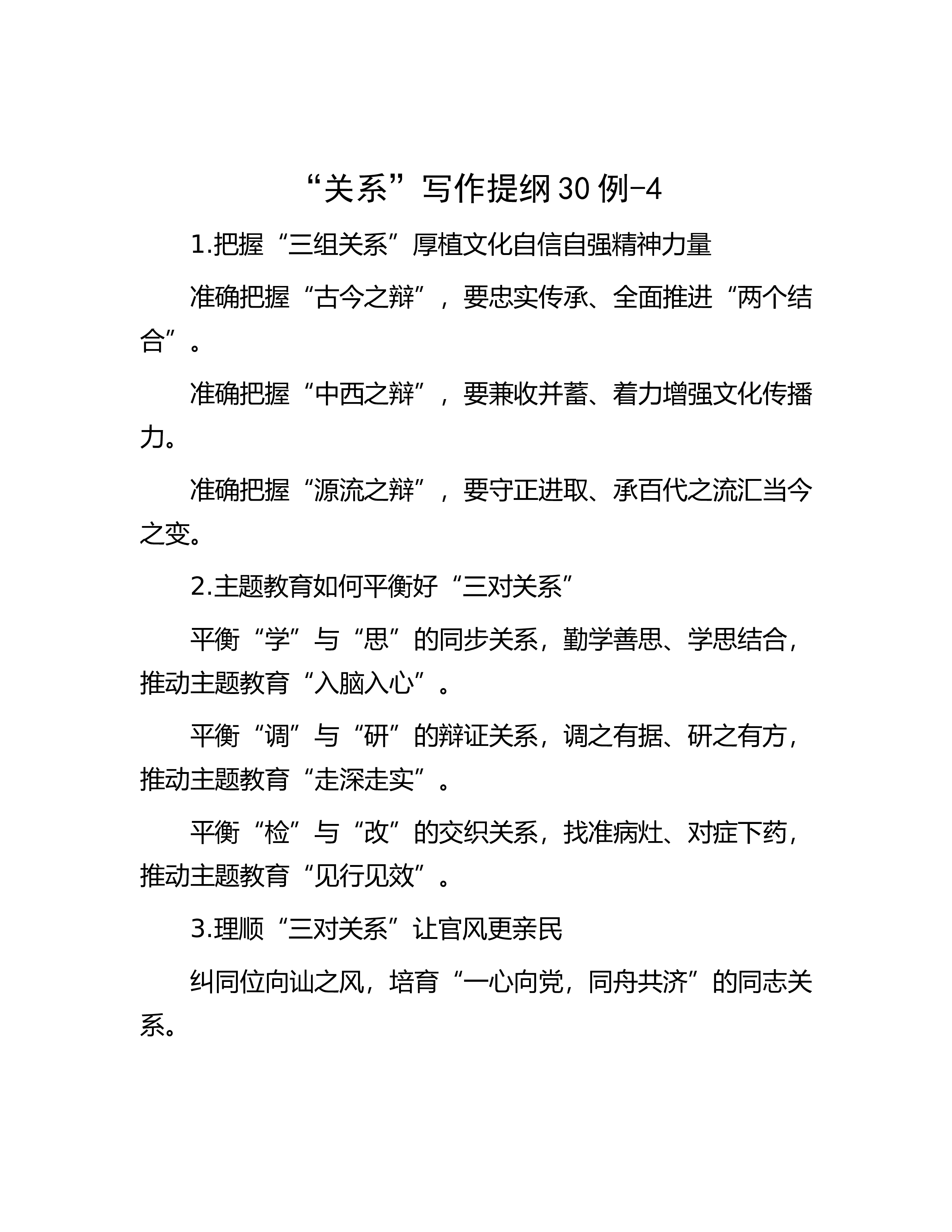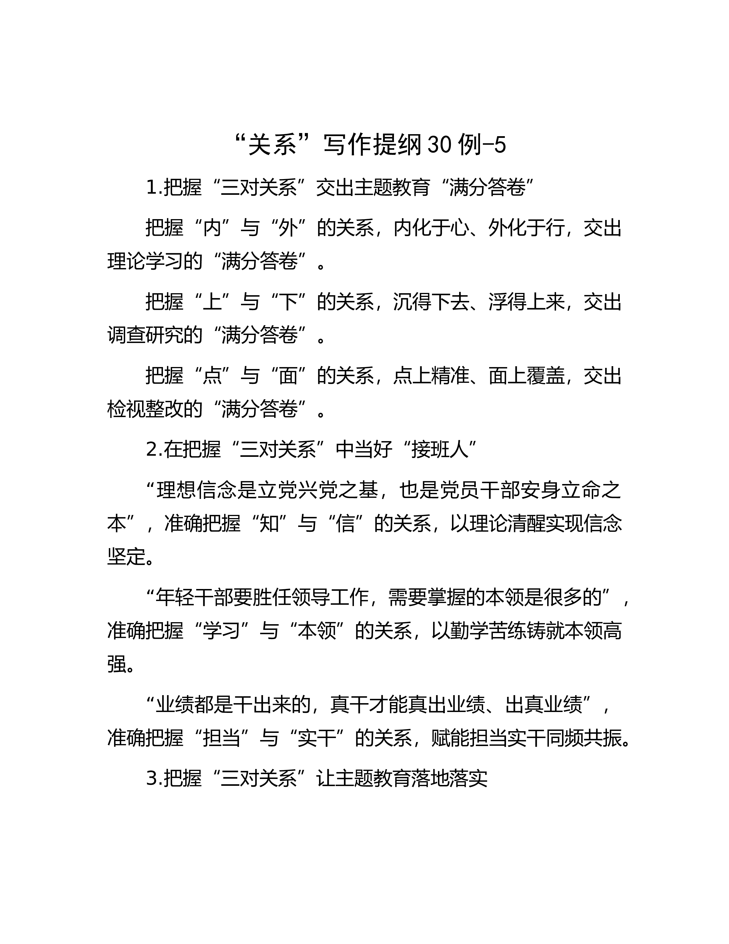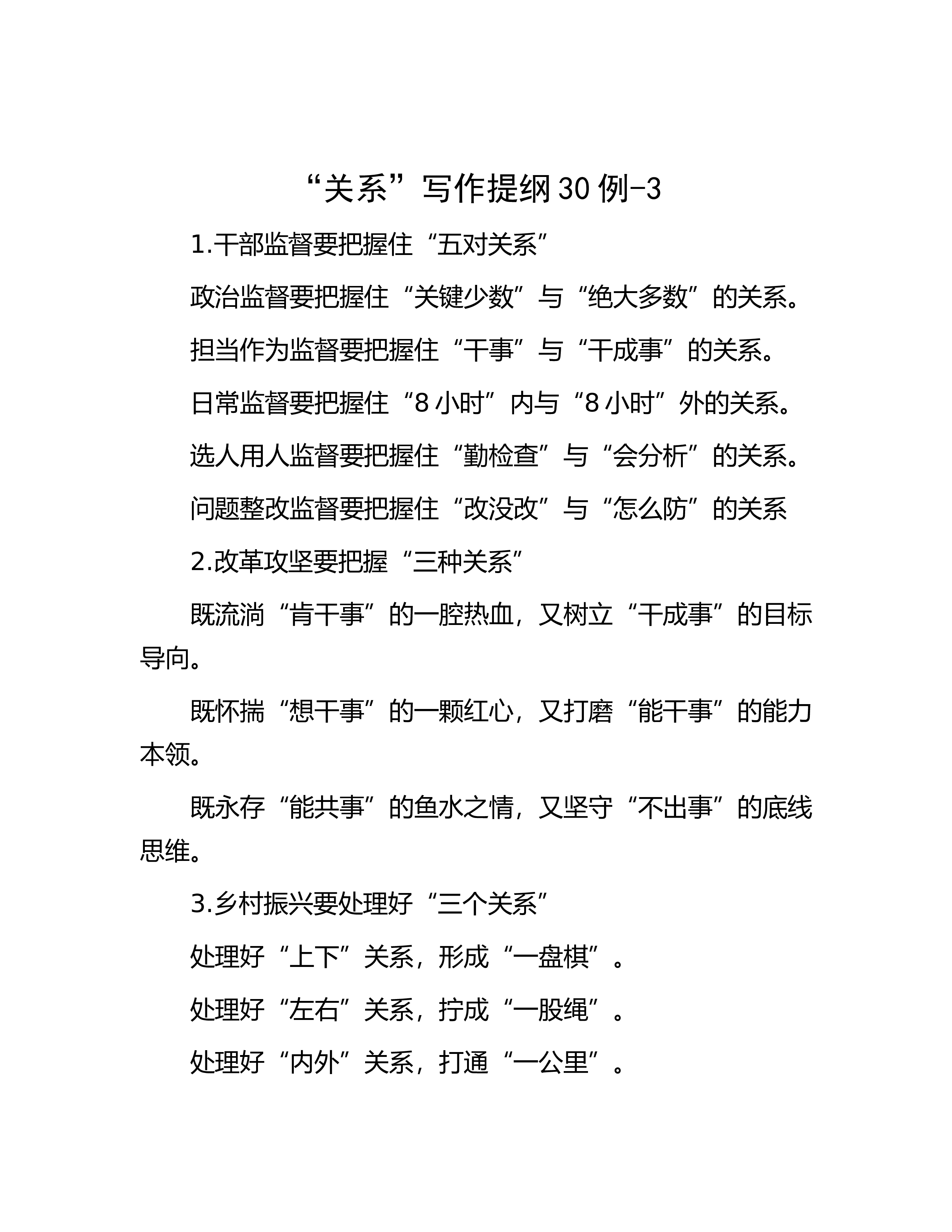 “关系”写作提纲30例-71.处理好法律监督点与面、量与质、近与远“三对关系”一是处理好全面监督与重点监督的关系。二是处理好监督数量与监督质量的关系。三是处理好立足当下与谋划长远的关系。2.调解市场化应处理好“三对关系”有偿调解与无偿调解的关系。调解自愿与调解前置的关系。兼职调解与专职调解的关系。3.开展主T教育需辩证把握三对关系注重把握破与立的关系注重把握道与术的关系注重把握变与常的关系4.把握“三对关系”,打造“最美岸线”破立结合” 打破沿江利益链修复全流域生态“加减结合” 调整产业首位度 向新产业要动能“远近结合” 着眼长远制度设计 巩固护江成果5.加强年轻领导干部纪律教育需把握三对关系...