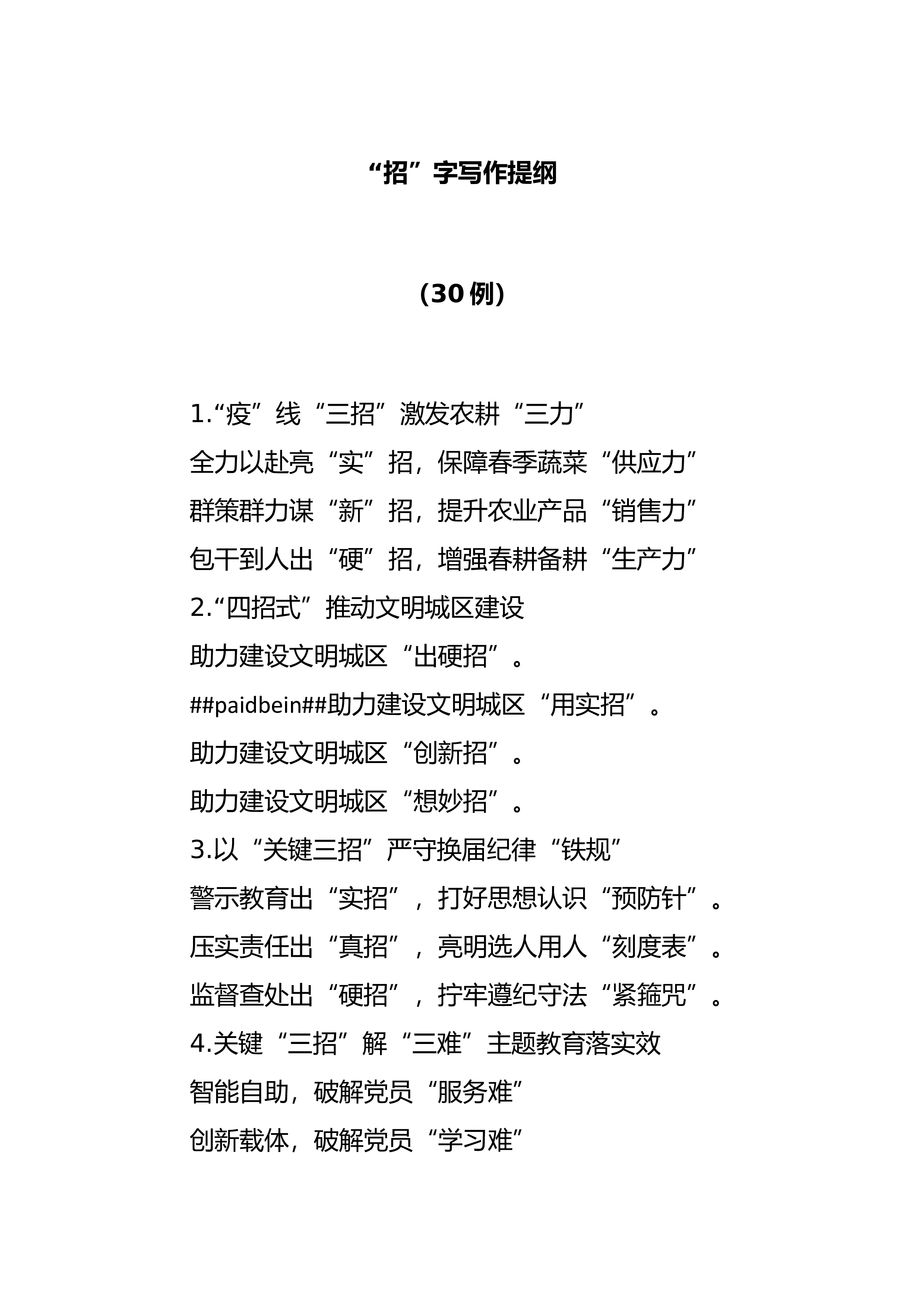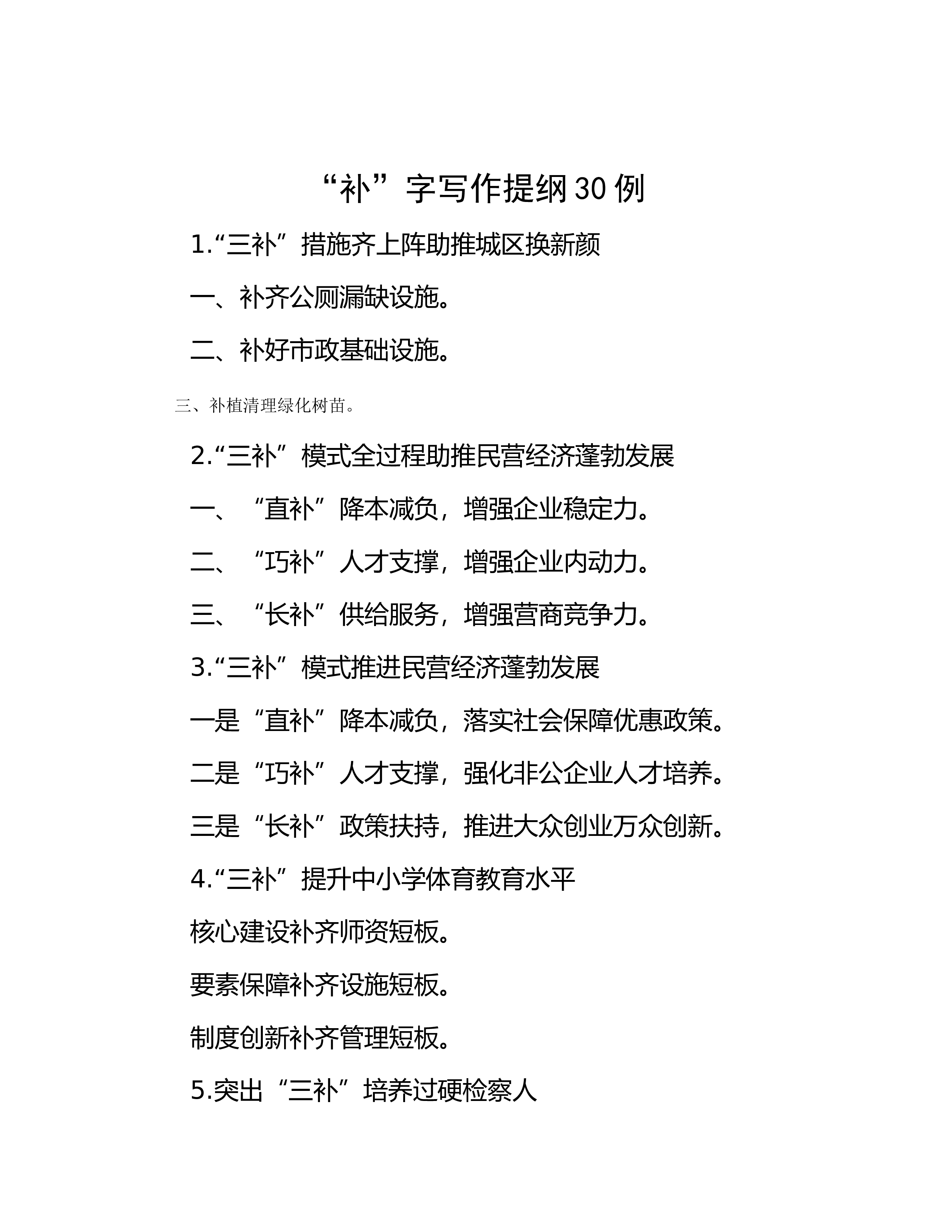 “补”字写作提纲30例1.“三补”措施齐上阵助推城区换新颜一、补齐公厕漏缺设施。二、补好市政基础设施。三、补植清理绿化树苗。2.“三补”模式全过程助推民营经济蓬勃发展一、“直补”降本减负,增强企业稳定力。二、“巧补”人才支撑,增强企业内动力。三、“长补”供给服务,增强营商竞争力。3.“三补”模式推进民营经济蓬勃发展一是“直补”降本减负,落实社会保障优惠政策。二是“巧补”人才支撑,强化非公企业人才培养。三是“长补”政策扶持,推进大众创业万众创新。4.“三补”提升中小学体育教育水平核心建设补齐师资短板。要素保障补齐设施短板。制度创新补齐管理短板。5.突出“三补”培养过硬检察人补精神之“钙质”,培养...