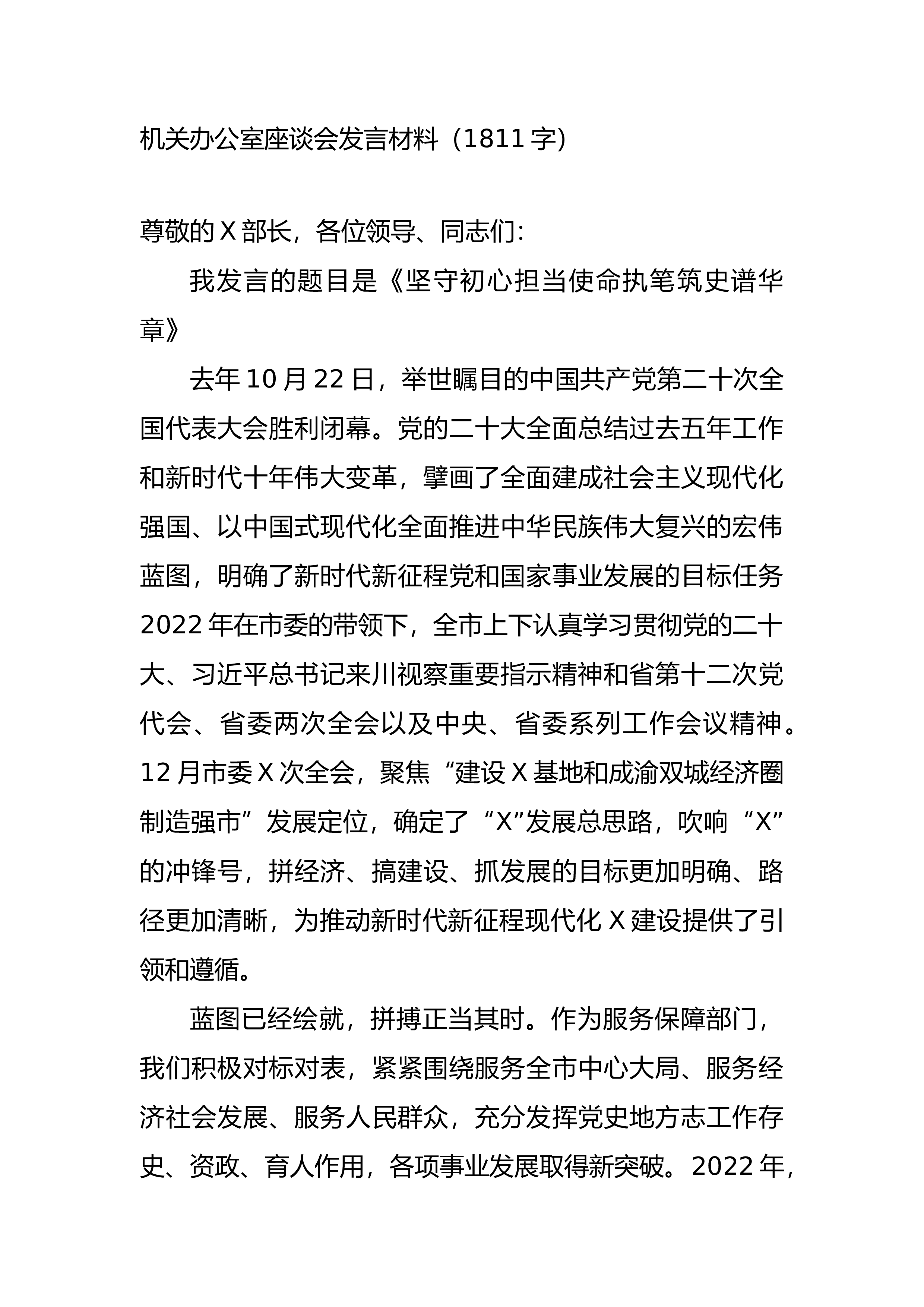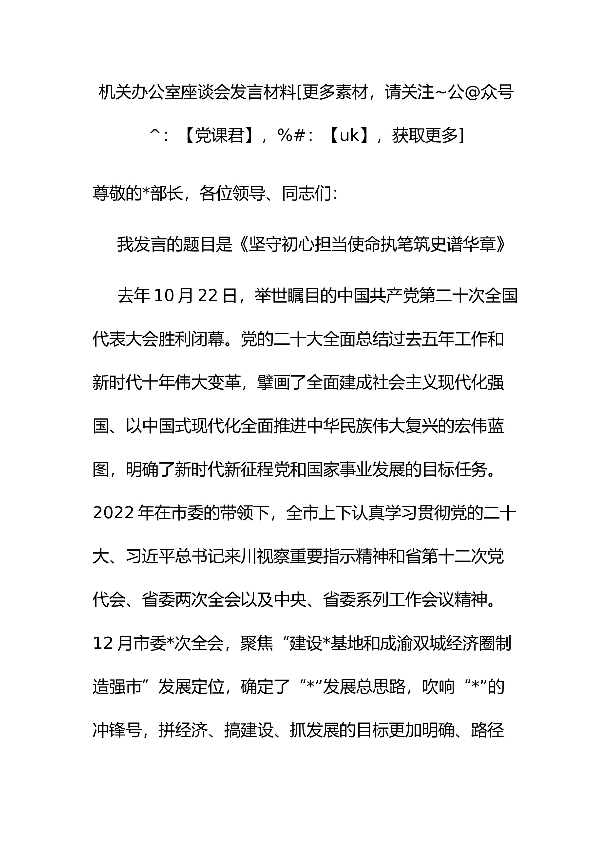机关办公室座谈会发言材料[更多素材,请关注~公@众号^:【党课君】,%#:【uk】,获取更多]尊敬的*部长,各位领导、同志们:我发言的题目是《坚守初心担当使命执笔筑史谱华章》去年10月22日,举世瞩目的中国共产党第二十次全国代表大会胜利闭幕。党的二十大全面总结过去五年工作和新时代十年伟大变革,擘画了全面建成社会主义现代化强国、以中国式现代化全面推进中华民族伟大复兴的宏伟蓝图,明确了新时代新征程党和国家事业发展的目标任务。2022年在市委的带领下,全市上下认真学习贯彻党的二十大、习近平总书记来川视察重要指示精神和省第十二次党代会、省委两次全会以及中央、省委系列工作会议精神。12月市委*次全会,聚...