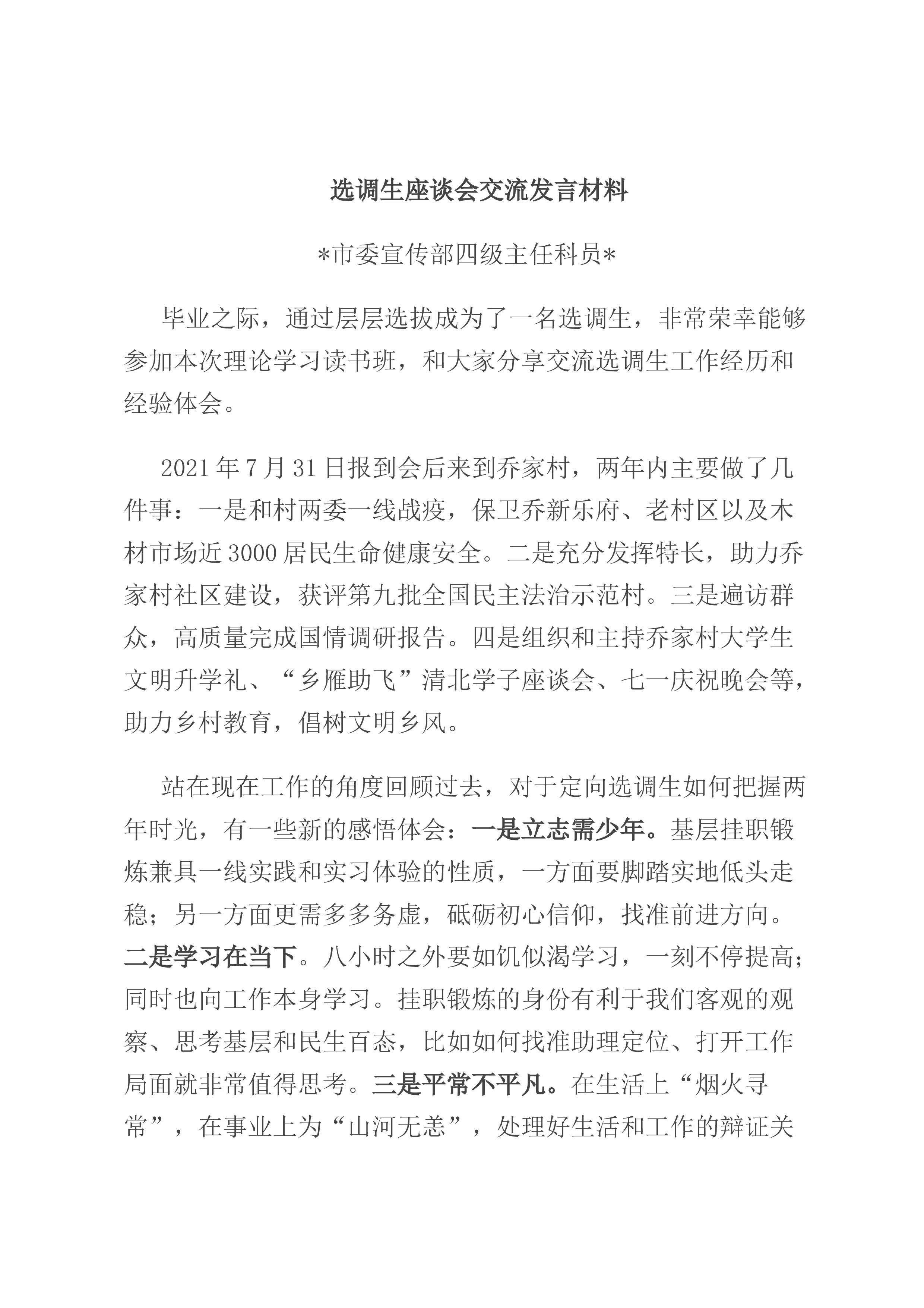 选调生座谈会交流发言材料*市委宣传部四级主任科员*毕业之际,通过层层选拔成为了一名选调生,非常荣幸能够参加本次理论学习读书班,和大家分享交流选调生工作经历和经验体会。2021年7月31日报到会后来到乔家村,两年内主要做了几件事:一是和村两委一线战疫,保卫乔新乐府、老村区以及木材市场近3000居民生命健康安全。二是充分发挥特长,助力乔家村社区建设,获评第九批全国民主法治示范村。三是遍访群众,高质量完成国情调研报告。四是组织和主持乔家村大学生文明升学礼、“乡雁助飞”清北学子座谈会、七一庆祝晚会等,助力乡村教育,倡树文明乡风。站在现在工作的角度回顾过去,对于定向选调生如何把握两年时光,有一些新的感...