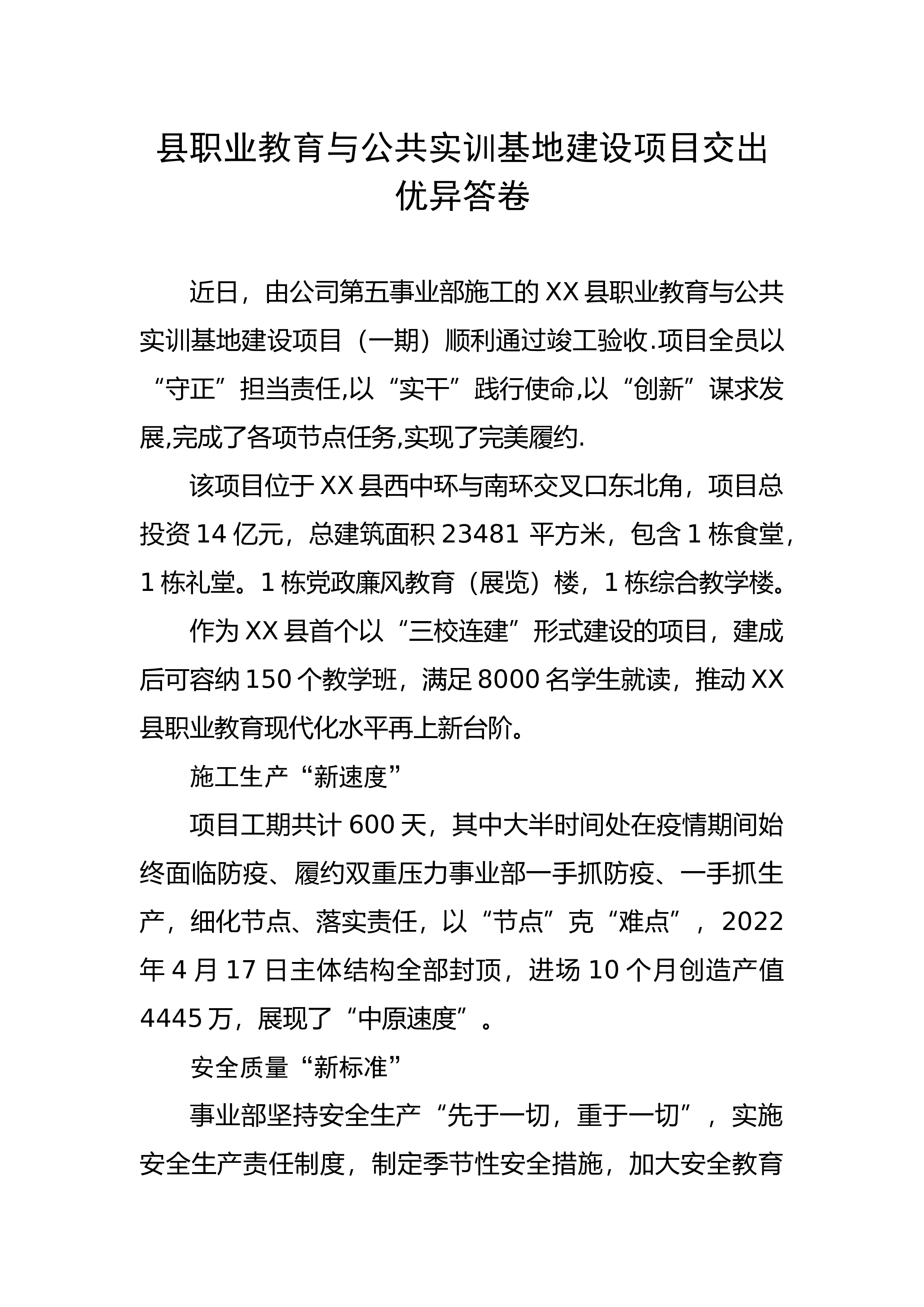 县职业教育与公共实训基地建设项目交出优异答卷近日,由公司第五事业部施工的XX县职业教育与公共实训基地建设项目(一期)顺利通过竣工验收.项目全员以“守正”担当责任,以“实干”践行使命,以“创新”谋求发展,完成了各项节点任务,实现了完美履约.该项目位于XX县西中环与南环交叉口东北角,项目总投资14亿元,总建筑面积23481平方米,包含1栋食堂,1栋礼堂。1栋党政廉风教育(展览)楼,1栋综合教学楼。作为XX县首个以“三校连建”形式建设的项目,建成后可容纳150个教学班,满足8000名学生就读,推动XX县职业教育现代化水平再上新台阶。施工生产“新速度”项目工期共计600天,其中大半时间处在疫情期间始终...