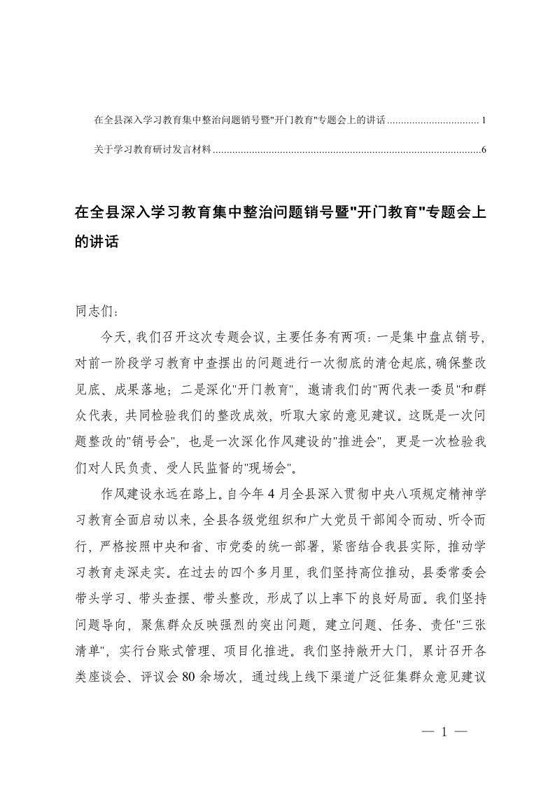 集中整治问题销号暨开门教育专题会上的讲话教育,讲话,