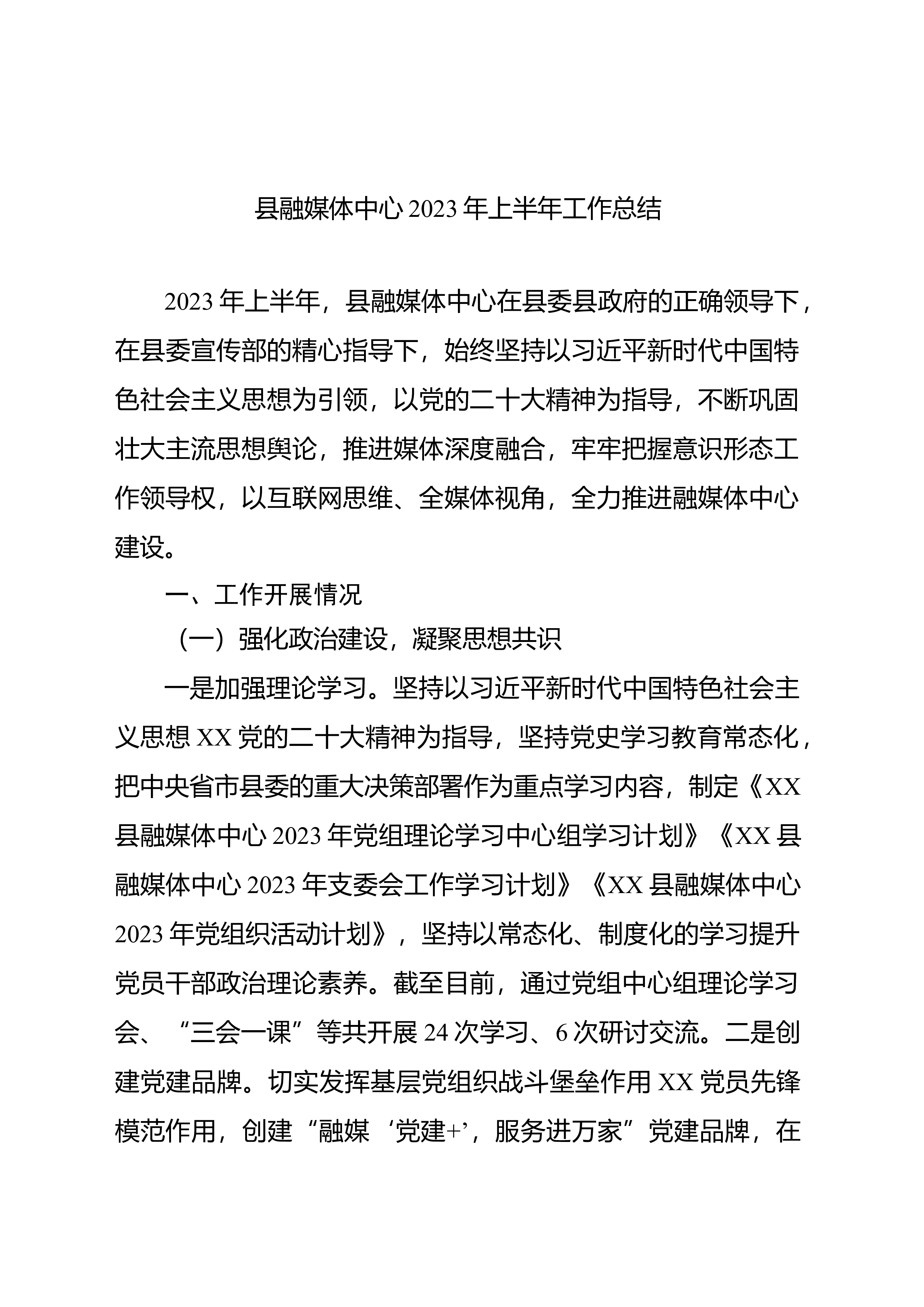 县融媒体中心2023年上半年工作总结2023年上半年,县融媒体中心在县委县政府的正确领导下,在县委宣传部的精心指导下,始终坚持以习近平新时代中国特色社会主义思想为引领,以党的二十大精神为指导,不断巩固壮大主流思想舆论,推进媒体深度融合,牢牢把握意识形态工作领导权,以互联网思维、全媒体视角,全力推进融媒体中心建设。一、工作开展情况(一)强化政治建设,凝聚思想共识一是加强理论学习。坚持以习近平新时代中国特色社会主义思想XX党的二十大精神为指导,坚持党史学习教育常态化,把中央省市县委的重大决策部署作为重点学习内容,制定《XX县融媒体中心2023年党组理论学习中心组学习计划》《XX县融媒体中心2023...