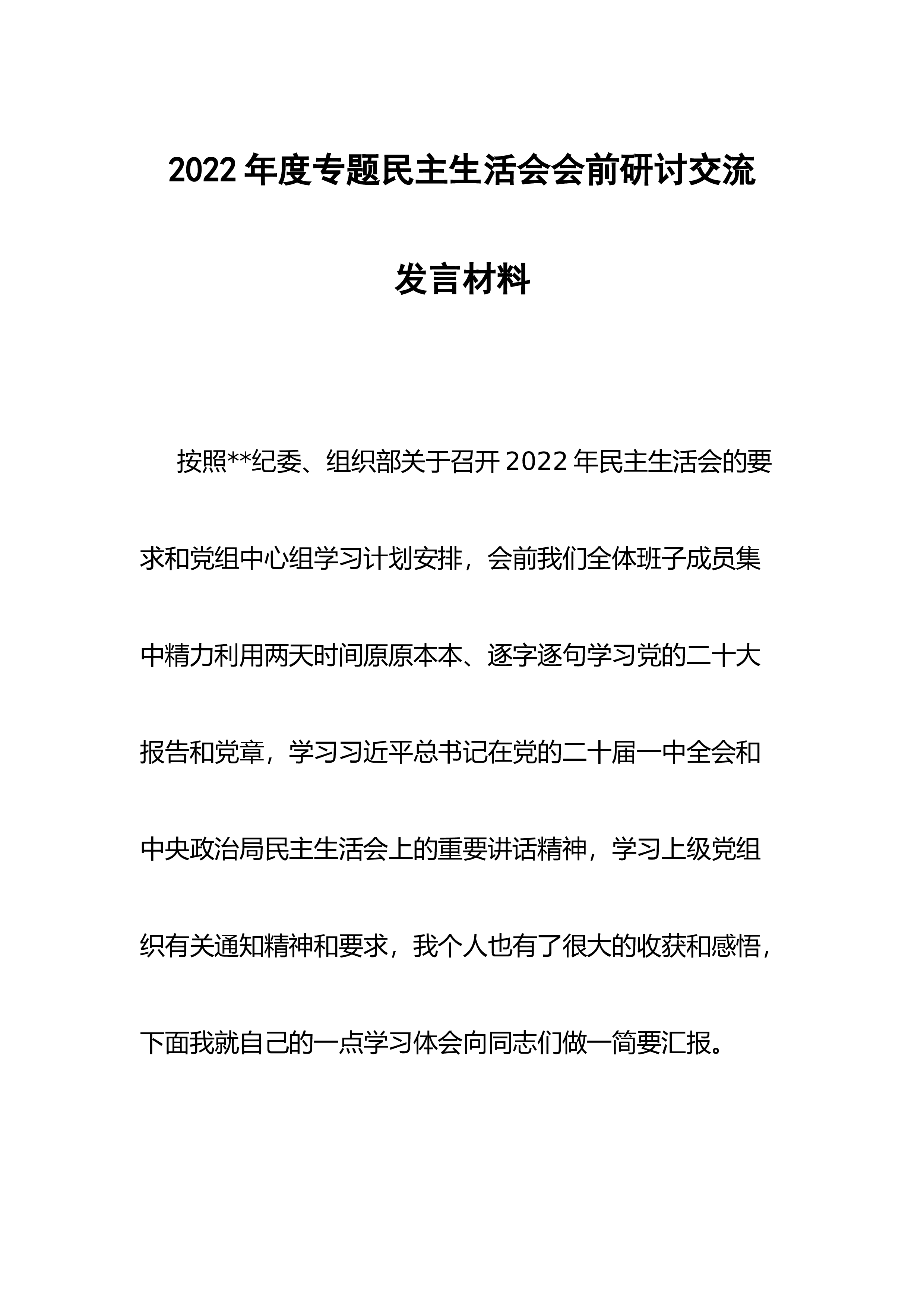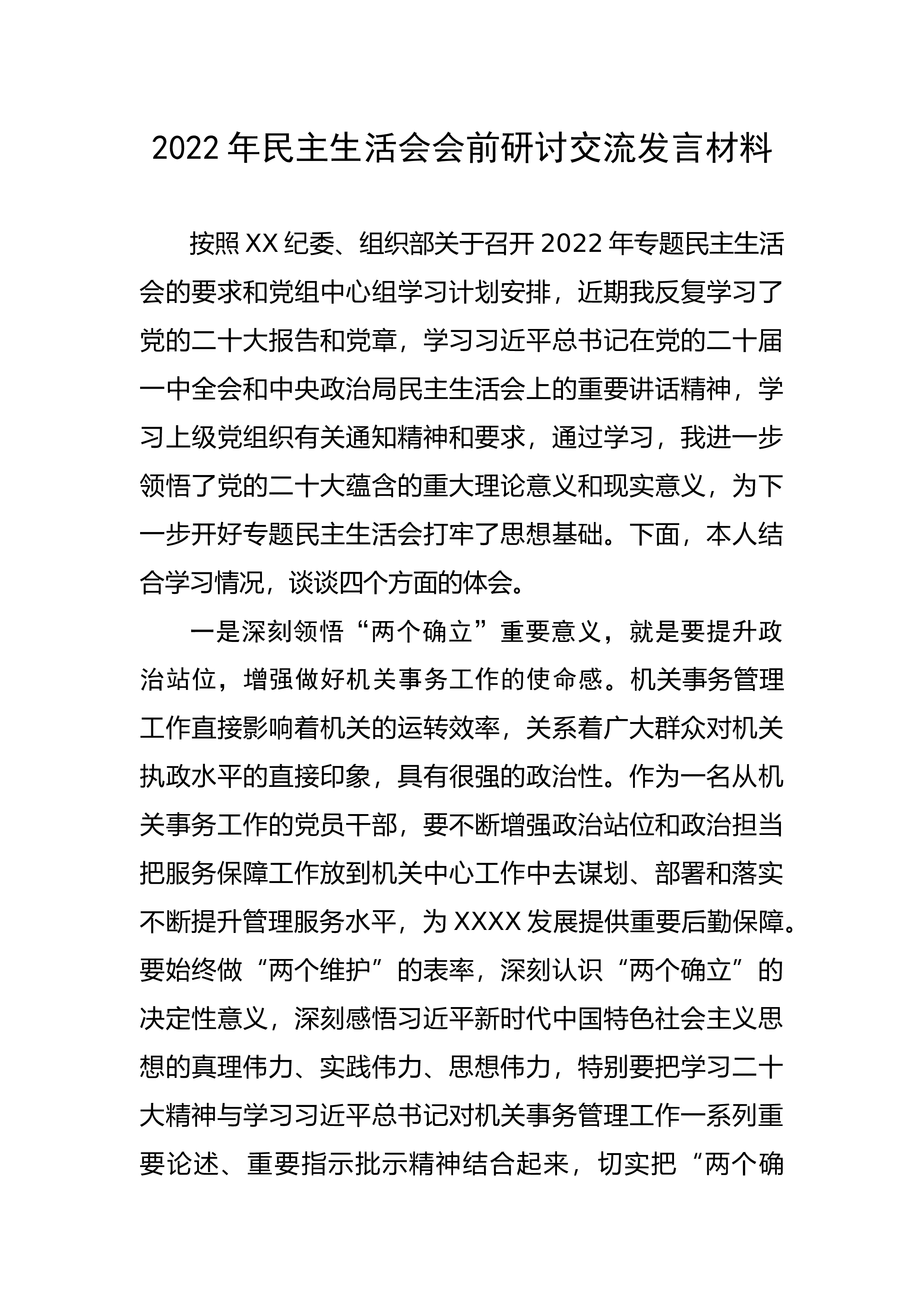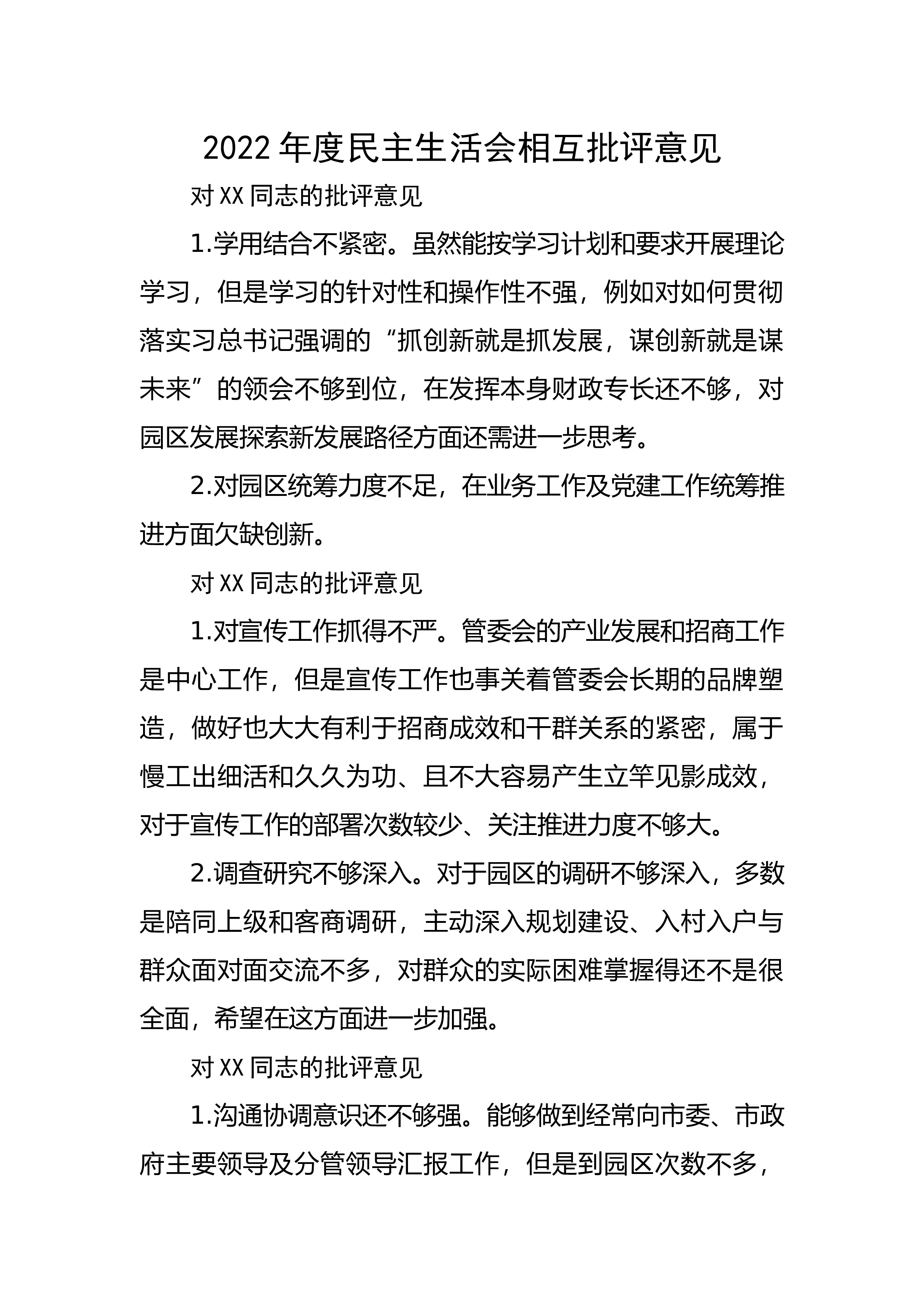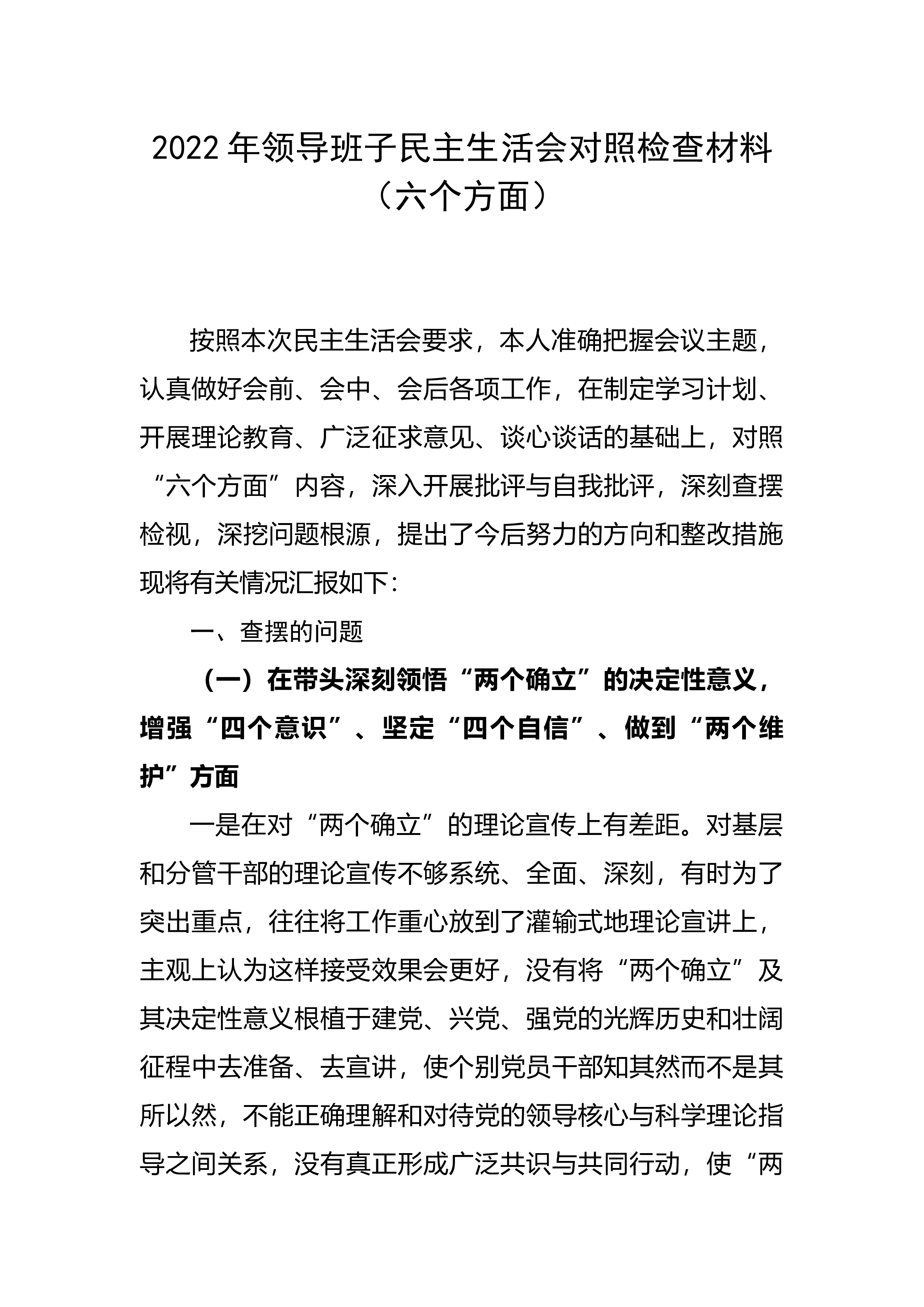 2022年领导班子民主生活会对照检查材料(六个方面)按照本次民主生活会要求,本人准确把握会议主题,认真做好会前、会中、会后各项工作,在制定学习计划、开展理论教育、广泛征求意见、谈心谈话的基础上,对照“六个方面”内容,深入开展批评与自我批评,深刻查摆检视,深挖问题根源,提出了今后努力的方向和整改措施现将有关情况汇报如下:一、查摆的问题(一)在带头深刻领悟“两个确立”的决定性意义,增强“四个意识”、坚定“四个自信”、做到“两个维护”方面一是在对“两个确立”的理论宣传上有差距。对基层和分管干部的理论宣传不够系统、全面、深刻,有时为了突出重点,往往将工作重心放到了灌输式地理论宣讲上,主观上认为这样接受...