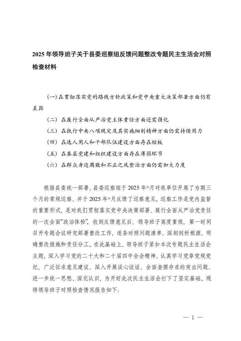 从严治党,民主生活会,对照检查材料,对照检查,巡察,领导班子,主体责任,巡察组,全面从严治党,反馈问题,县委,责任,生活,方针政策,贯彻落实,专题民主生活会,重大决策,专题,材料在贯彻落实党的路线方针政策和党中央重大决策部署方面仍有差距在履行全面从严治党主体责任方面还需强化2025年领导班子关于县委巡察组反馈问题整改专题民主生活会对照检查材料从严治党,民主生活会,对照检查材料,对照检查,巡察,领导班子,主体责任,巡察组,全面从严治党,反馈问题,县委,责任,生活,方针政策,贯彻落实,专题民主生活会,重大决策,专题,材料在贯彻落实党的路线方针政策和党中央重大决策部署方面仍有差距在履行全面从严治党主体责任方面还需强化2025年领导班子关于县委巡察组反馈问题整改专题民主生活会对照检查材料
