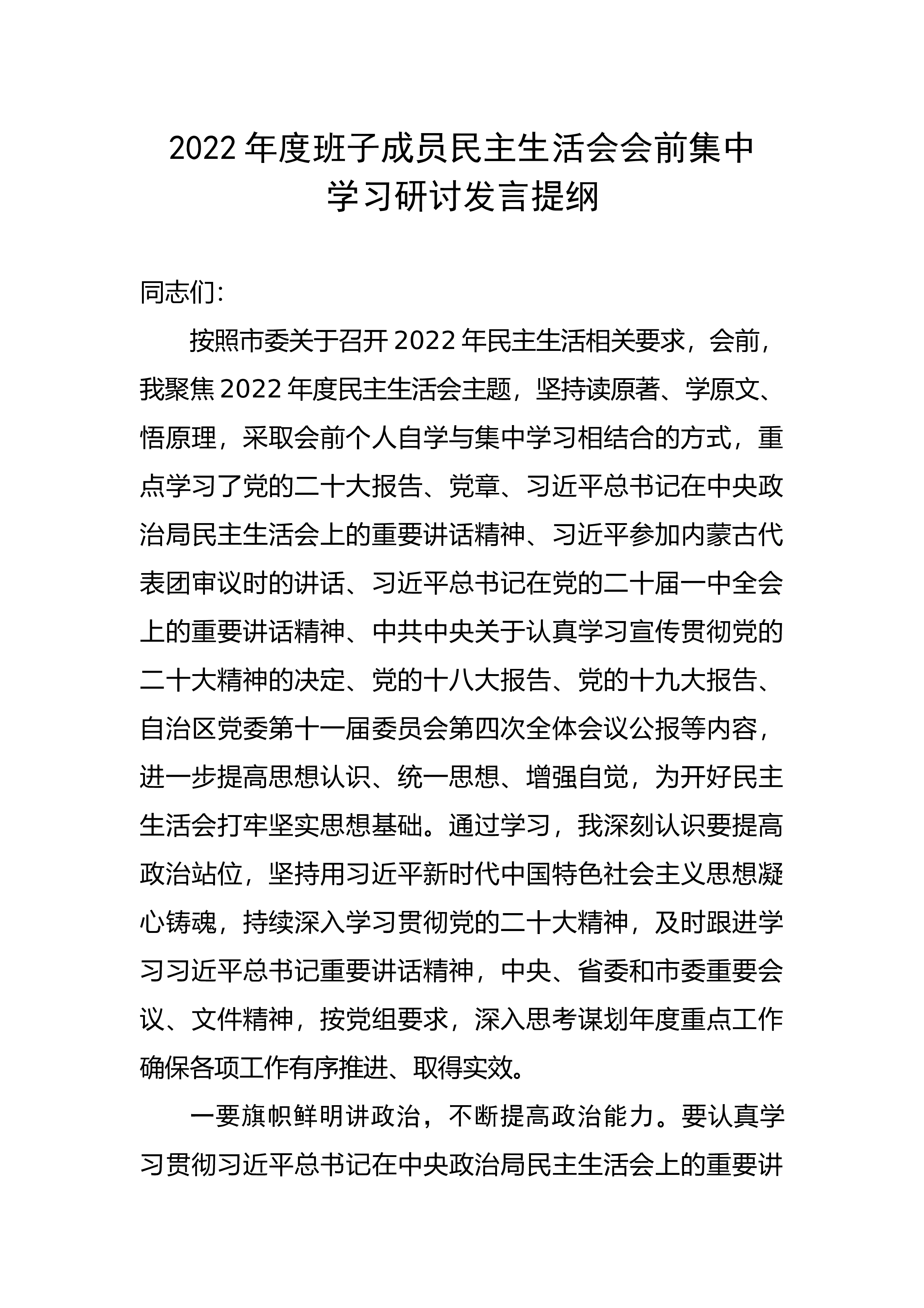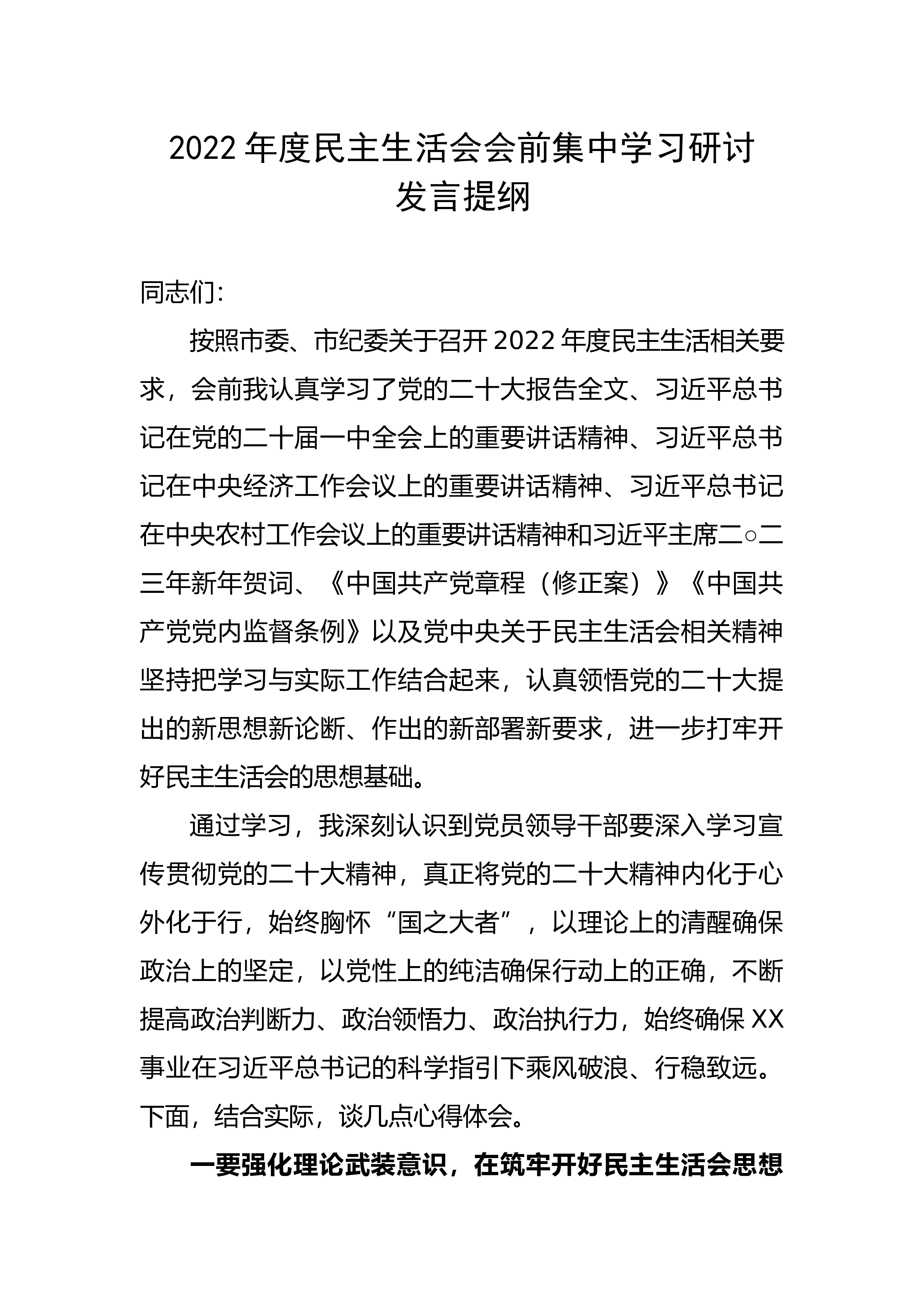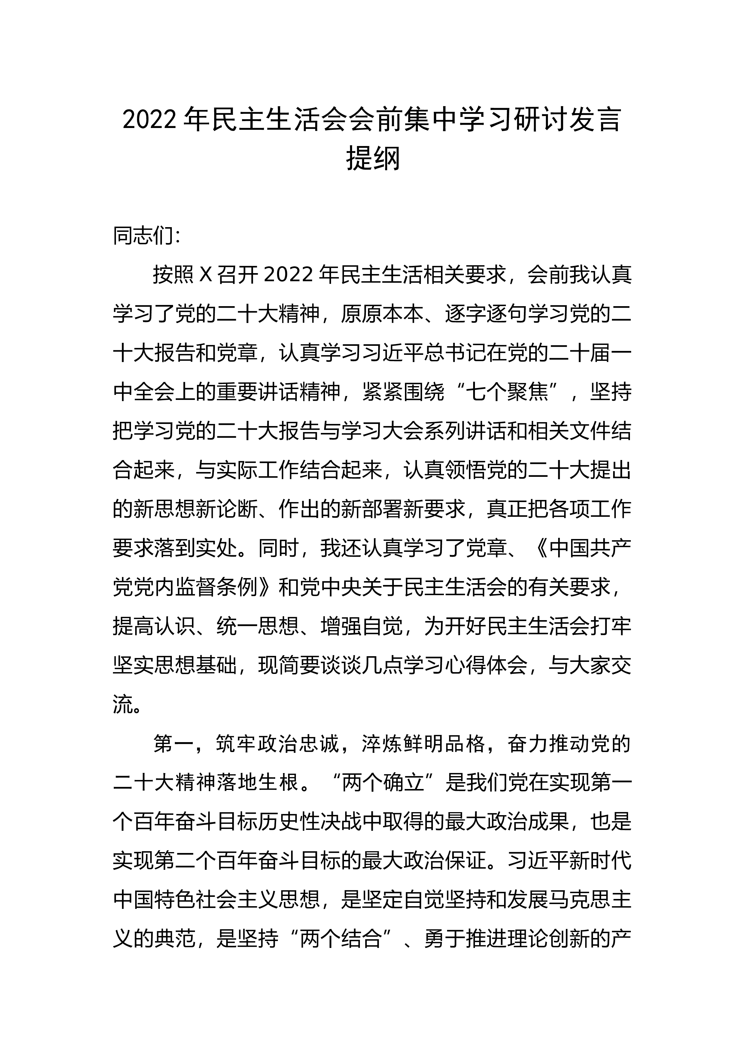 2022年民主生活会会前集中学习研讨发言提纲同志们:按照X召开2022年民主生活相关要求,会前我认真学习了党的二十大精神,原原本本、逐字逐句学习党的二十大报告和党章,认真学习习近平总书记在党的二十届一中全会上的重要讲话精神,紧紧围绕“七个聚焦”,坚持把学习党的二十大报告与学习大会系列讲话和相关文件结合起来,与实际工作结合起来,认真领悟党的二十大提出的新思想新论断、作出的新部署新要求,真正把各项工作要求落到实处。同时,我还认真学习了党章、《中国共产党党内监督条例》和党中央关于民主生活会的有关要求,提高认识、统一思想、增强自觉,为开好民主生活会打牢坚实思想基础,现简要谈谈几点学习心得体会,与大家交...