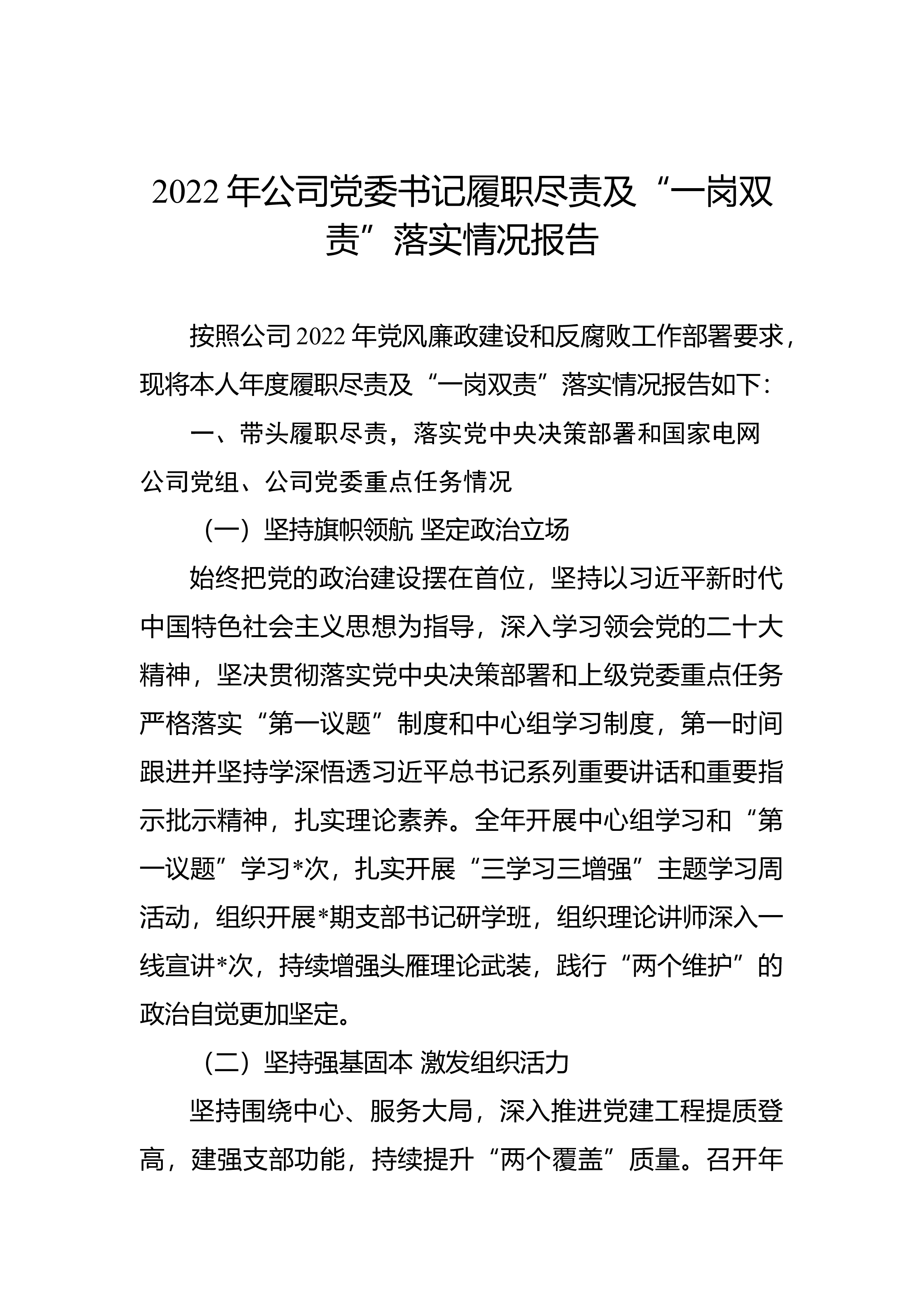 2022年度公司党委领导班子述职报告2022年,面对疫情、安全压力及经营亏损等多重风险挑战和国际国内严峻复杂的发展形势,x公司在集团公司强有力的领导下,全面贯彻落实习近平新时代中国特色社会主义思想和党的二十大精神,深刻领悟“两个确立”决定性意义,切实增强“四个意识”、坚定“四个自信”、做到“两个维护”,不断提高政治判断力、政治领悟力、政治执行力,认真履行“一岗双责”,严守政治纪律,恪守党性党风,克服了疫情反复、市场低迷、主辅业下滑、收入骤降、安全压力增大等重重困难,全力完成了年初各项任务目标。一、注重班子建设,努力增强合力,为x公司高质量发展提供组织保证一年来,x公司领导班子坚持把党的政治建设...