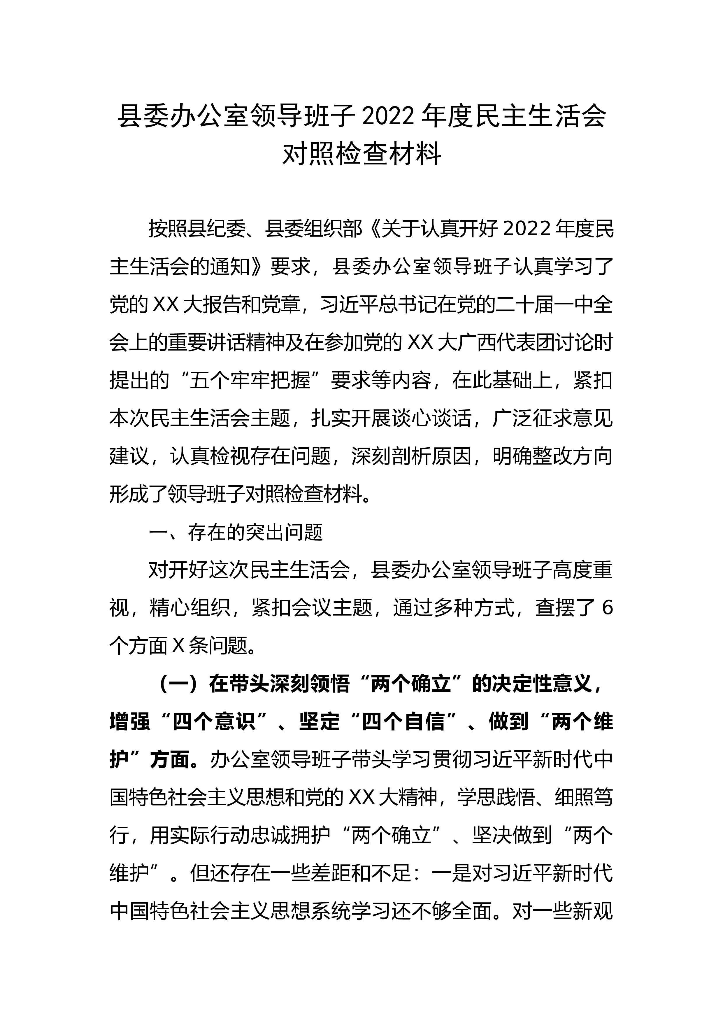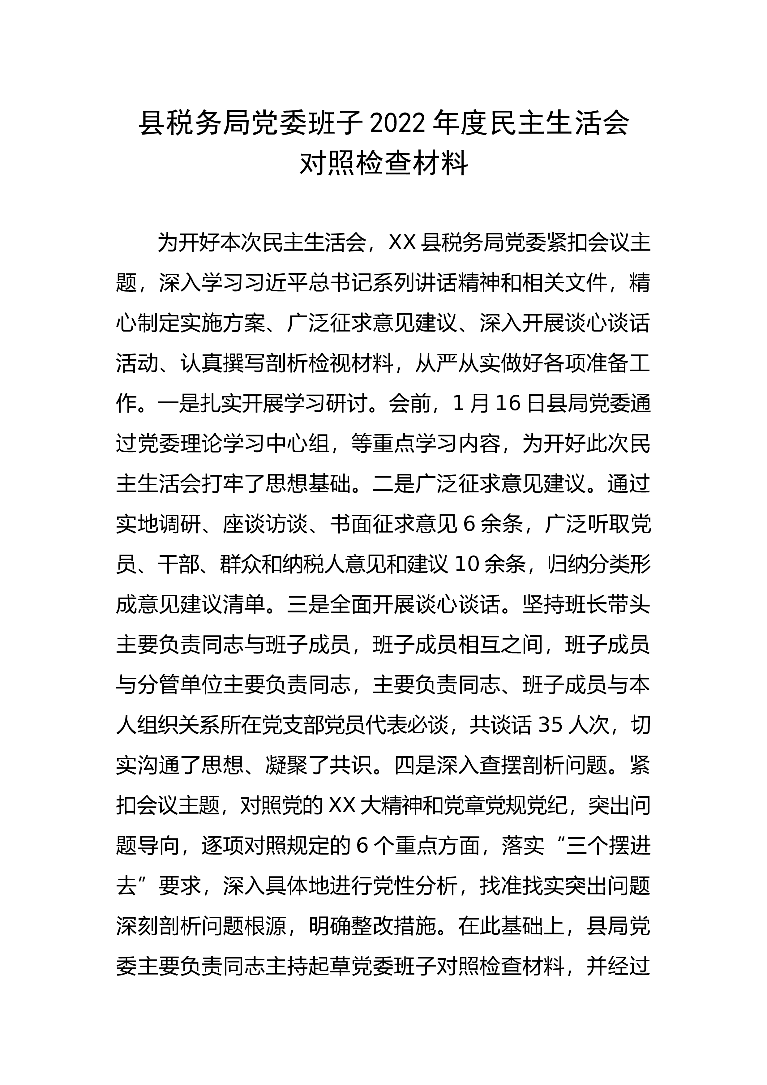 县住建局局长2022年度民主生活会个人对照检查材料根据中央和省市县委关于开好2022年度党员领导干部民主生活会的部署要求,结合个人思想实际、工作实际、作风实际,通过多种形式征求意见建议,广泛开展谈心谈话,认真查找了自己存在的差距和不足,深刻进行了党性分析和自我剖析,分析了问题存在的原因,明确了今后的整改方向,现将个人对照检查情况汇报如下。一、上年度问题整改情况对2021年度民主生活会上梳理出的理论学习不深入、价值观念有偏差、服务群众意识不强、工作创新不足等XX个方面XX条问题,我逐项建立了整改任务台账,及时制定了整改措施,并坚持把各类问题的整改与住房和城乡建设工作重点任务结合起来,切实把整改转...
