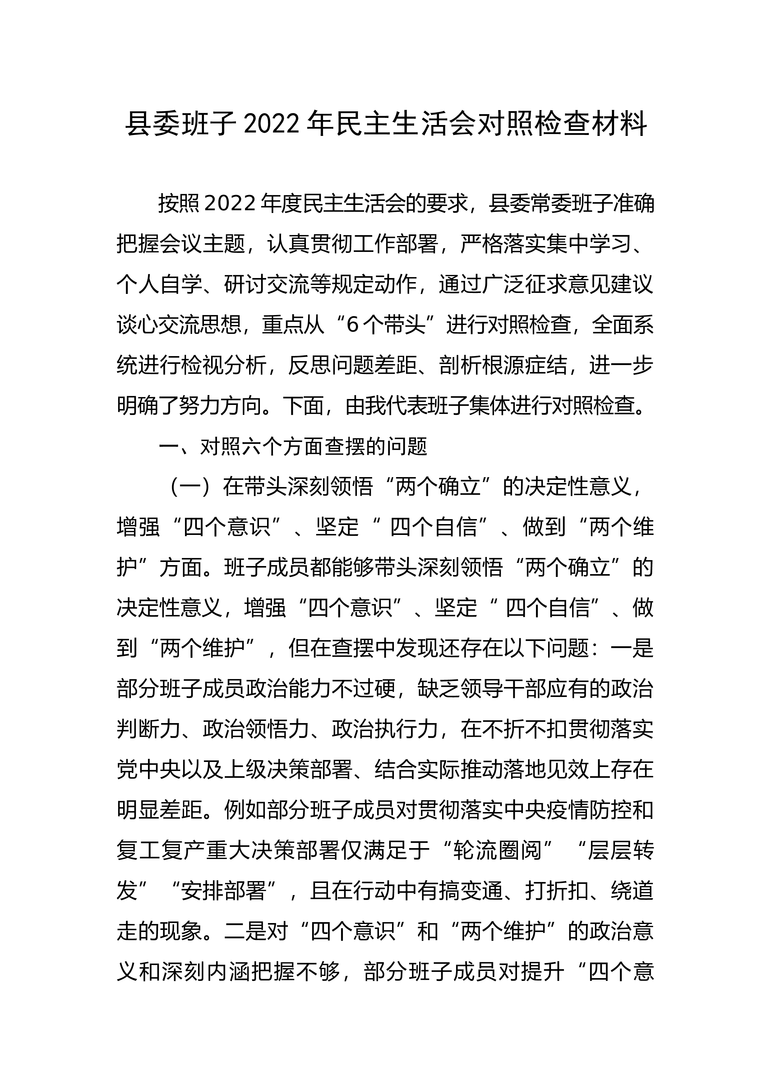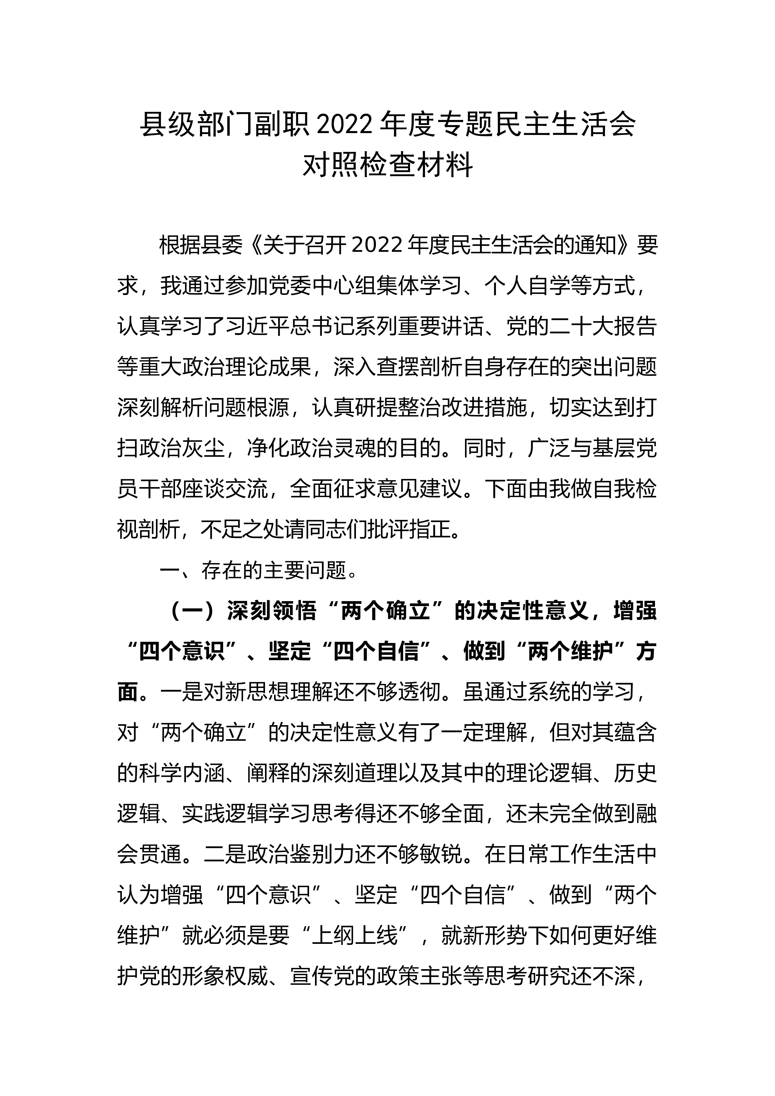 【民主生活会】县住建局局长2022年度民主生活会个人对照检查材料