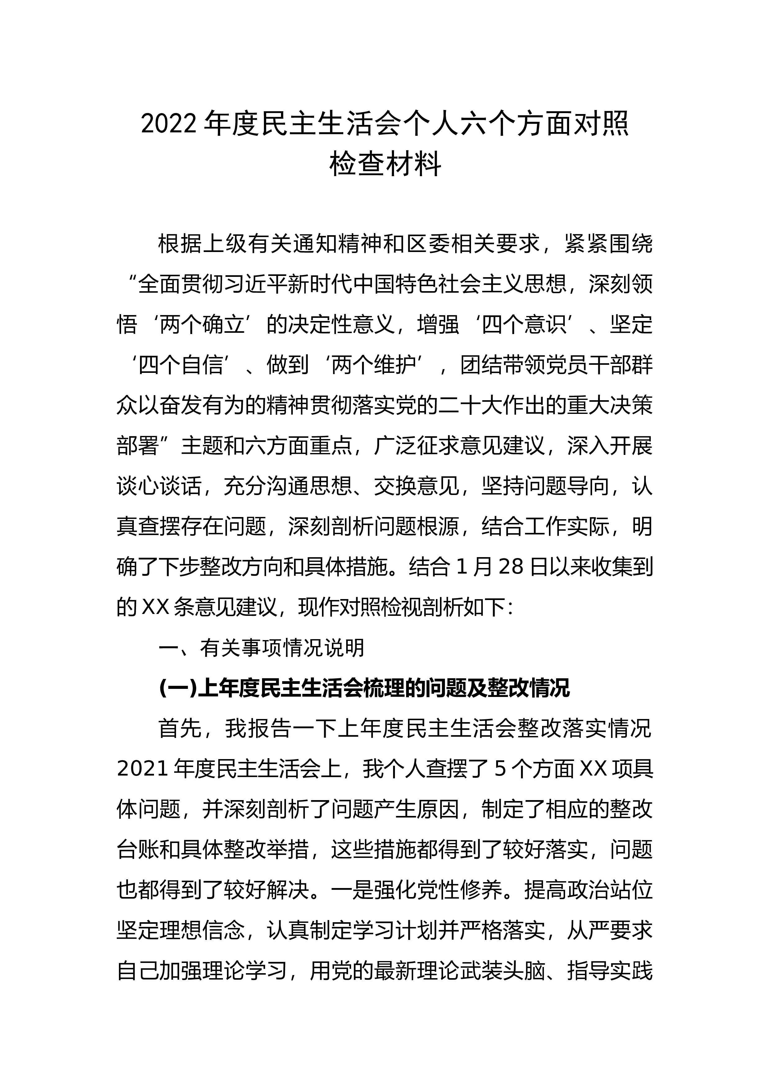 【民主生活会】2022年度乡党委班子六个带头民主生活会检视剖析材料