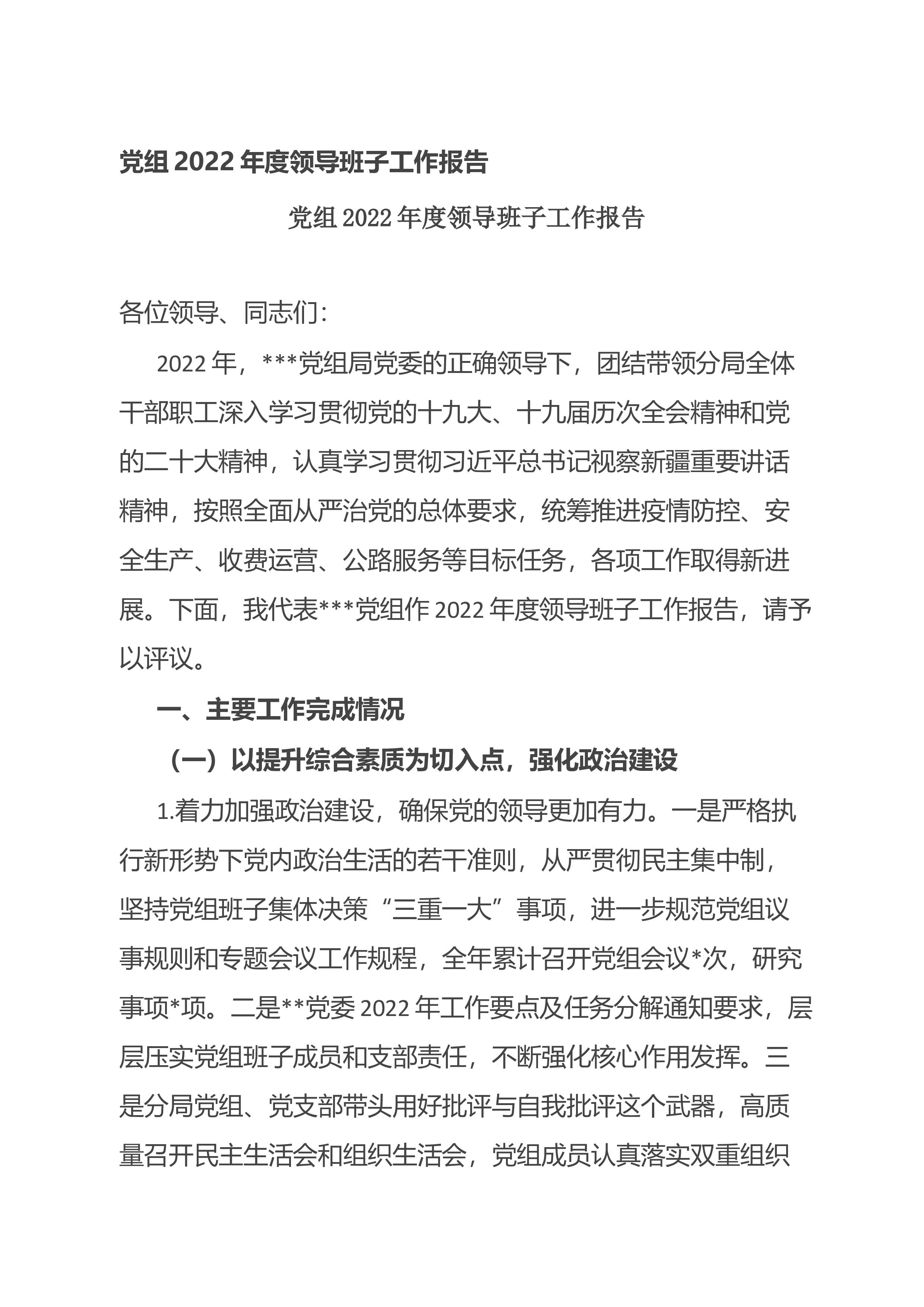 党组2022年度领导班子工作报告党组2022年度领导班子工作报告各位领导、同志们:2022年,***党组局党委的正确领导下,团结带领分局全体干部职工深入学习贯彻党的十九大、十九届历次全会精神和党的二十大精神,认真学习贯彻习近平总书记视察新疆重要讲话精神,按照全面从严治党的总体要求,统筹推进疫情防控、安全生产、收费运营、公路服务等目标任务,各项工作取得新进展。下面,我代表***党组作2022年度领导班子工作报告,请予以评议。一、主要工作完成情况 (一)以提升综合素质为切入点,强化政治建设1.着力加强政治建设,确保党的领导更加有力。一是严格执行新形势下党内政治生活的若干准则,从严贯彻民主集中...