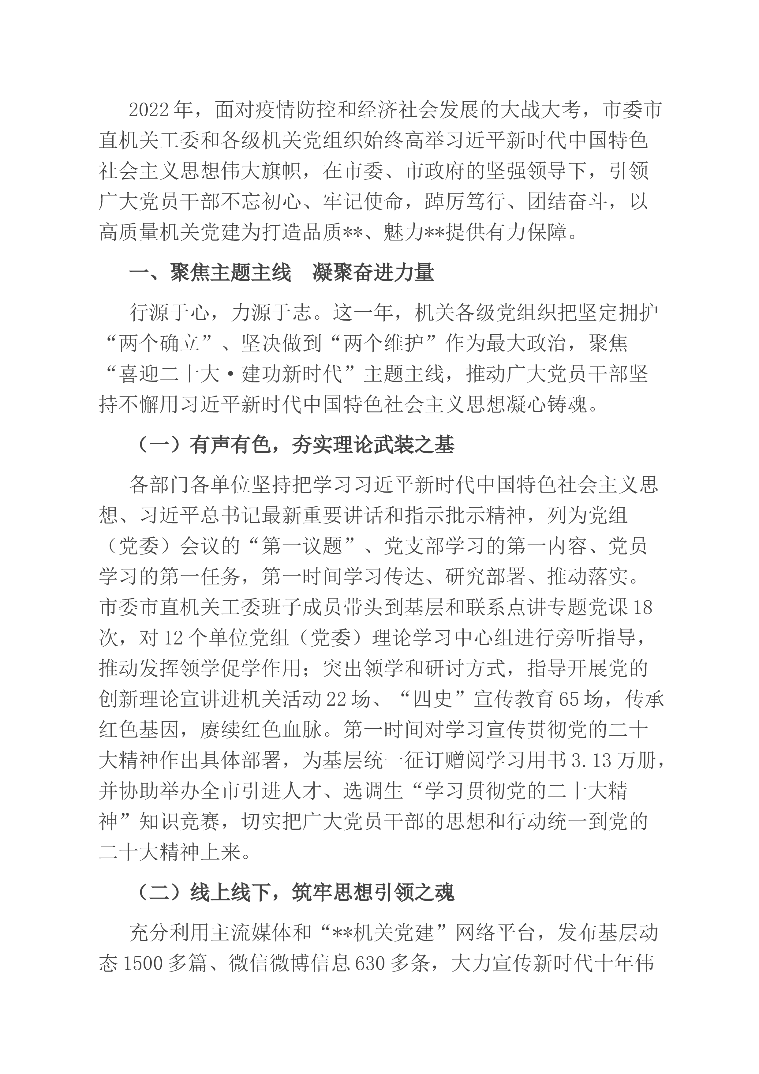 党课讲稿:高擎党旗担使命,问题导向践初心,坚定不移迈出高质量发展新步伐同志们:大家好!由于疫情防控需要,我们今天的党课采取视频在线形式进行。特殊时期特殊形式,更能凸显本次党课的重要意义。本次党课是党的二十大后,市公司党委首次召开的解读宣讲会,对贯彻落实党的二十大精神至关重要。10月25日,习近平总书记在主持中共中央政治局第一次集体学习时要求,全党要在全面学习、全面把握、全面落实上下功夫,坚定不移把党的二十大提出的目标任务落到实处,奋力夺取全面建设社会主义现代化国家新胜利。知其所来,识其所在,明其将往。习近平总书记对学习二十大精神的重要指示,是全市系统理解学习贯彻执行二十大精神的总体要求和重要遵...