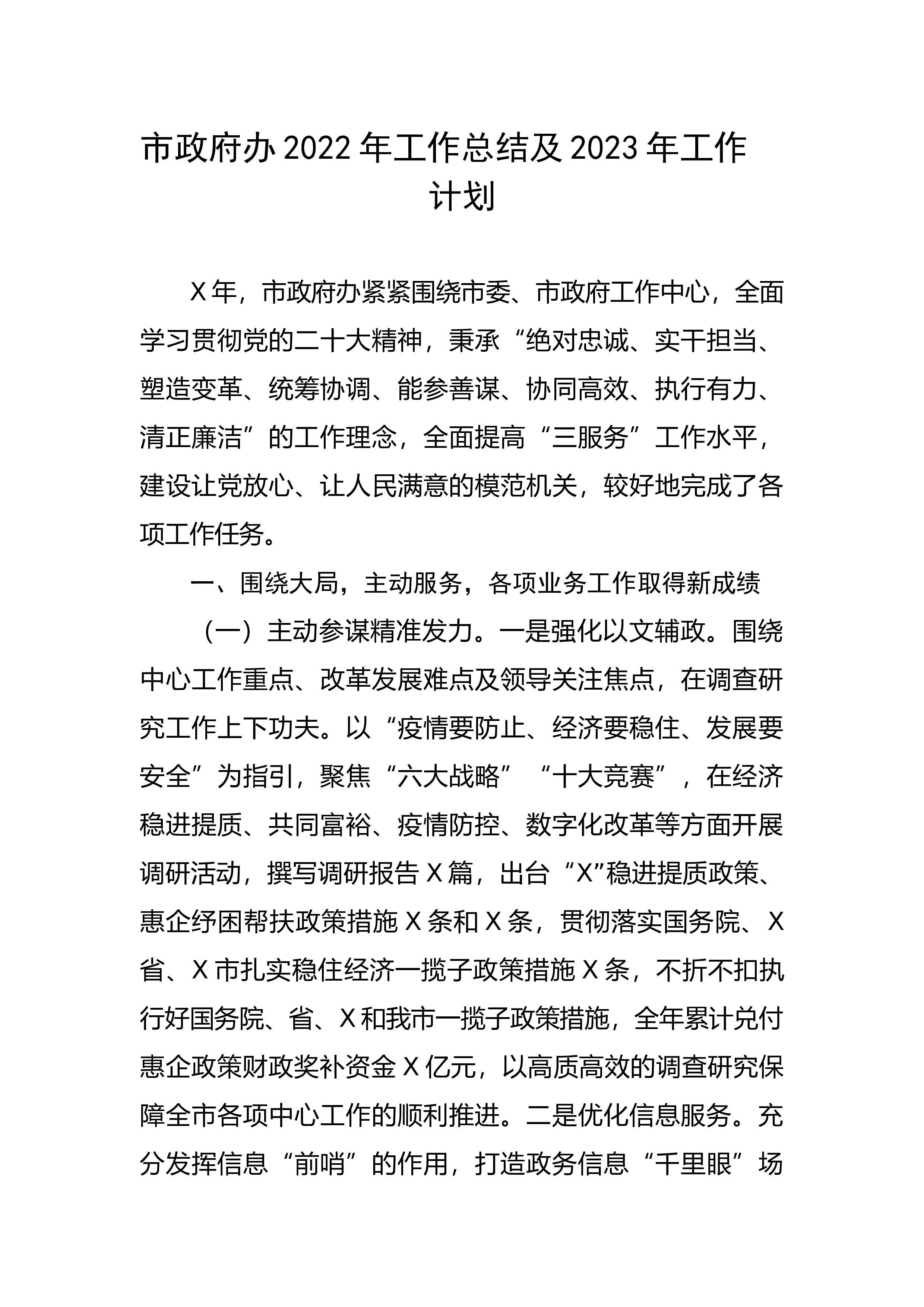 市政府办2022年工作总结及2023年工作计划X年,市政府办紧紧围绕市委、市政府工作中心,全面学习贯彻党的二十大精神,秉承“绝对忠诚、实干担当、塑造变革、统筹协调、能参善谋、协同高效、执行有力、清正廉洁”的工作理念,全面提高“三服务”工作水平,建设让党放心、让人民满意的模范机关,较好地完成了各项工作任务。一、围绕大局,主动服务,各项业务工作取得新成绩(一)主动参谋精准发力。一是强化以文辅政。围绕中心工作重点、改革发展难点及领导关注焦点,在调查研究工作上下功夫。以“疫情要防止、经济要稳住、发展要安全”为指引,聚焦“六大战略”“十大竞赛”,在经济稳进提质、共同富裕、疫情防控、数字化改革等方面开展调...