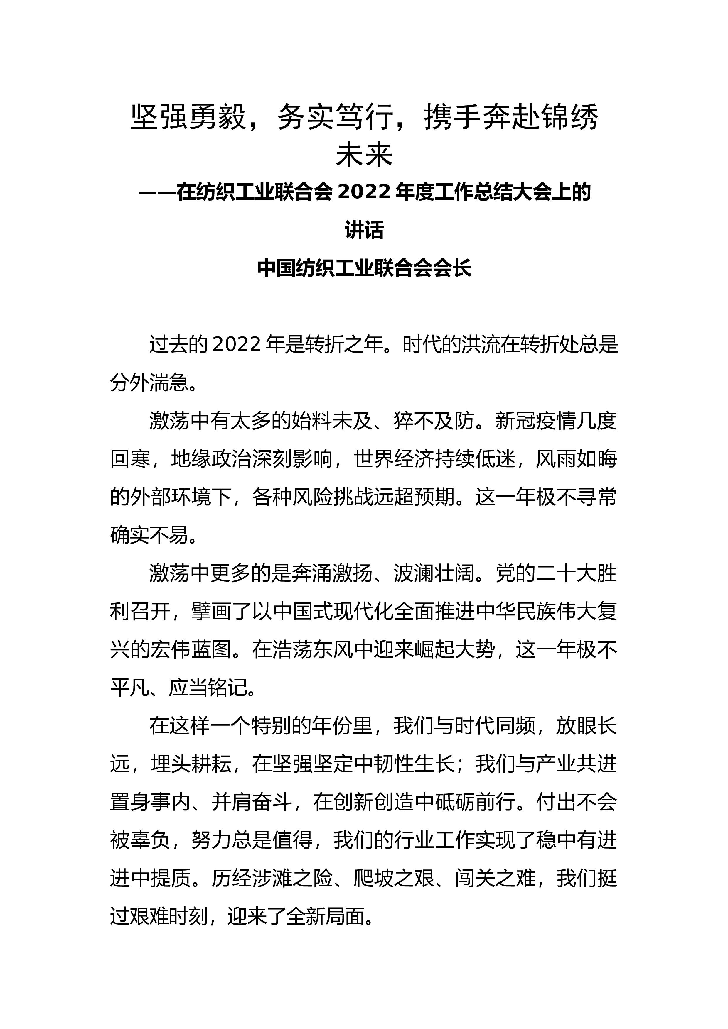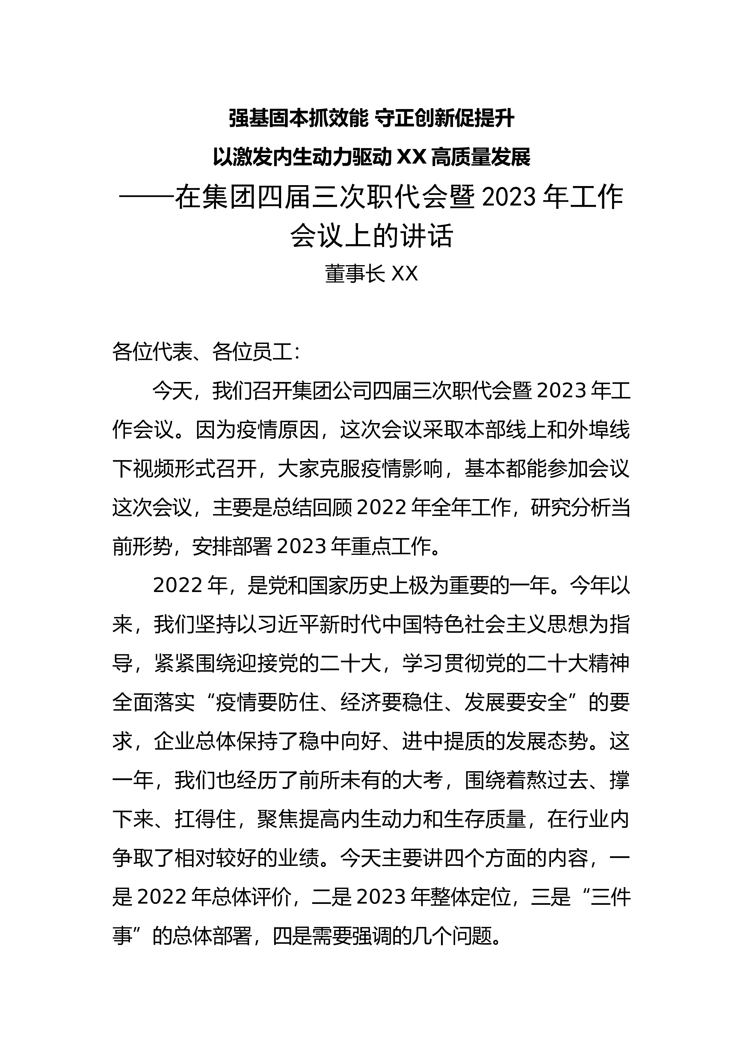 改革创新积蓄动能拼搏进取开创新局为实现公司高质量发展而努力奋斗——在公司十一届六次职代会及2023年工作会上的讲话(摘要)XX集团党委书记、董事长各位代表、同志们:大家好!本次会议是在公司贯彻落实党的二十大精神,奋进新征程的背景下召开的一次重要会议。会议对贯彻落实党的二十大精神,准确把握形势任务,凝聚发展奋进力量,推动2023年各项目标任务落实,加快公司高质量发展具有重要的现实意义和指导意义。2022年,是公司生产经营持续向好的一年。一年来,公司严格贯彻落实党中央“疫情要防住、经济要稳住、发展要安全”的总要求,牢牢把握市场机遇,紧紧围绕年初目标不动摇,全力以赴促发展、提效益、控风险、保稳定,整...