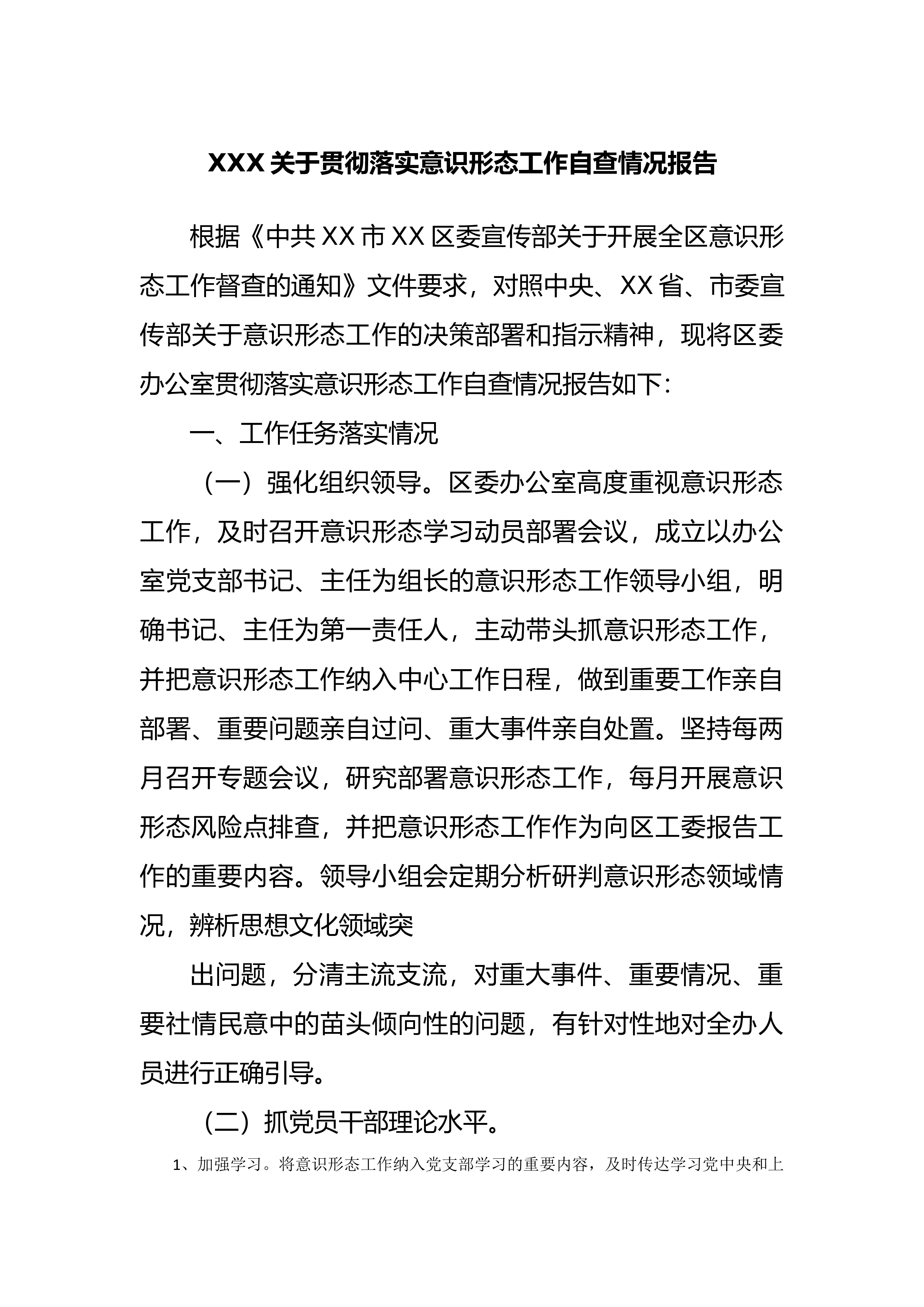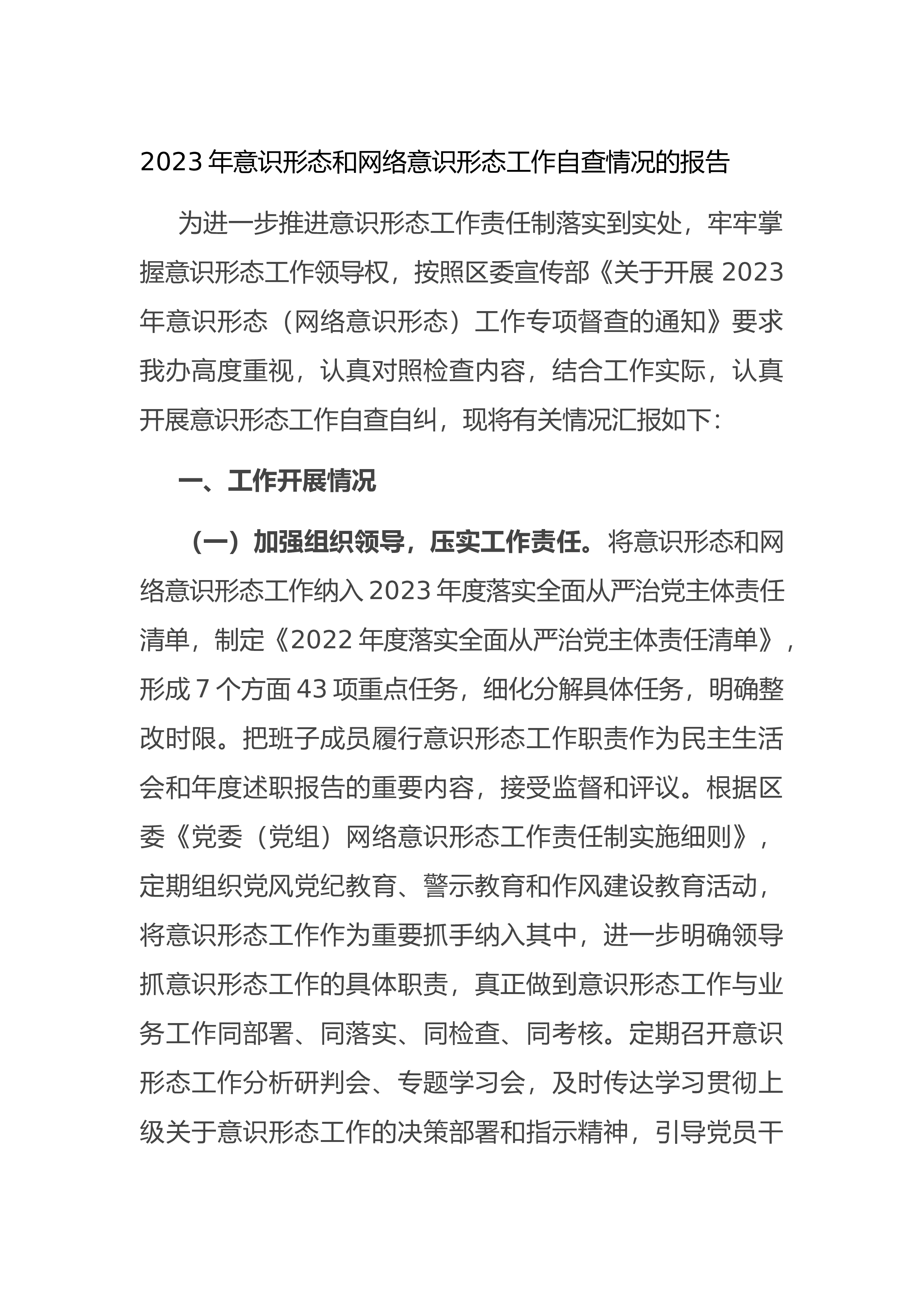 关于2023年意识形态和网络意识形态工作自查情况的报告为进一步推进意识形态工作责任制落实到实处,牢牢掌握意识形态工作领导权,按照区委宣传部《关于开展2023年意识形态(网络意识形态)工作专项督查的通知》要求,我办高度重视,认真对照检查内容,结合工作实际,认真开展意识形态工作自查自纠,现将有关情况汇报如下:一、工作开展情况(一)加强组织领导,压实工作责任。将意识形态和网络意识形态工作纳入2023年度落实全面从严治党主体责任清单,制定《2022年度落实全面从严治党主体责任清单》,形成7个方面43项重点任务,细化分解具体任务,明确整改时限。把班子成员履行意识形态工作职责作为民主生活会和年度述职报告的...