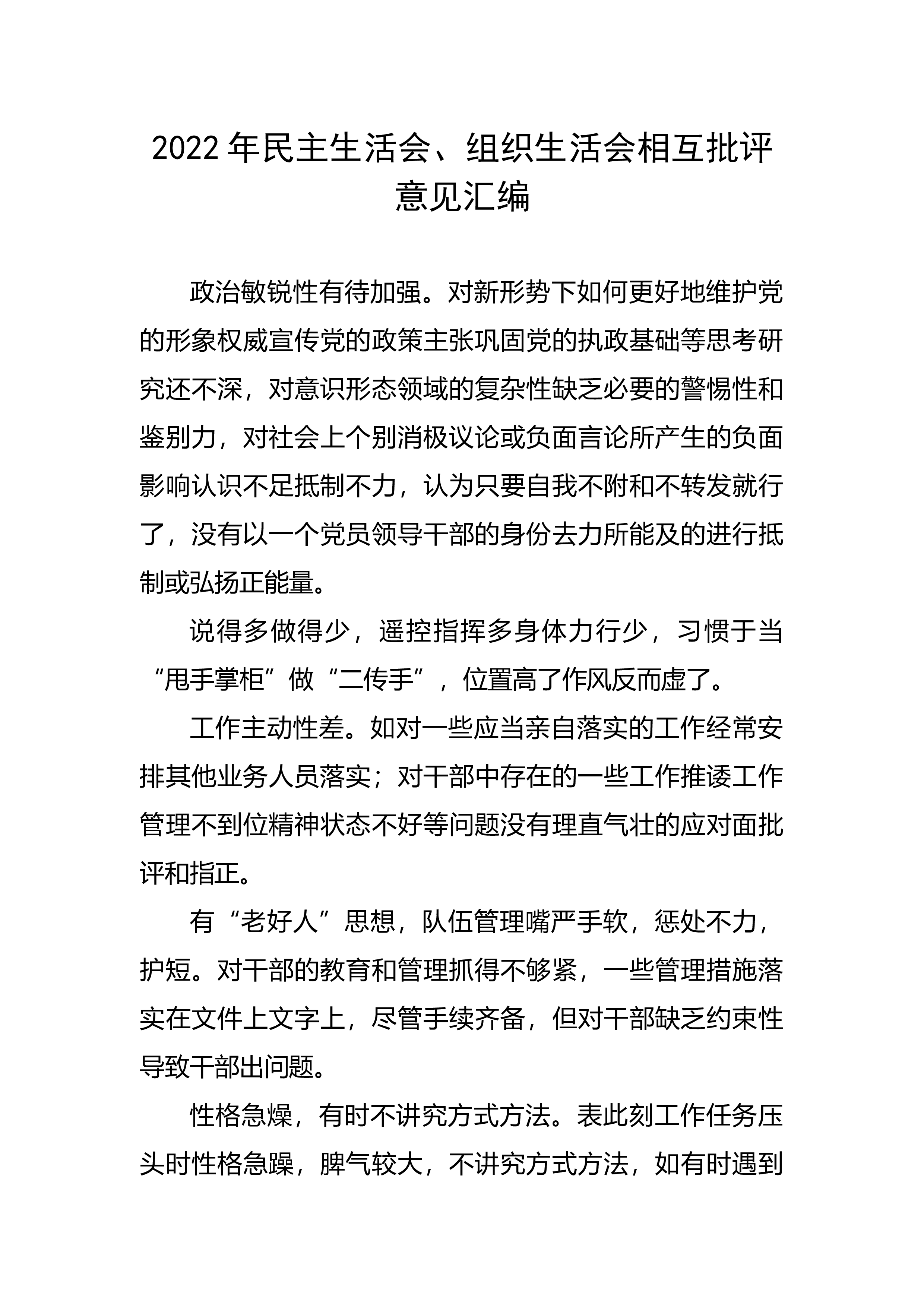 2022年民主生活会、组织生活会相互批评意见汇编政治敏锐性有待加强。对新形势下如何更好地维护党的形象权威宣传党的政策主张巩固党的执政基础等思考研究还不深,对意识形态领域的复杂性缺乏必要的警惕性和鉴别力,对社会上个别消极议论或负面言论所产生的负面影响认识不足抵制不力,认为只要自我不附和不转发就行了,没有以一个党员领导干部的身份去力所能及的进行抵制或弘扬正能量。说得多做得少,遥控指挥多身体力行少,习惯于当“甩手掌柜”做“二传手”,位置高了作风反而虚了。工作主动性差。如对一些应当亲自落实的工作经常安排其他业务人员落实;对干部中存在的一些工作推诿工作管理不到位精神状态不好等问题没有理直气壮的应对面批评...