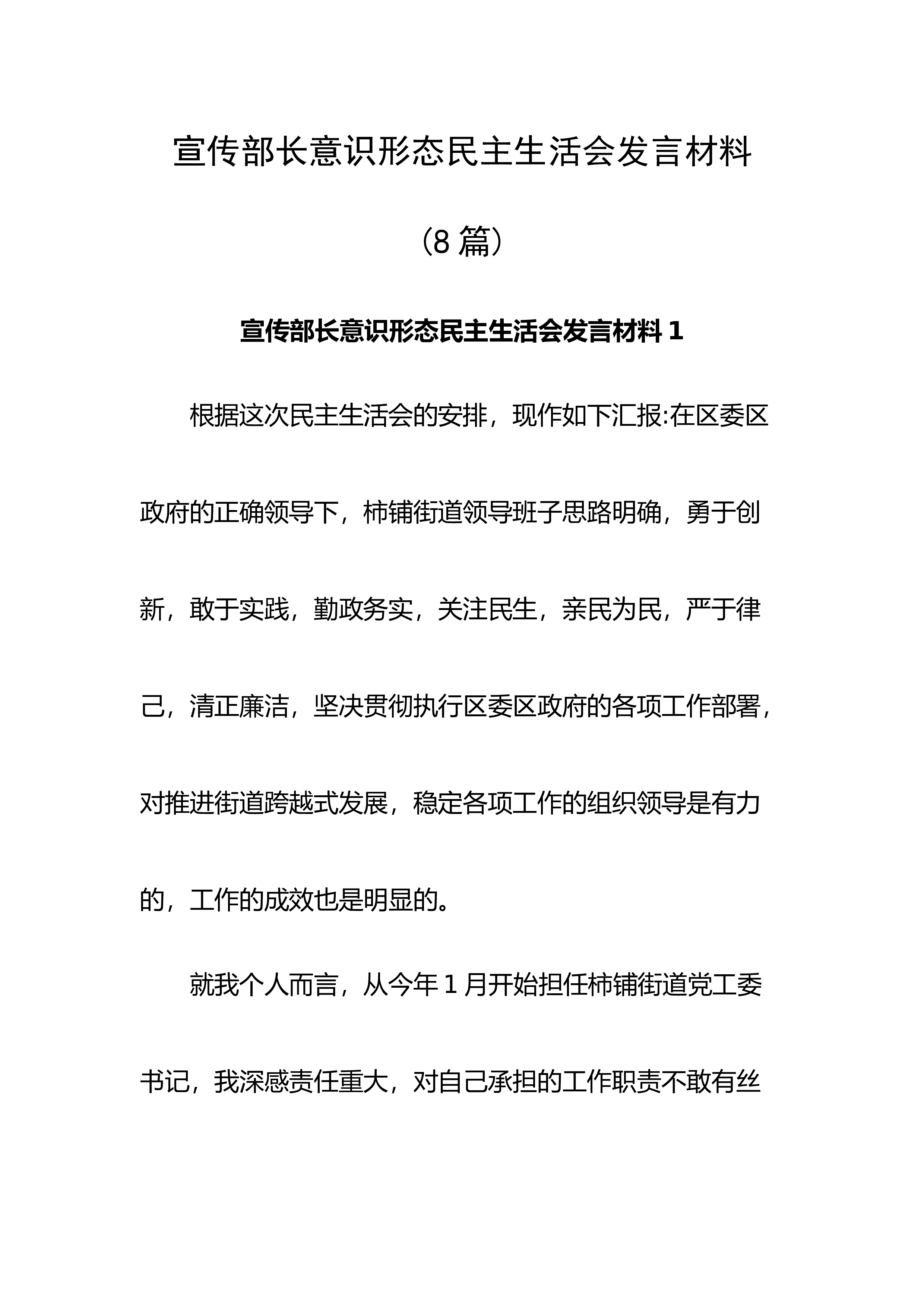 宣传部长意识形态民主生活会发言材料(8篇)宣传部长意识形态民主生活会发言材料1根据这次民主生活会的安排,现作如下汇报:在区委区政府的正确领导下,柿铺街道领导班子思路明确,勇于创新,敢于实践,勤政务实,关注民生,亲民为民,严于律己,清正廉洁,坚决贯彻执行区委区政府的各项工作部署,对推进街道跨越式发展,稳定各项工作的组织领导是有力的,工作的成效也是明显的。就我个人而言,从今年1月开始担任柿铺街道党工委书记,我深感责任重大,对自己承担的工作职责不敢有丝耄懈怠。工作中,我一直得到街道同志们的信任、关心和支持,工作环境是宽松的,个人的心情是舒畅的,与同志们的合作也是愉快的,六个多月来,在区委区政府的领导...