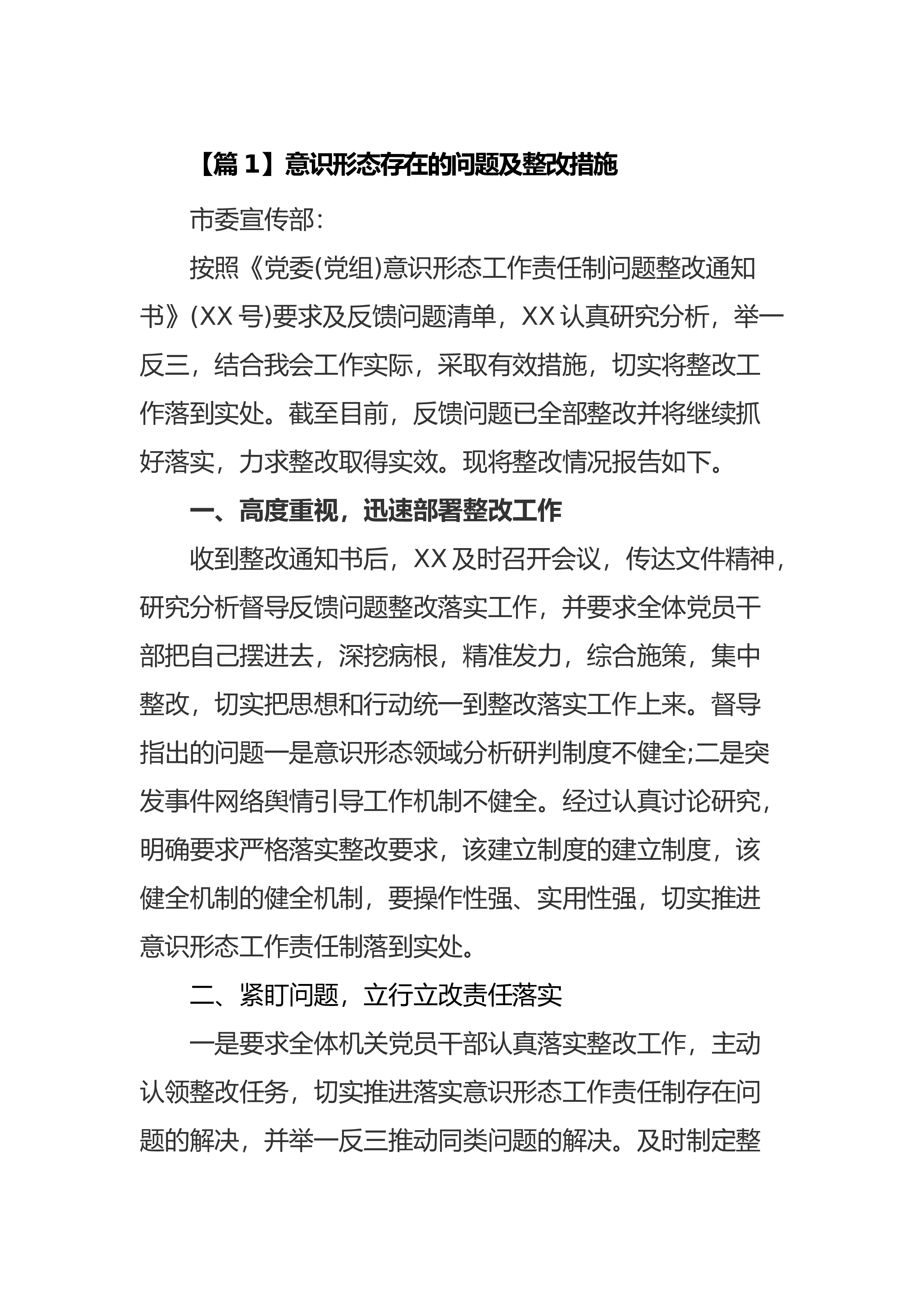 【篇1】意识形态存在的问题及整改措施市委宣传部:按照《党委(党组)意识形态工作责任制问题整改通知书》(XX号)要求及反馈问题清单,XX认真研究分析,举一反三,结合我会工作实际,采取有效措施,切实将整改工作落到实处。截至目前,反馈问题已全部整改并将继续抓好落实,力求整改取得实效。现将整改情况报告如下。一、高度重视,迅速部署整改工作收到整改通知书后,XX及时召开会议,传达文件精神,研究分析督导反馈问题整改落实工作,并要求全体党员干部把自己摆进去,深挖病根,精准发力,综合施策,集中整改,切实把思想和行动统一到整改落实工作上来。督导指出的问题一是意识形态领域分析研判制度不健全;二是突发事件网络舆情引导...