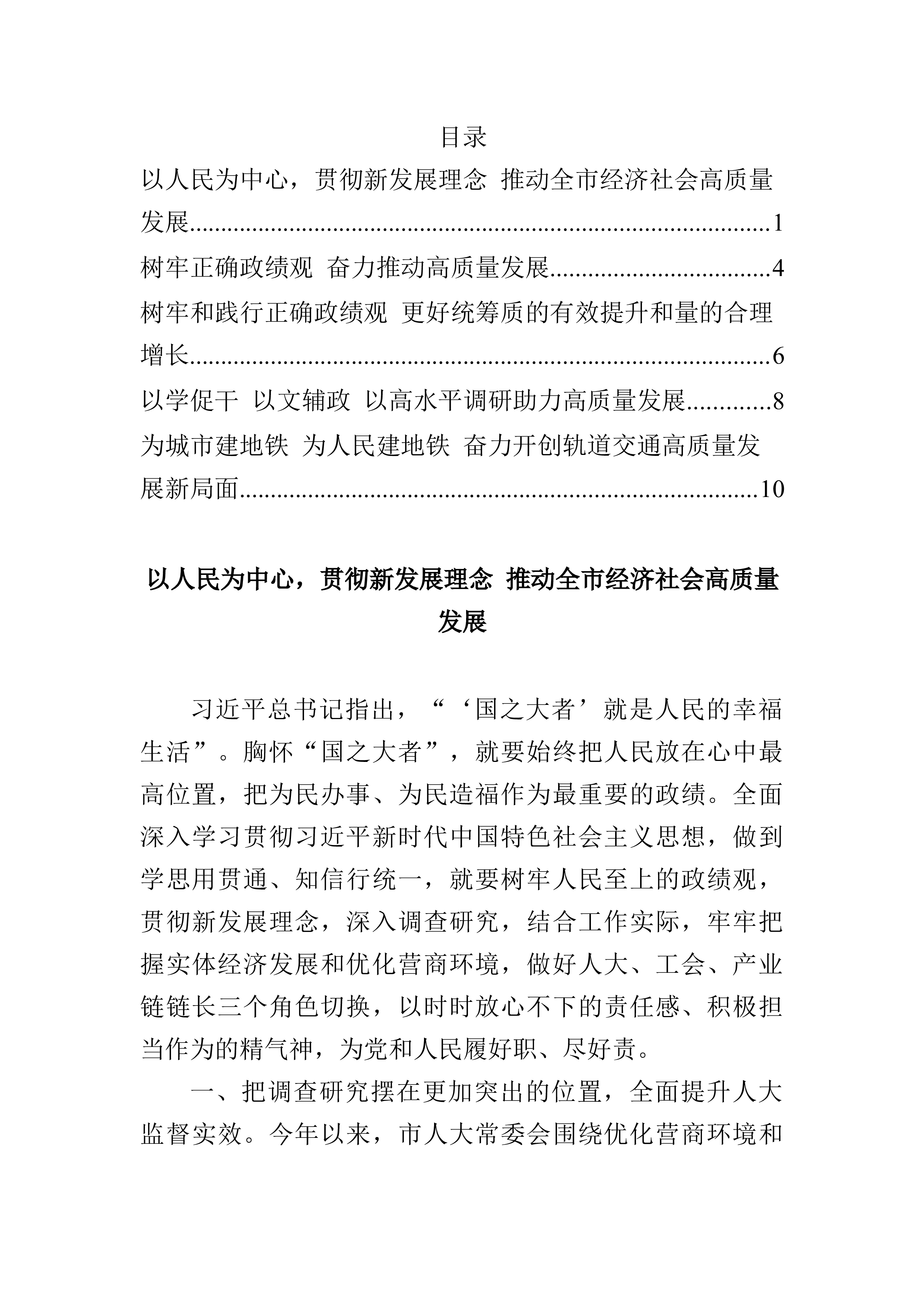 目录以人民为中心,贯彻新发展理念推动全市经济社会高质量发展.............................................................................................1树牢正确政绩观奋力推动高质量发展...................................4树牢和践行正确政绩观更好统筹质的有效提升和量的合理增长.............................................................................................6以学促干...