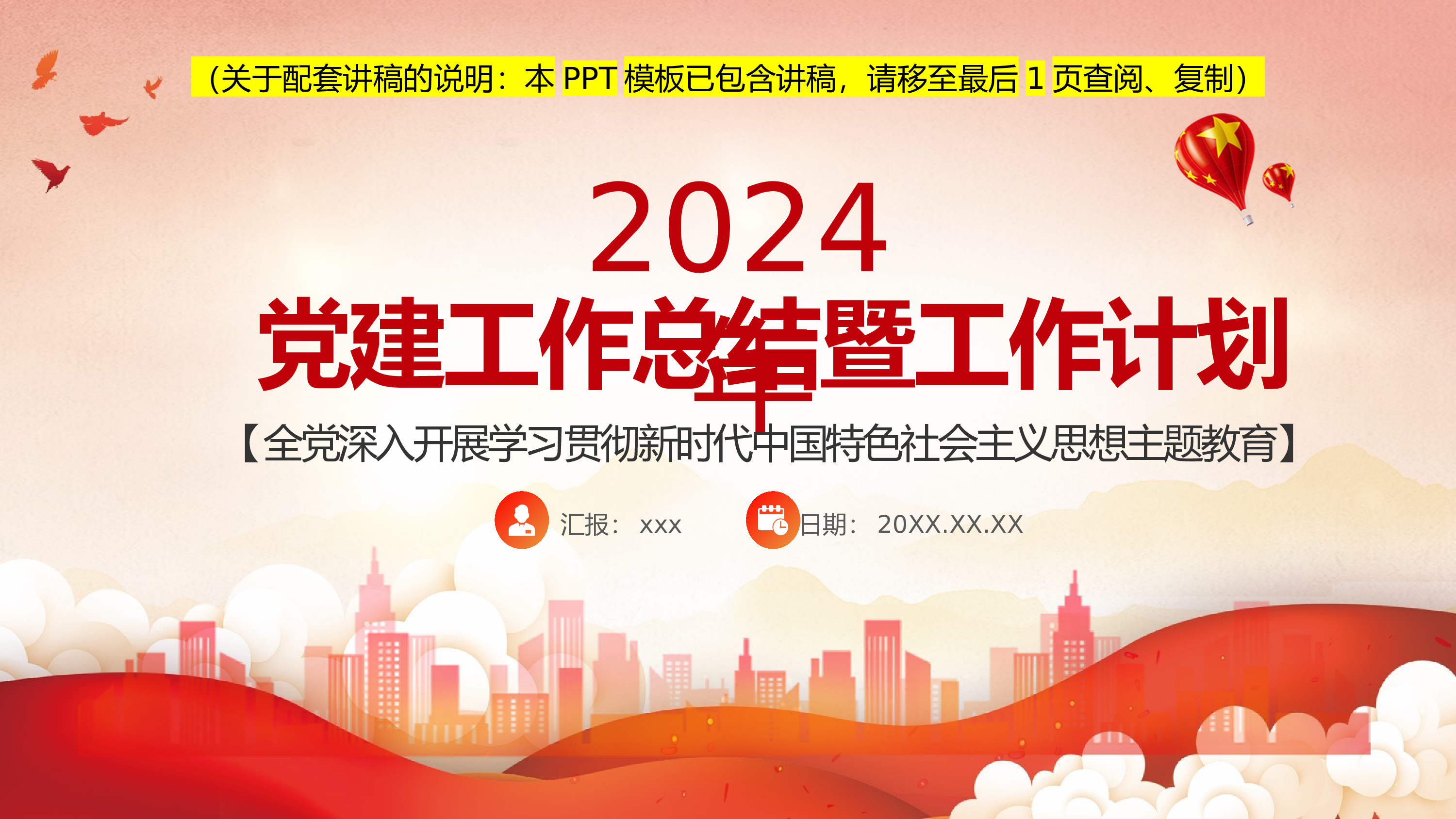 2024年党建工作总结暨工作计划【全党深入开展学习贯彻新时代中国特色社会主义思想主T教育】汇报:xxx日期:20XX.XX.XX(关于配套讲稿的说明:本PPT模板已包含讲稿,请移至最后1页查阅、复制)习近平新时代中国特色社会主义思想主T教育开展以来,X党委认真学习习近平总书记在主T教育工作会议上的重要讲话精神,深刻认识开展这次主T教育的重大意义,牢牢把握“学思想、强党性、重实践、建新功”的总要求,紧紧锚定目标任务,把主T教育谋划好、组织好、落实好,班子成员坚持以身作则、以上率下,全面加强理论武装,坚持不懈用习近平新时代中国特色社会主义思想凝心铸魂,按照以学铸魂、以学增智、以学正风、以学促干要求...