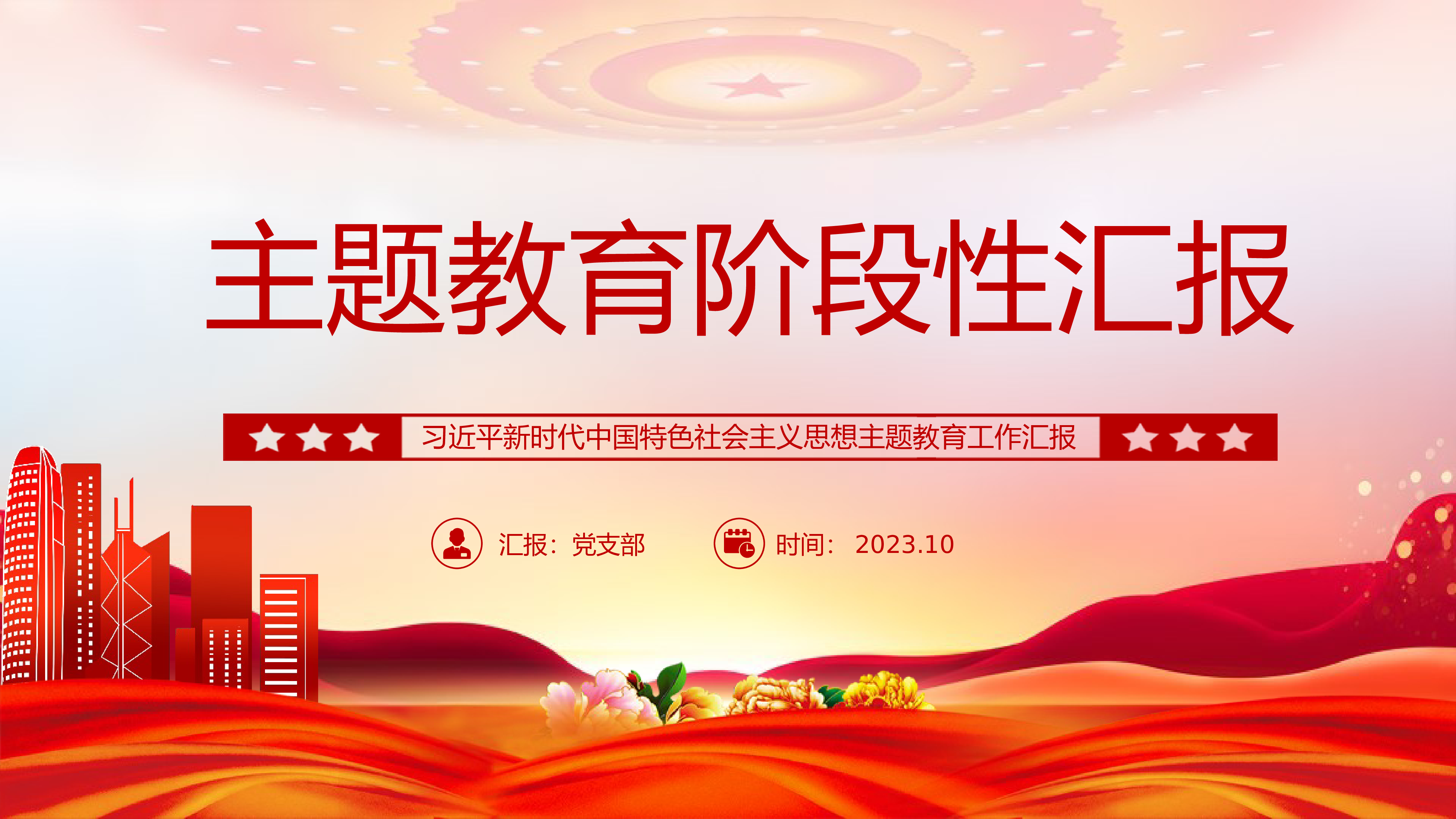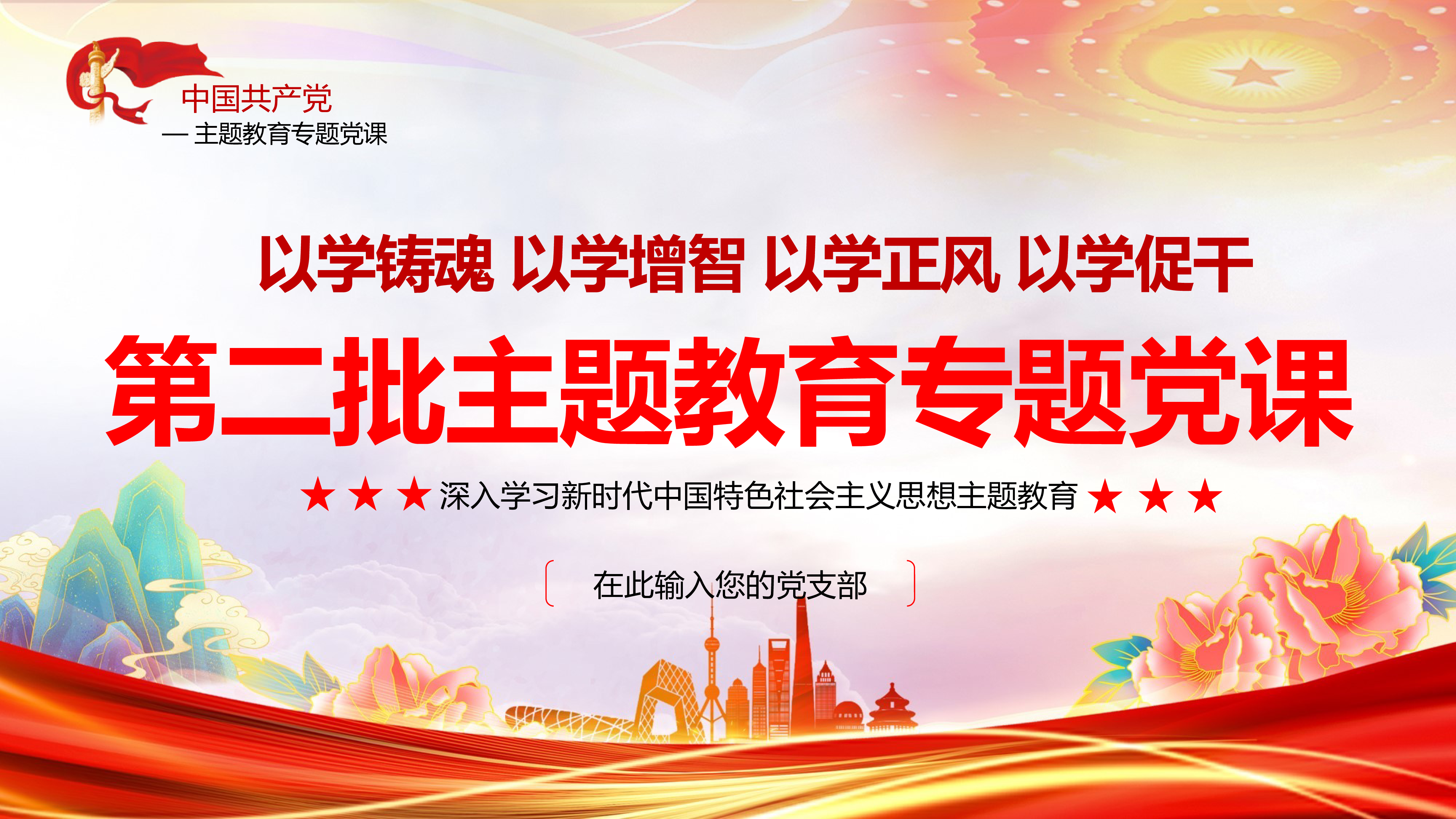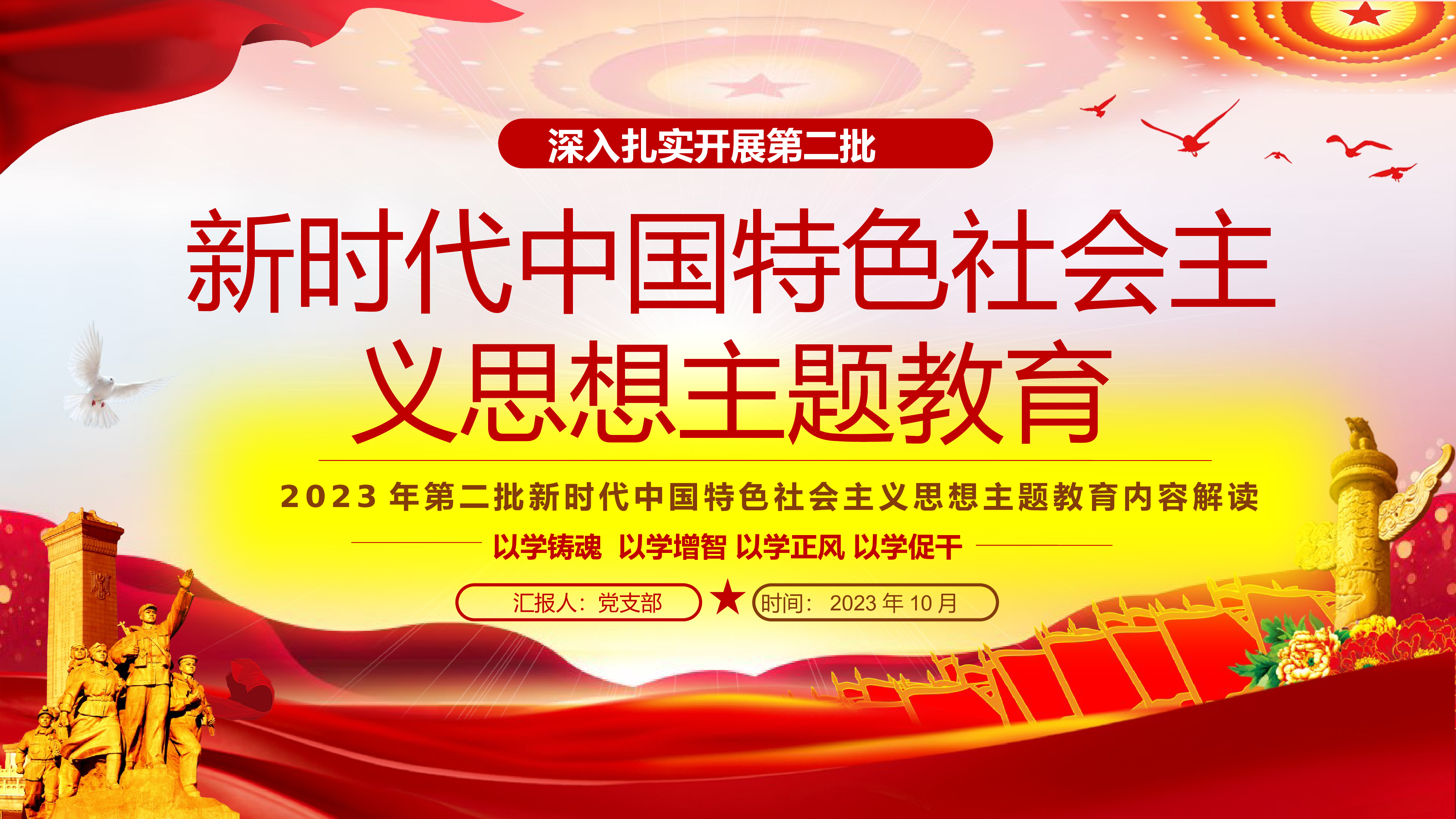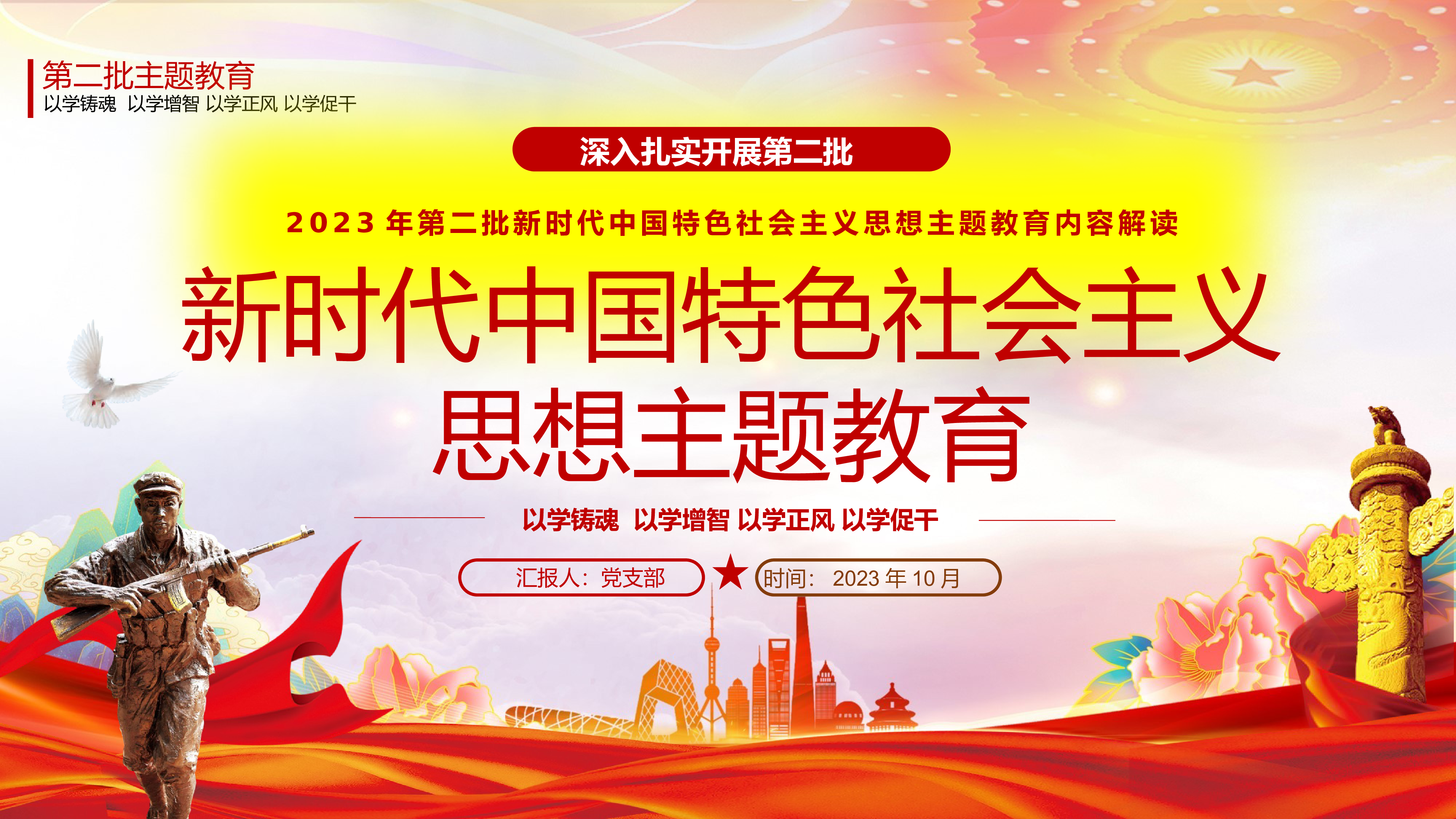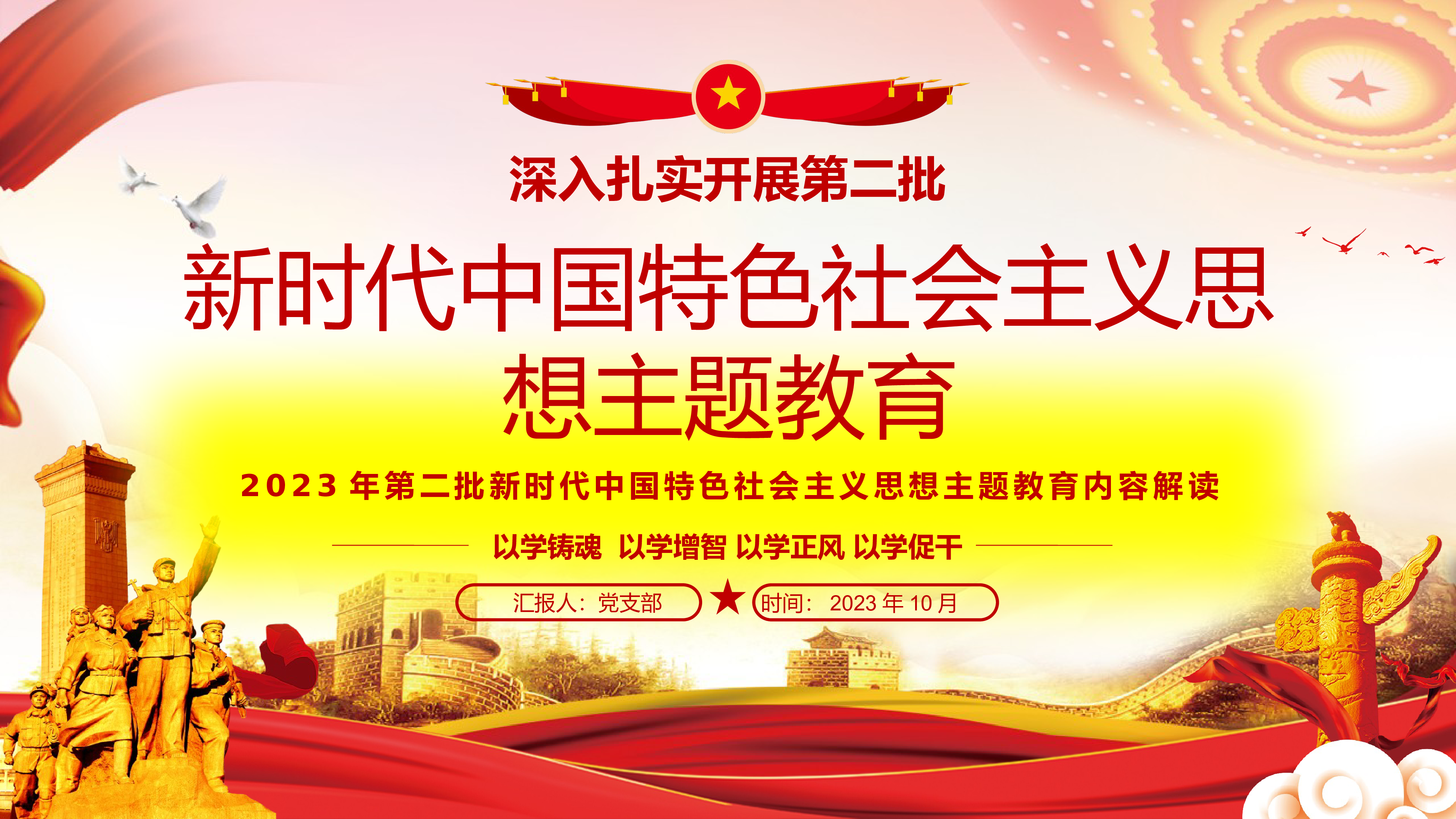 ★★★党政部门/党支部/团支部2023年学习教育专题授课★★★融入教育大课堂把学习成效转化为推动工作的强大动力以学铸魂以学增智以学正风以学促干汇报人:党支部时间:2023年10月前言|PREFACE以学铸魂以学增智以学正风以学促干我们要全面把握教育的总体要求,要突出学深悟透,抓好理论学习这个首要任务,带着感情学、带着思想学、带着责任学,将习近平新时代中国特色社会主义思想学习精、理解透、应用好,真正融入这个大课堂,激发起真学真用、真抓实干的行动和热情,把新时代中国特色社会主义思想转化为坚定理想、锤炼党性和指导实践、推动工作的强大力量。目录|CONTENTS以学铸魂、以学增智、以学正风、以...
