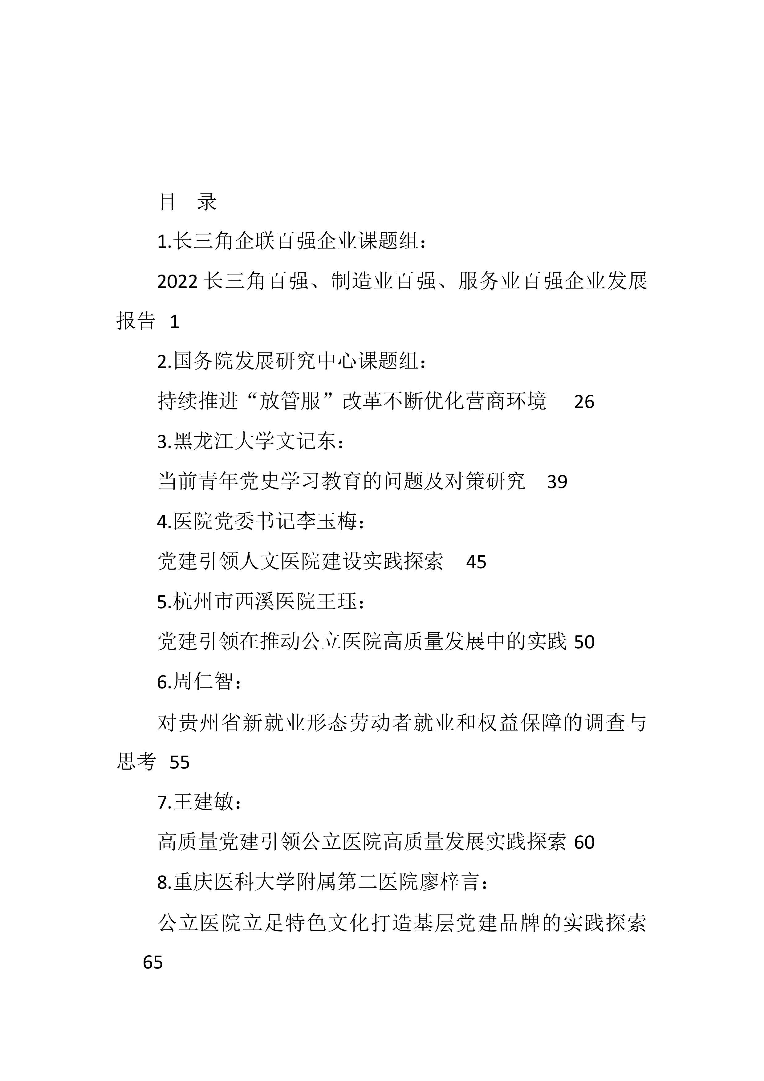 目录1.长三角企联百强企业课题组:2022长三角百强、制造业百强、服务业百强企业发展报告12.国务院发展研究中心课题组:持续推进“放管服”改革不断优化营商环境263.黑龙江大学文记东:当前青年党史学习教育的问题及对策研究394.医院党委书记李玉梅:党建引领人文医院建设实践探索455.杭州市西溪医院王珏:党建引领在推动公立医院高质量发展中的实践506.周仁智:对贵州省新就业形态劳动者就业和权益保障的调查与思考557.王建敏:高质量党建引领公立医院高质量发展实践探索608.重庆医科大学附属第二医院廖梓言:公立医院立足特色文化打造基层党建品牌的实践探索659.郭涛:关于辽宁省农村居民可支配收入统计分...
