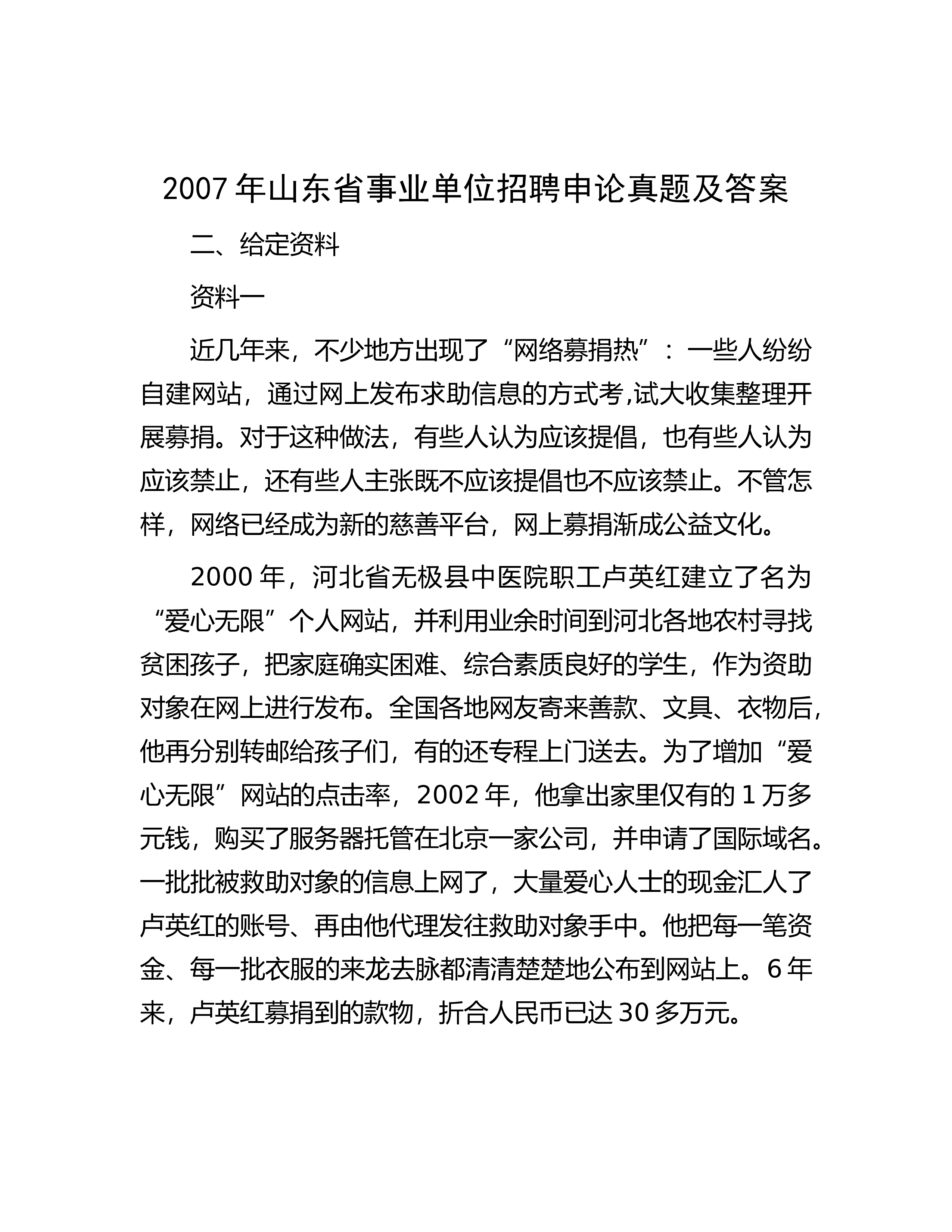 2007年山东省事业单位招聘申论真题及答案二、给定资料资料一近几年来,不少地方出现了“网络募捐热”:一些人纷纷自建网站,通过网上发布求助信息的方式考,试大收集整理开展募捐。对于这种做法,有些人认为应该提倡,也有些人认为应该禁止,还有些人主张既不应该提倡也不应该禁止。不管怎样,网络已经成为新的慈善平台,网上募捐渐成公益文化。2000年,河北省无极县中医院职工卢英红建立了名为“爱心无限”个人网站,并利用业余时间到河北各地农村寻找贫困孩子,把家庭确实困难、综合素质良好的学生,作为资助对象在网上进行发布。全国各地网友寄来善款、文具、衣物后,他再分别转邮给孩子们,有的还专程上门送去。为了增加“爱心无限”...