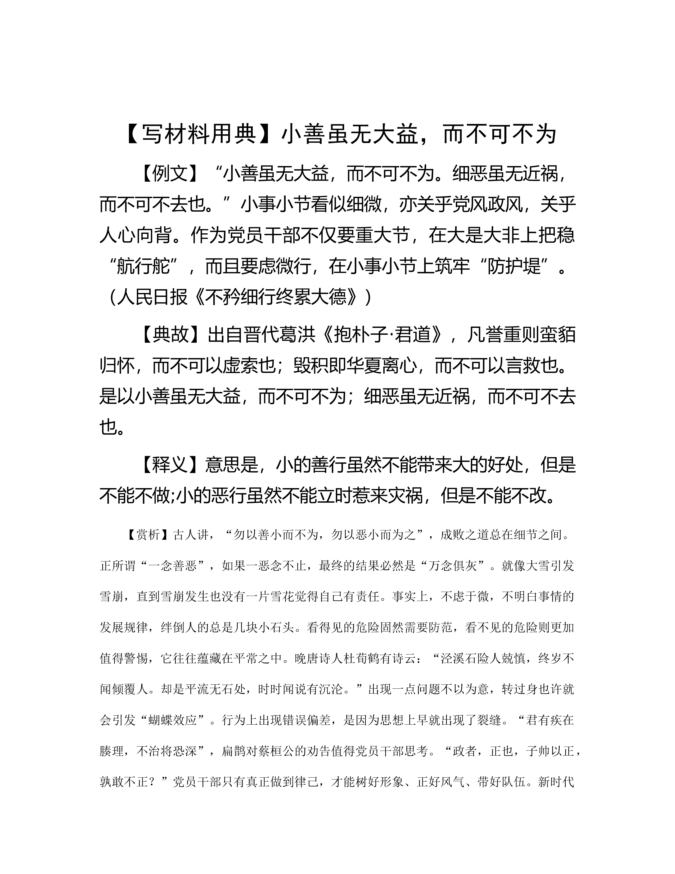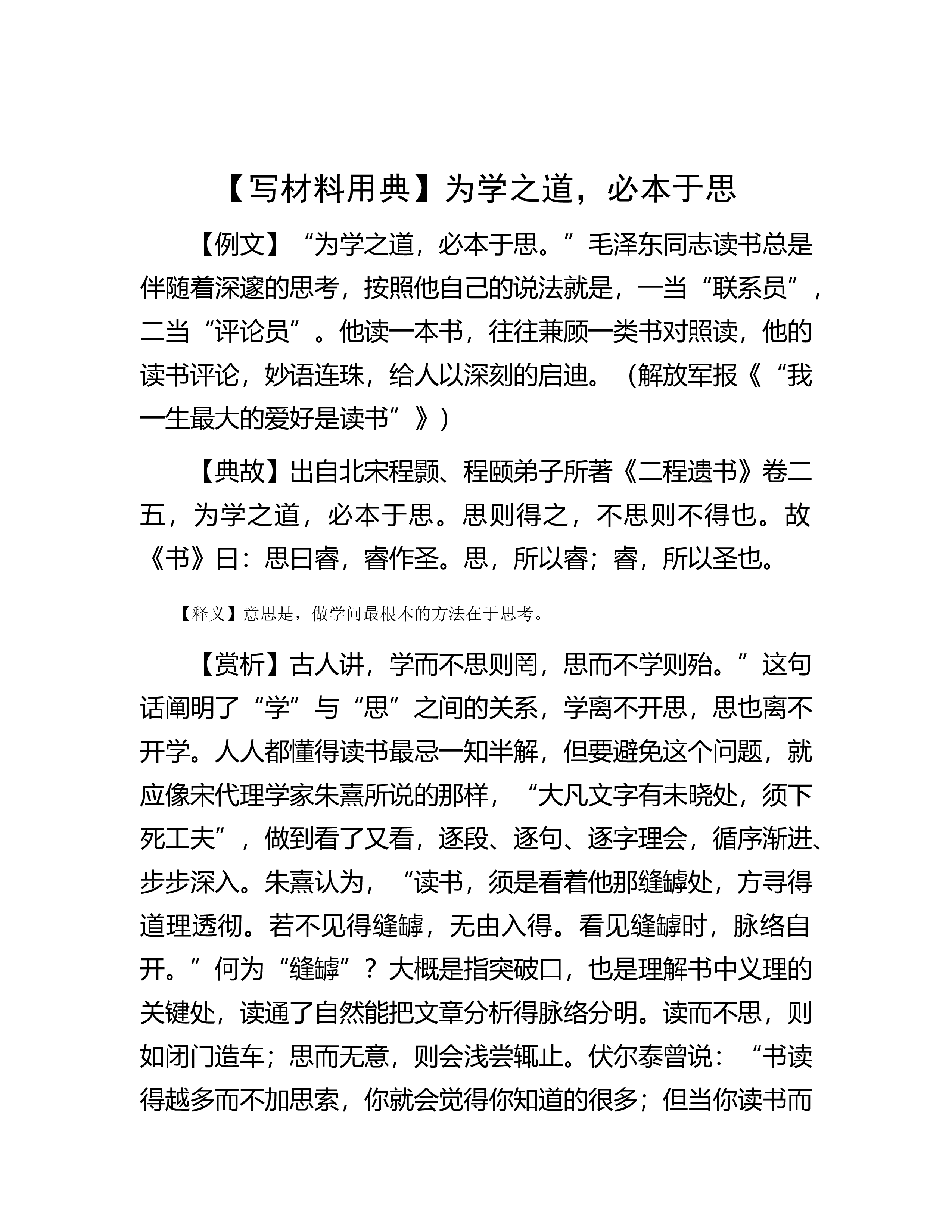 【写材料用典】为学之道,必本于思【例文】“为学之道,必本于思。”毛泽东同志读书总是伴随着深邃的思考,按照他自己的说法就是,一当“联系员”,二当“评论员”。他读一本书,往往兼顾一类书对照读,他的读书评论,妙语连珠,给人以深刻的启迪。(解放军报《“我一生最大的爱好是读书”》)【典故】出自北宋程颢、程颐弟子所著《二程遗书》卷二五,为学之道,必本于思。思则得之,不思则不得也。故《书》曰:思曰睿,睿作圣。思,所以睿;睿,所以圣也。【释义】意思是,做学问最根本的方法在于思考。【赏析】古人讲,学而不思则罔,思而不学则殆。”这句话阐明了“学”与“思”之间的关系,学离不开思,思也离不开学。人人都懂得读书最忌一知...
