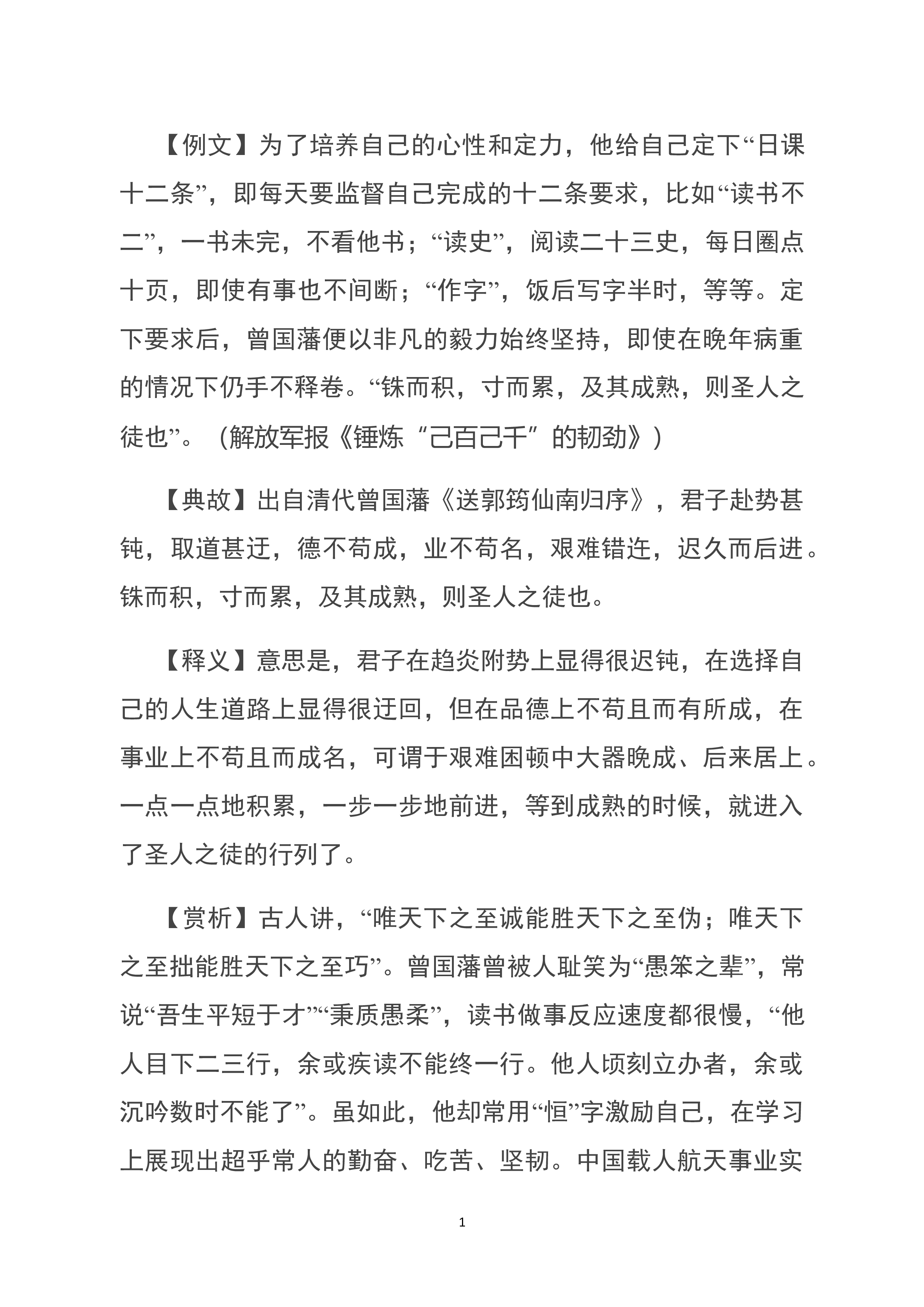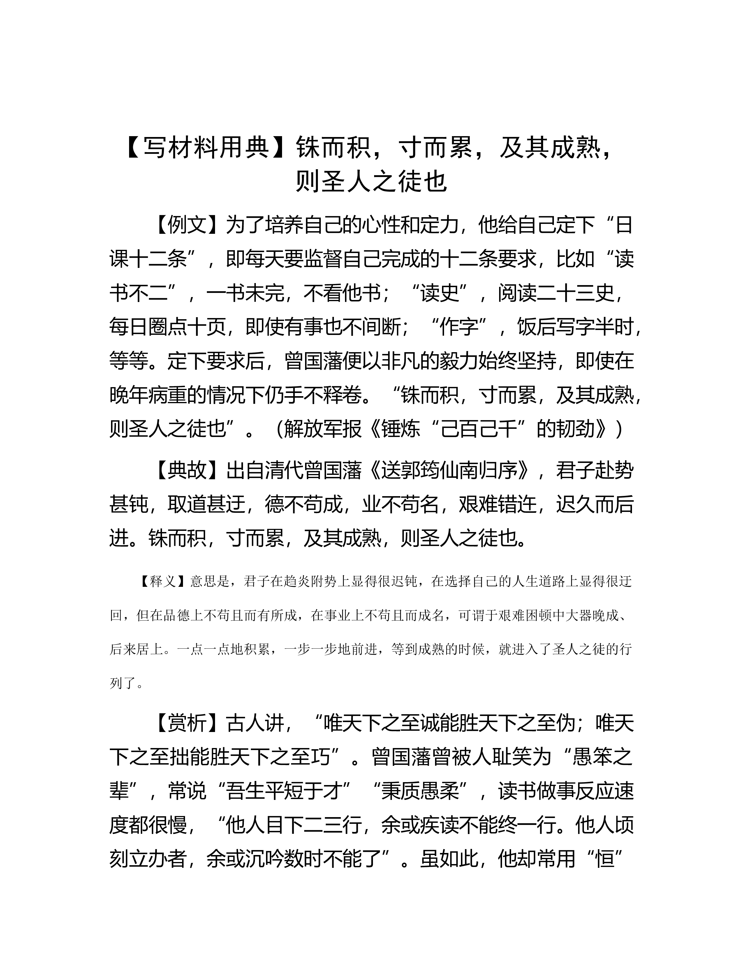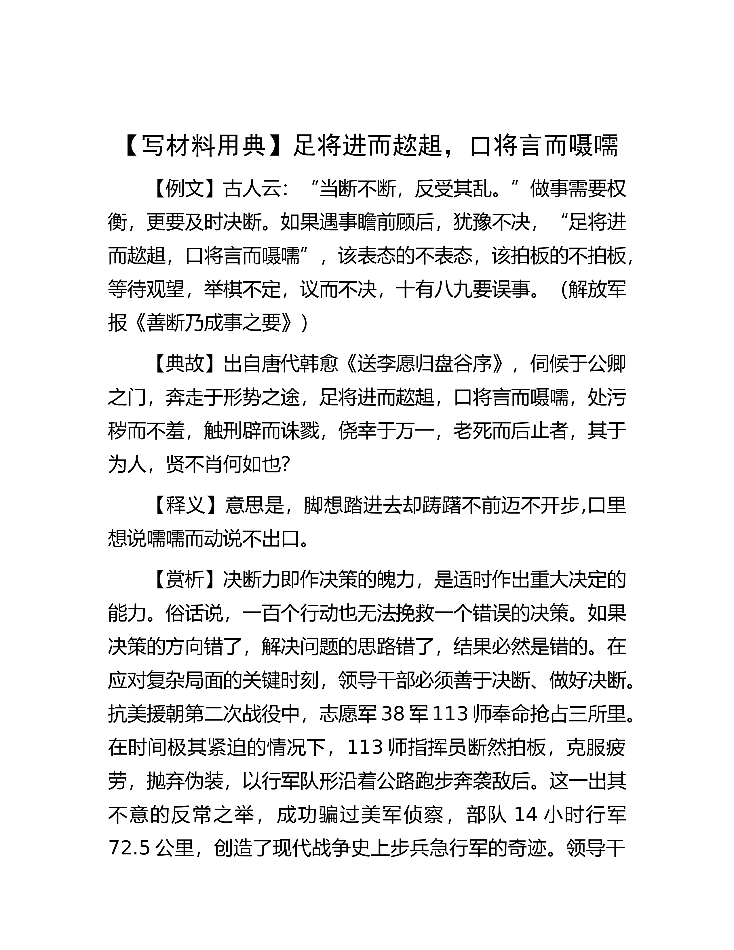 【写材料用典】足将进而趑趄,口将言而嗫嚅【例文】古人云:“当断不断,反受其乱。”做事需要权衡,更要及时决断。如果遇事瞻前顾后,犹豫不决,“足将进而趑趄,口将言而嗫嚅”,该表态的不表态,该拍板的不拍板,等待观望,举棋不定,议而不决,十有八九要误事。(解放军报《善断乃成事之要》)【典故】出自唐代韩愈《送李愿归盘谷序》,伺候于公卿之门,奔走于形势之途,足将进而趑趄,口将言而嗫嚅,处污秽而不羞,触刑辟而诛戮,侥幸于万一,老死而后止者,其于为人,贤不肖何如也?【释义】意思是,脚想踏进去却踌躇不前迈不开步,口里想说嚅嚅而动说不出口。【赏析】决断力即作决策的魄力,是适时作出重大决定的能力。俗话说,一百个行动...