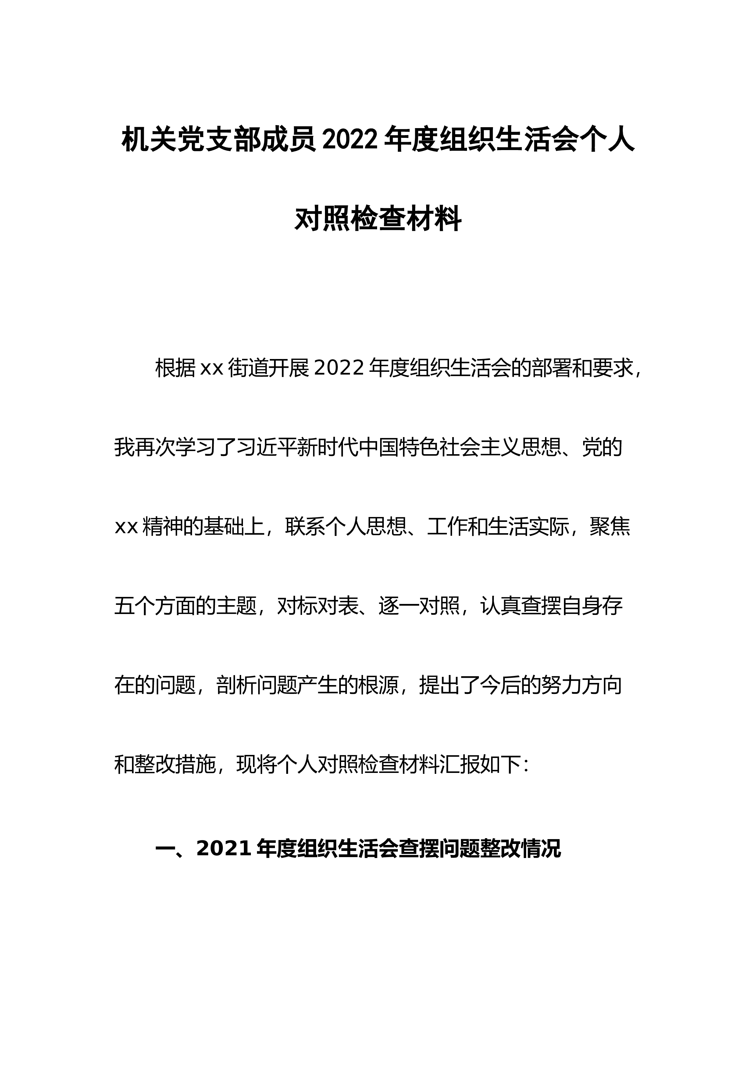 某县委组织部支部班子2022年度组织生活会对照检查材料根据《关于召开2022年度基层党组织组织生活会和开展民主评议党员的通知》精神,县委组织部党支部联系工作实际,对照党章规定的党支部职责,对照完成巡视巡察以及上年度组织生活会等问题整改情况,重点查摆增强政治功能和组织功能存在的问题和差距,经认真梳理归纳,共汇总梳理问题X项。同时,深入开展谈心谈话,深刻剖析问题根源,明确了努力方向和整改措施。现将对照检查情况报告如下: 一、2021年度组织生活会问题整改情况 2021年度组织生活会共涉及9项问题目前均已完成整改,并长期坚持。一是压实整改责任。根据组织生活会查摆出来的问题和互相批评的意见,制定了...