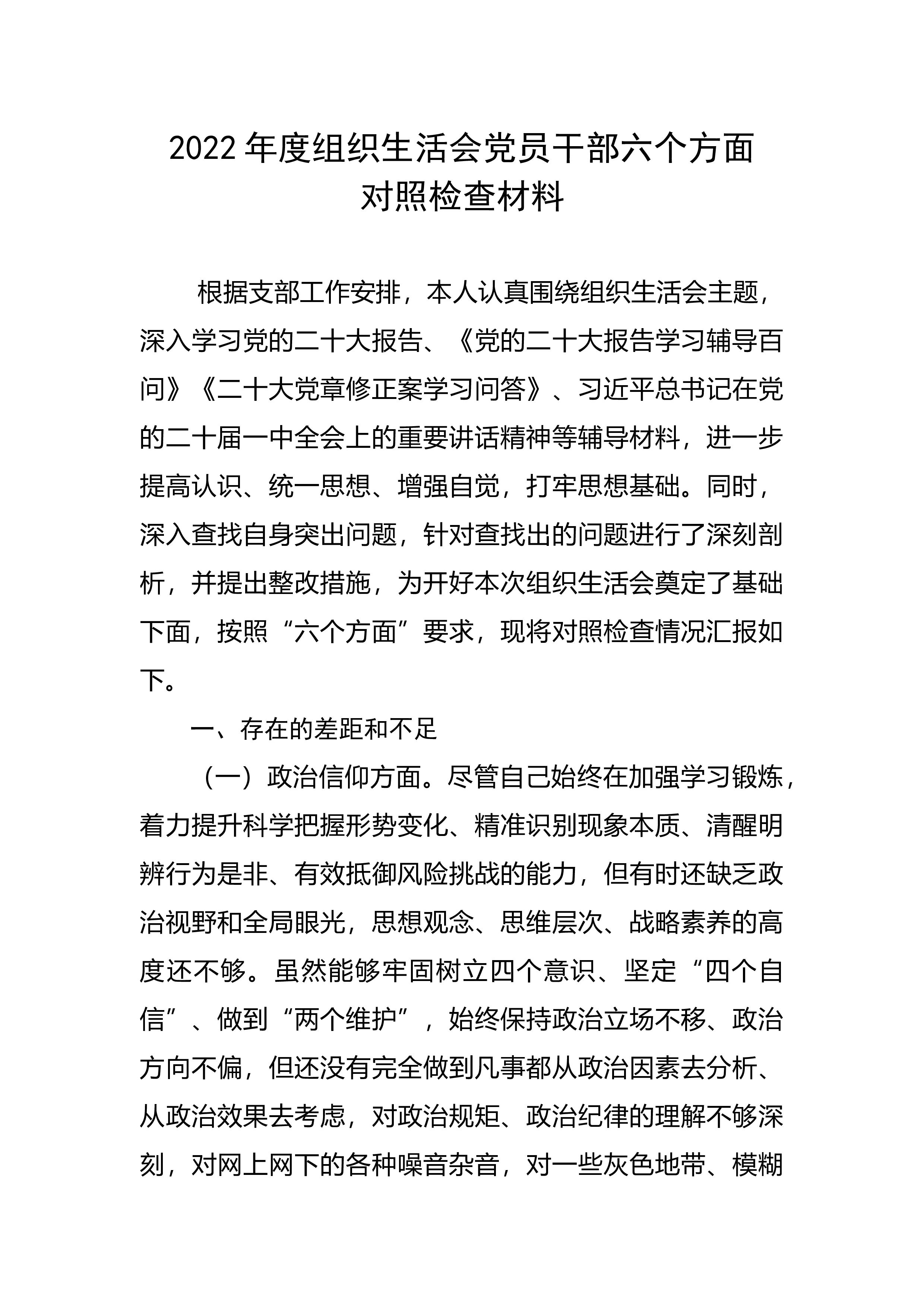 市人社系统党员干部组织生活会个人对照检查材料 根据《XX关于做好2022年度基层党组织组织生活会和开展民主评议党员的通知》精神和所在支部的具体安排本人认真学习党的二十大精神、党章和习近平总书记关于人社工作的重要论述、重要批示指示精神,与部分支部委员、党员及部分群众代表开展了谈心谈话,诚恳征求意见建议,围绕深刻领悟“两个确立”的决定性意义、坚决做到“两个维护”等六个方面,对照习近平总书记的号召和要求,对照党员义务,深入查找自己在政治信仰、党员意识、理论学习、能力本领、作用发挥、纪律作风等方面的不足和问题,深刻剖析思想根源,明确整改措施,现将有关情况汇报如下。一、存在的主要问题(一)在深刻领悟“两...