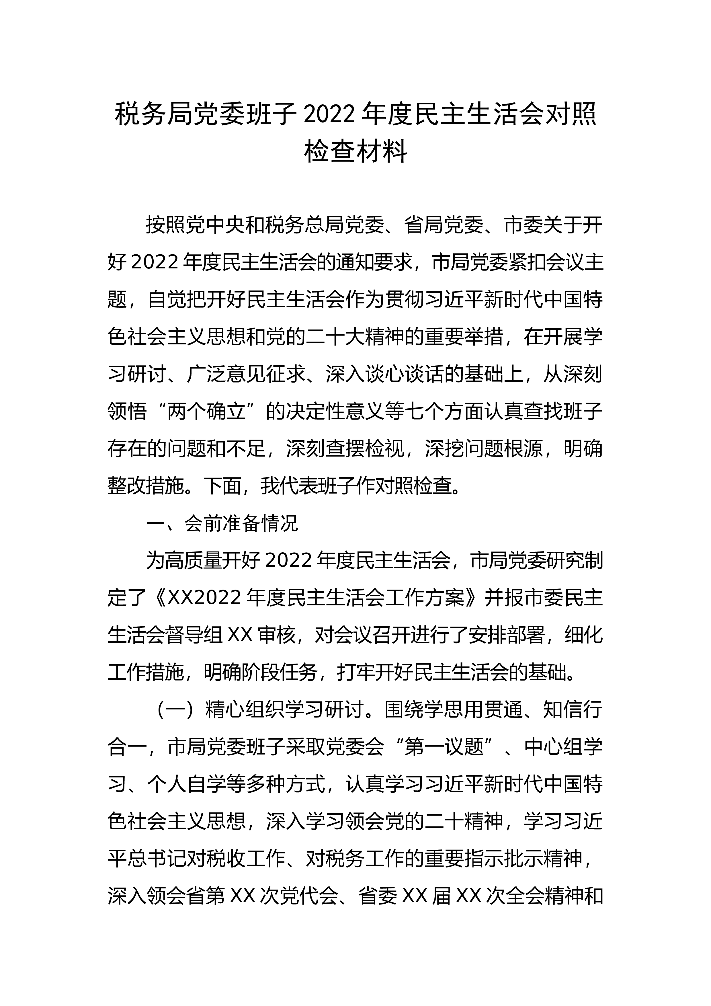 文化旅游局副局长2022年民主生活会对照检查材料按照党中央和省委、市委关于开好2022年度县以上党和国家机关党员领导干部民主生活会的相关要求,会前,本人采取个人自学、集体研讨等方式,深入学习了党的XX大报告和党章,学习了习近平总书记在党的二十届一中全会上的重要讲话精神,严格落实市纪委机关、市委组织部明确的“6个聚焦”要求,切实在全面准确学习领会上下功夫。根据民主生活会有关要求,会前向党员、干部和群众广泛征求意见建议,同班子成员、部分党员及分管部门负责人深入交心谈心,并聚焦本次民主生活会主题,对照党的XX大精神和党章党规党纪,把自己摆进去、把职责摆进去、把工作摆进去,深刻剖析根源,制定整改措施,...