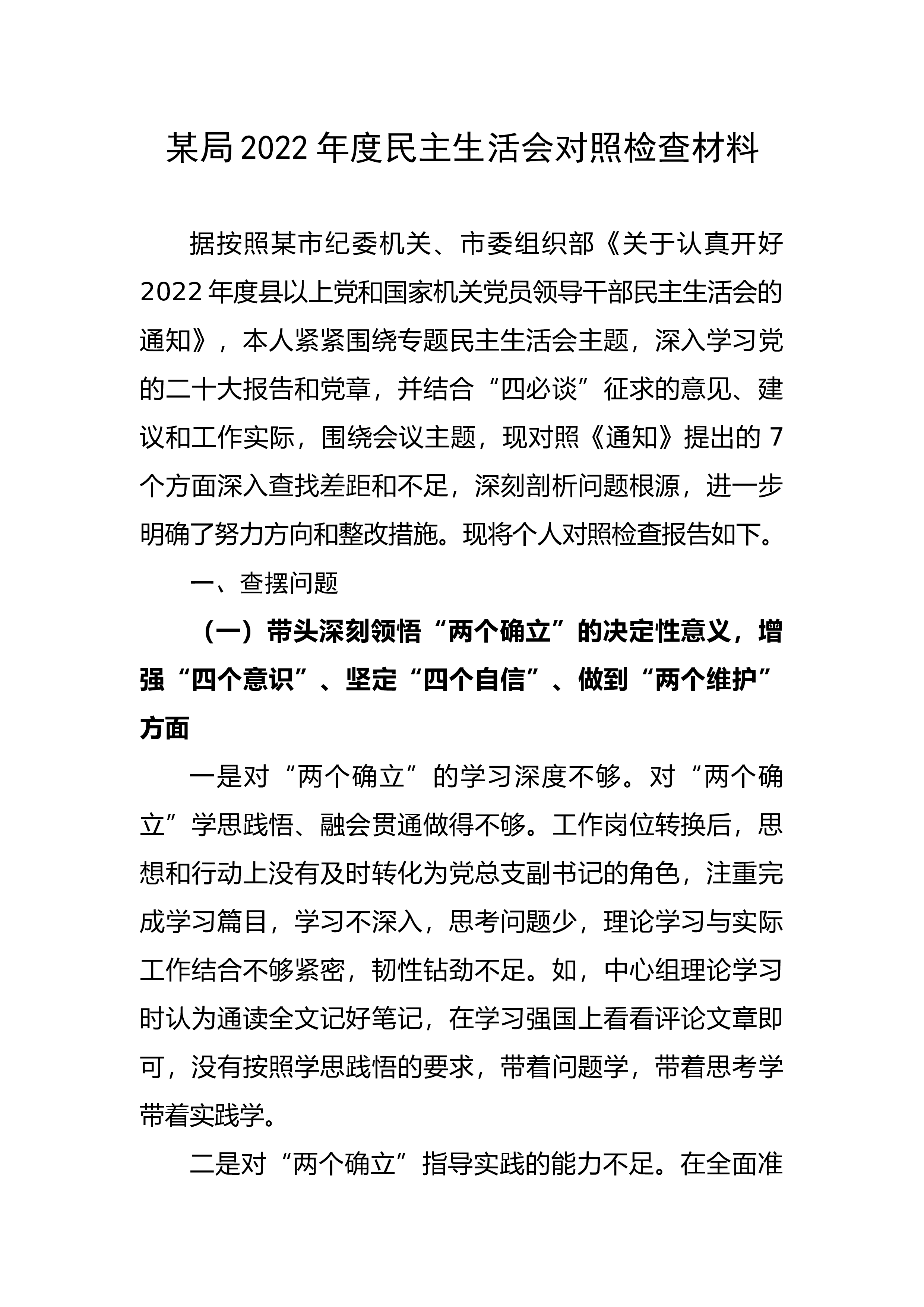 某市纪委监委领导班子2022年度民主生活会对照检查材料按照市委统一部署,市纪委监委领导班子聚焦民主生活会主题,精心开展专题学习研讨,深入学习xx报告、习近平总书记在xx全会上的重要讲话精神、习近平总书记对纪检监察工作的重要指示批示精神和党中央决策部署以及党章、《习近平谈治国理政》《关于新形势下党内政治生活的若干准则》《中国共产党党内监督条例》和中央关于民主生活会的有关要求,深化认识、统一思想。领导班子成员之间、领导班子成员和分管部室负责同志之间开展了谈心谈话,查找剖析问题,进一步明确今后整改措施和努力方向。 一、存在的主要问题 (一)在带头深刻感悟“两个确立”的决定性意义,增强“四个意识”...