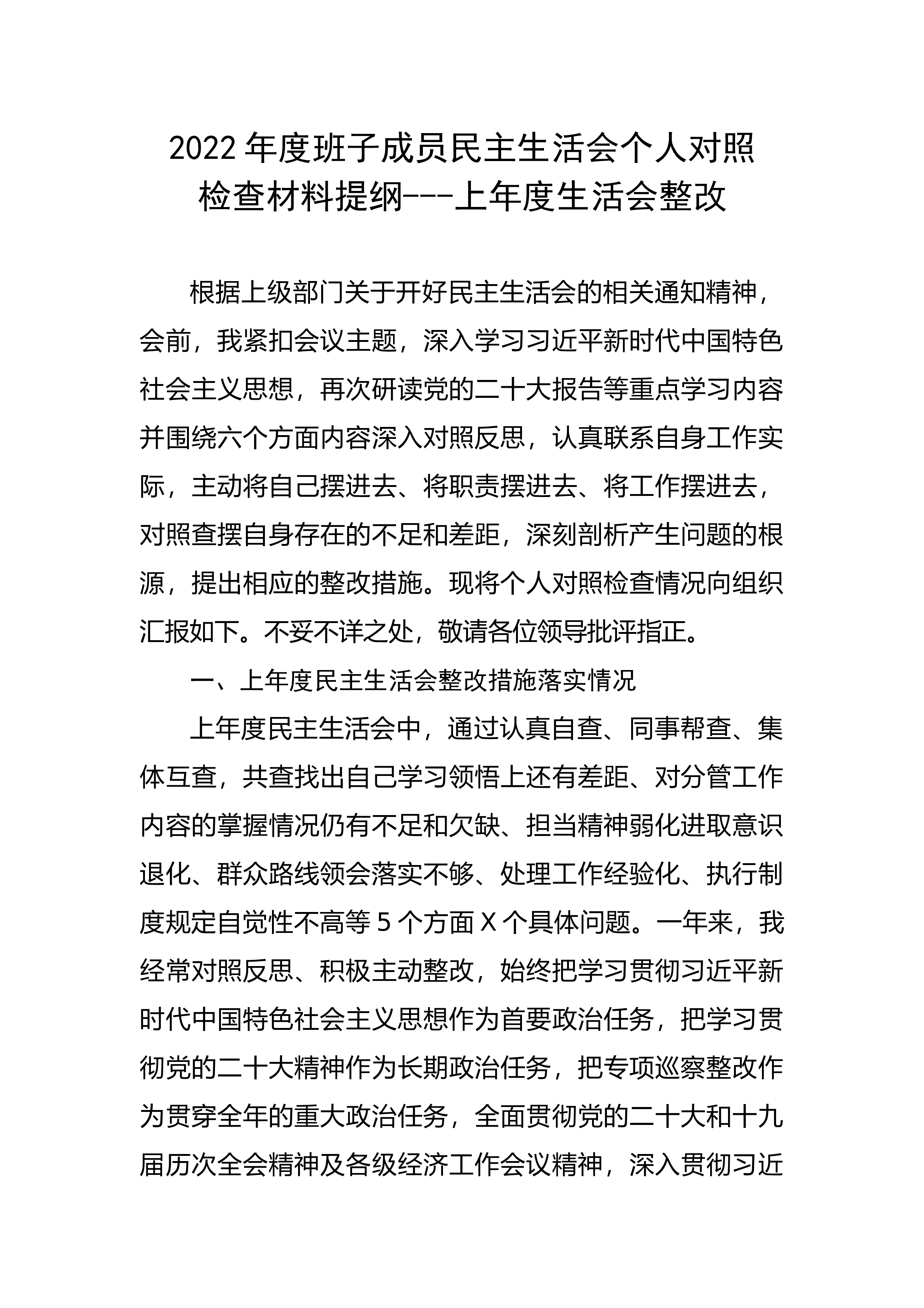 2022年度民主生活会领导班子个人发言提纲按照上级党委关于开好2022年度领导班子民主生活会的有关要求,我参加了中心党支部组织的专题学习研讨会认真读原著、学原文、悟原理,深刻领会习近平新时代中国特色社会主义思想的历史地位和丰富内涵;针对党史学习教育专题民主生活会中个人查摆出的问题整改落实情况进行了总结,结合自身思想工作实际,重点查找存在的突出问题并深刻剖析了问题产生的原因。在此基础上,与班子成员、分管同志等进行了深入扎实的谈心谈话,切实提高了实际效果。通过问题查摆,进一步明确了努力方向,制定了整改措施。下面作个人发言,不当之处请同志们批评指正。一、党史学习教育专题民主生活会整改措施落实情况针对...