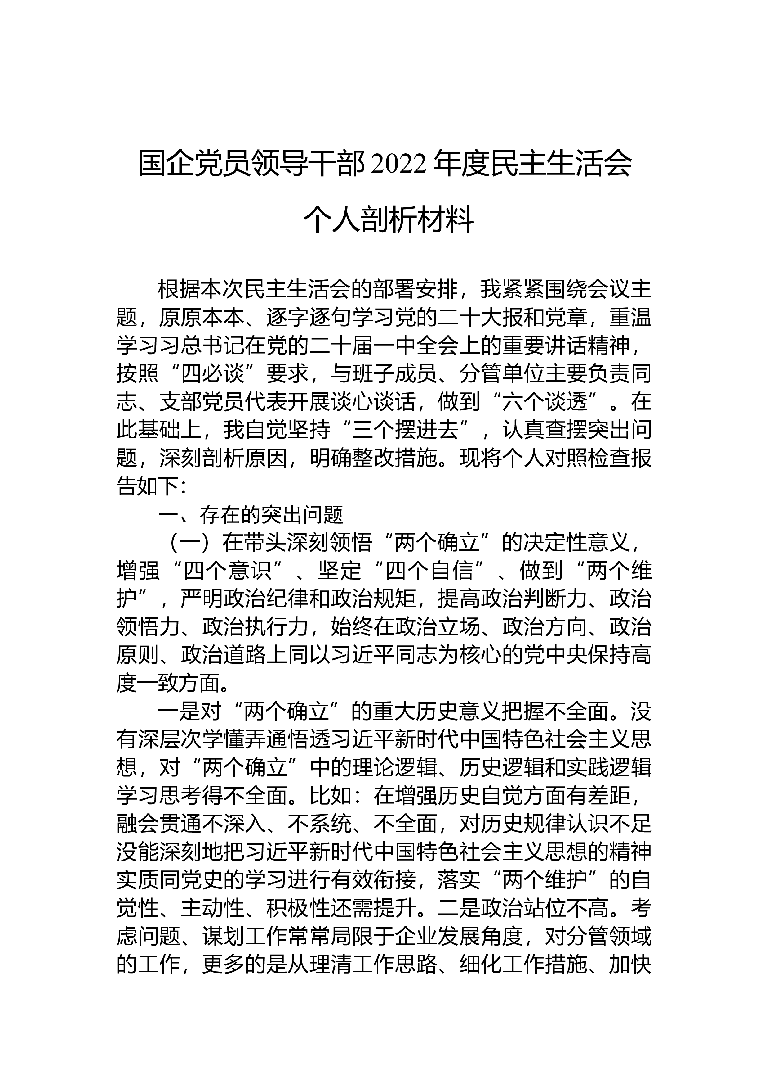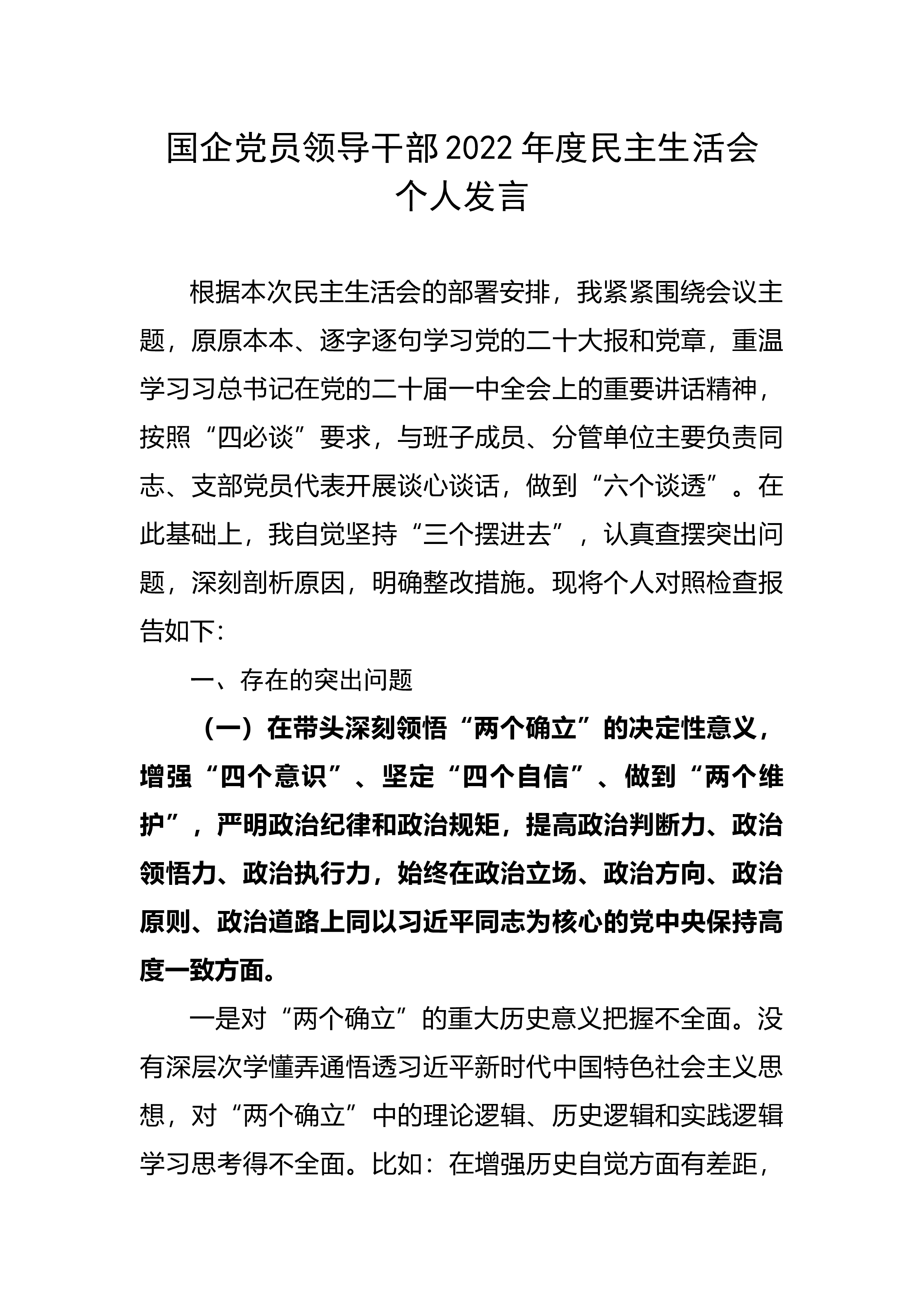 【国资国企】国企公司领导干部2022年度民主生活会“六个带头”对照检查材料