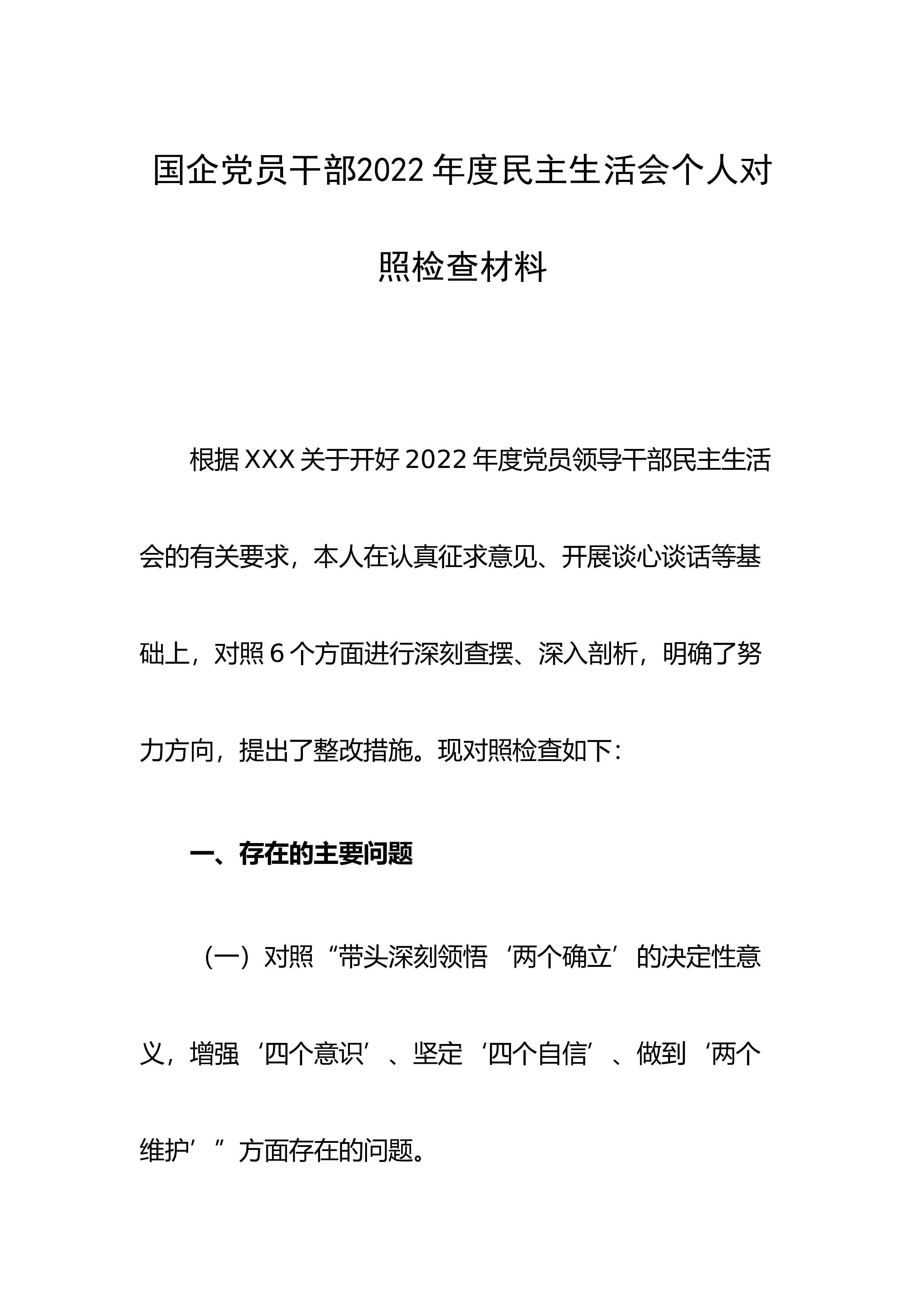国企公司领导干部2022年度民主生活会“六个带头”对照检查材料按照中央和省市部署要求,我紧紧围绕这次专题民主生活会的主题,在前期系统领会习近平新时代中国特色社会主义思想的基础上,又深入学习了XX精神、党章、习近平总书记在xx上的重要讲话以及规定篇目,进一步提升政治站位、牢固理论根基。同时,采取座谈交流、走访调研、谈心交心等方式,广泛征求意见建议,认真对照带头深刻感悟“两个确立”的决定性意义等六个方面,紧密联系个人思想和工作实际,深入查摆问题、剖析原因症结,制定整改措施。现将对照检查情况汇报如下: 一、存在的主要问题 (一)在带头深刻感悟“两个确立”的决定性意义,增强“四个意识”、坚定“四个...