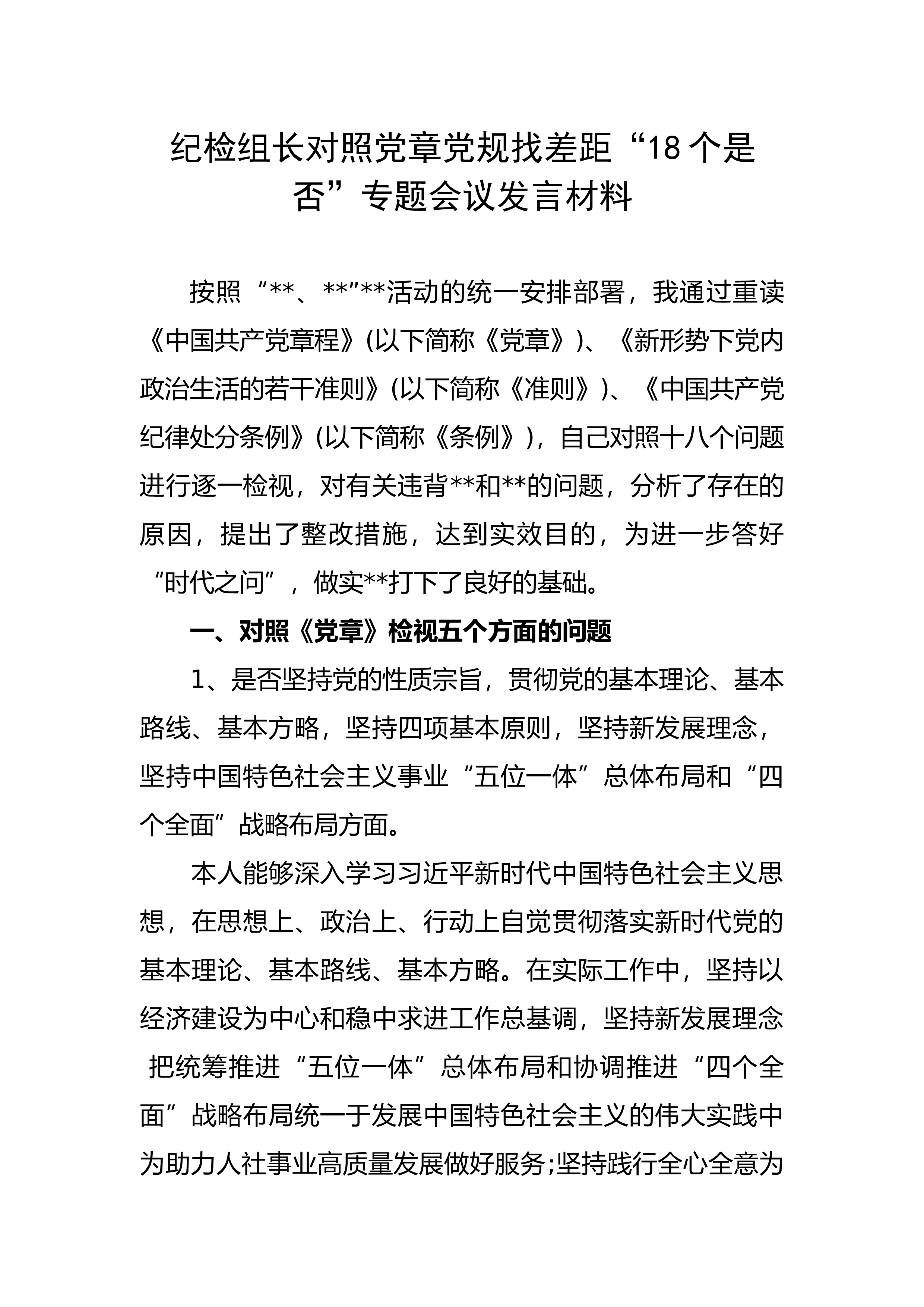 纪检组长对照党章党规找差距“18个是否”专题会议发言材料按照“**、**”**活动的统一安排部署,我通过重读《中国共产党章程》(以下简称《党章》)、《新形势下党内政治生活的若干准则》(以下简称《准则》)、《中国共产党纪律处分条例》(以下简称《条例》),自己对照十八个问题进行逐一检视,对有关违背**和**的问题,分析了存在的原因,提出了整改措施,达到实效目的,为进一步答好“时代之问”,做实**打下了良好的基础。 一、对照《党章》检视五个方面的问题 1、是否坚持党的性质宗旨,贯彻党的基本理论、基本路线、基本方略,坚持四项基本原则,坚持新发展理念,坚持中国特色社会主义事业“五位一体”总体布局和...