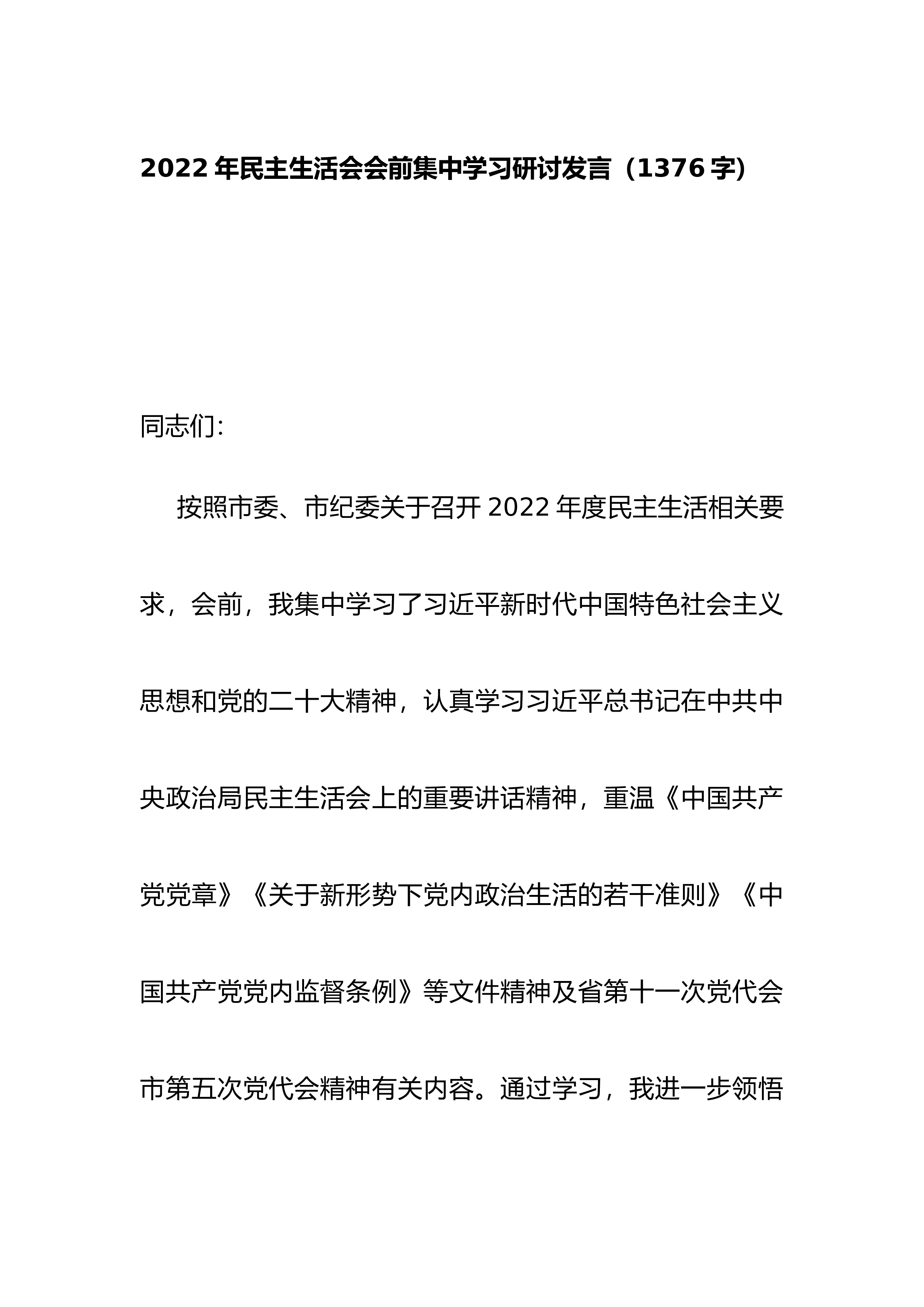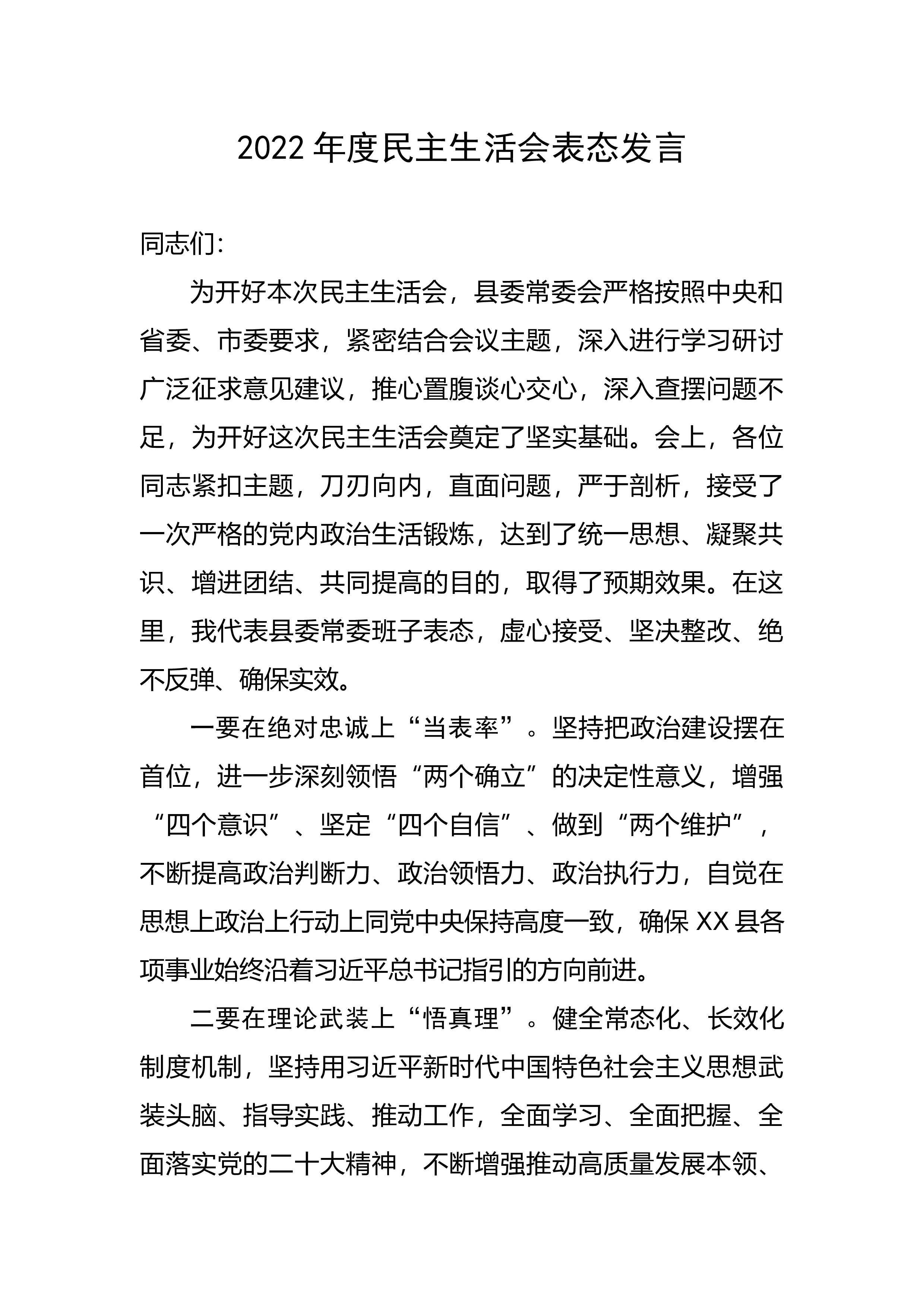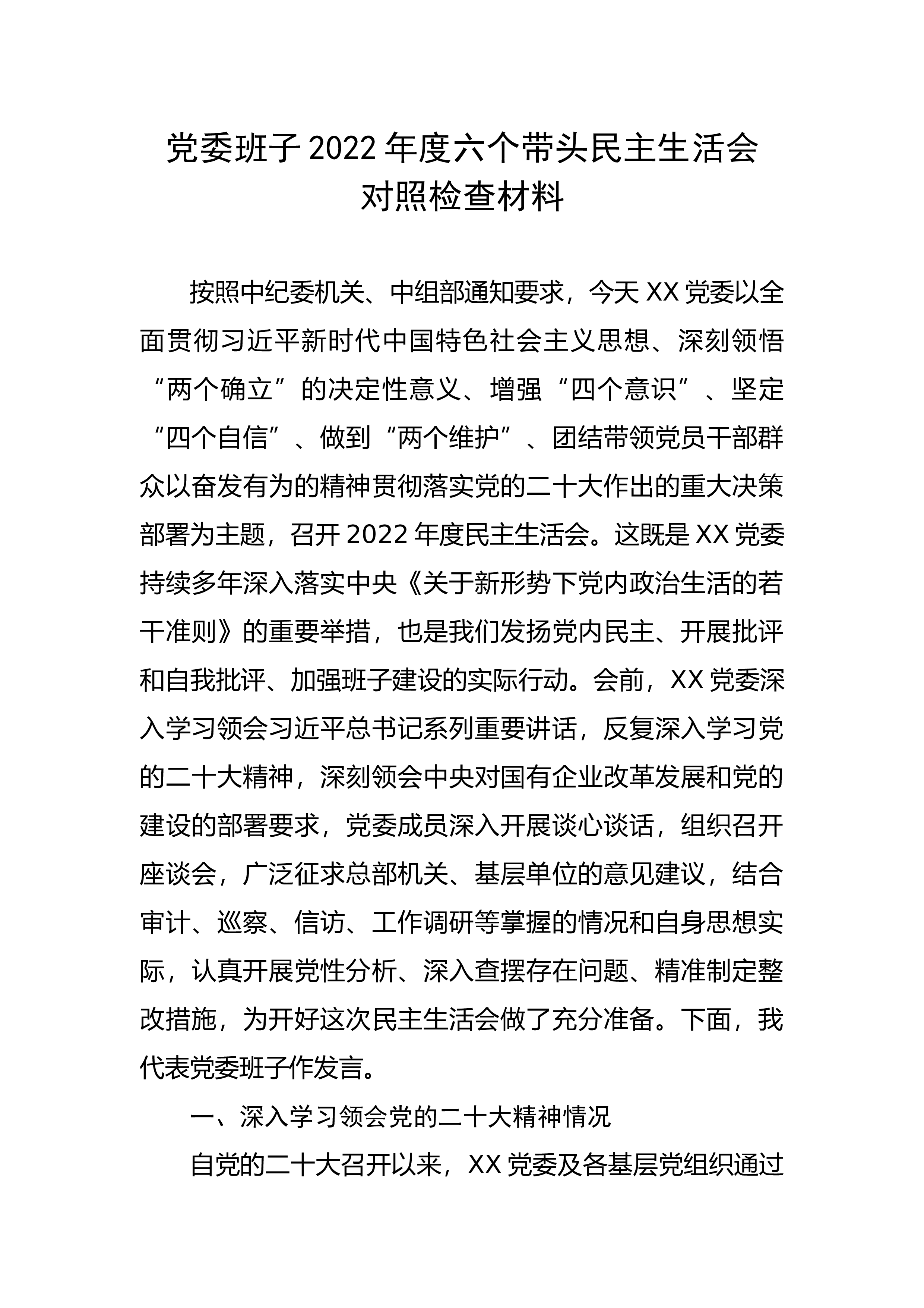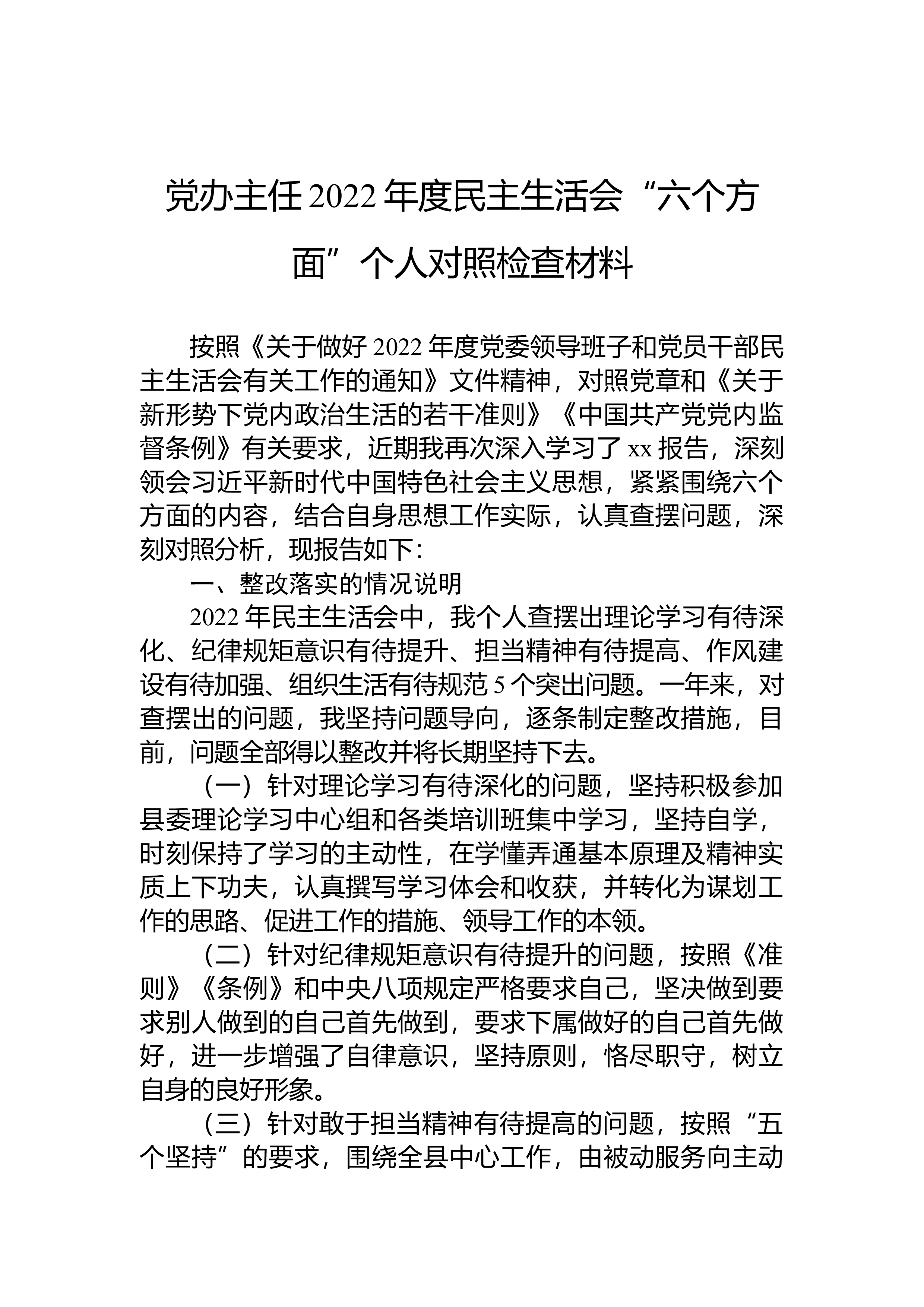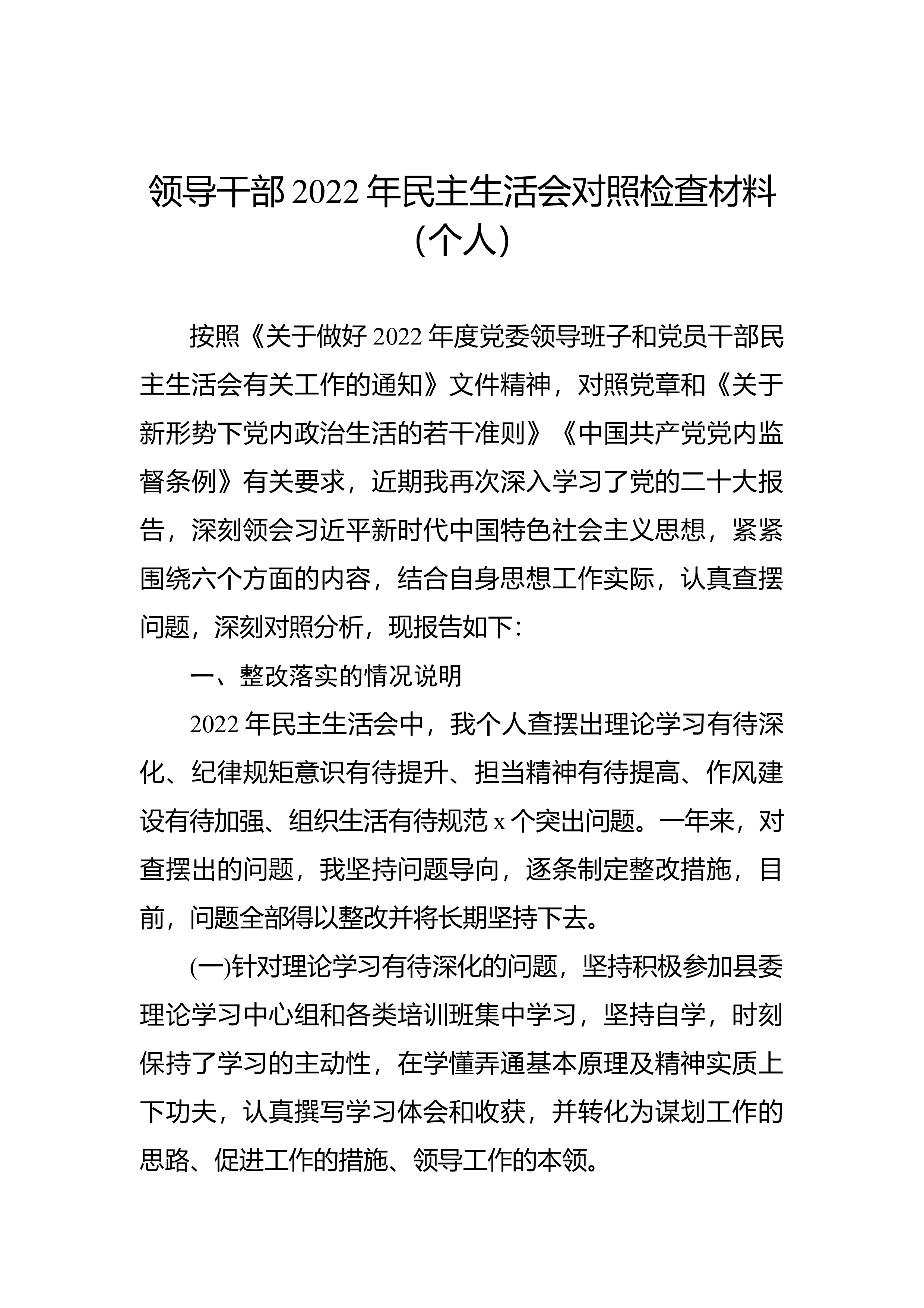 领导干部2022年民主生活会对照检查材料(个人)按照《关于做好2022年度党委领导班子和党员干部民主生活会有关工作的通知》文件精神,对照党章和《关于新形势下党内政治生活的若干准则》《中国共产党党内监督条例》有关要求,近期我再次深入学习了党的二十大报告,深刻领会习近平新时代中国特色社会主义思想,紧紧围绕六个方面的内容,结合自身思想工作实际,认真查摆问题,深刻对照分析,现报告如下:一、整改落实的情况说明2022年民主生活会中,我个人查摆出理论学习有待深化、纪律规矩意识有待提升、担当精神有待提高、作风建设有待加强、组织生活有待规范x个突出问题。一年来,对查摆出的问题,我坚持问题导向,逐条制定整改措施...