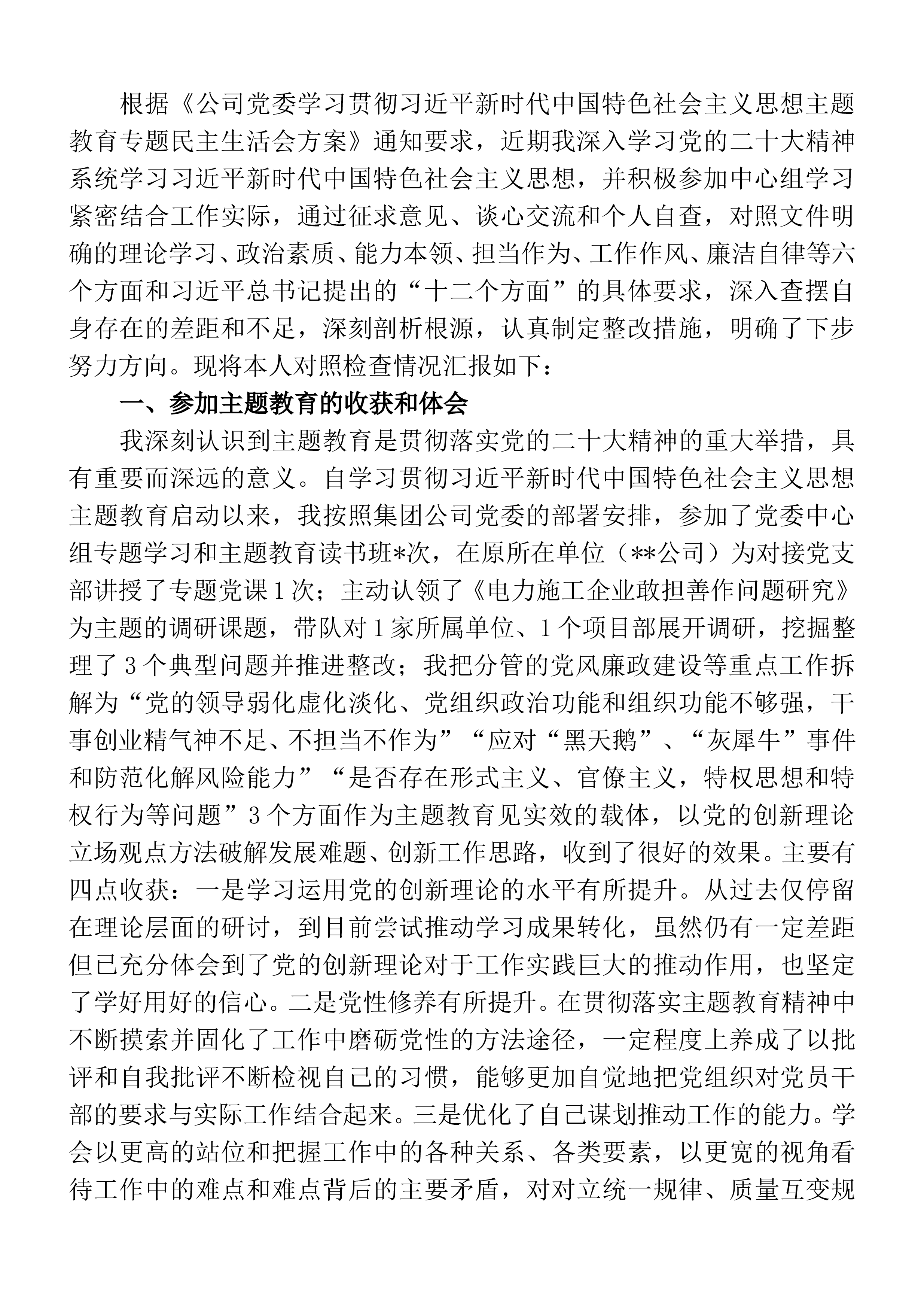 国企公司董事长巡视整改专题民主生活会对照检查发言材料