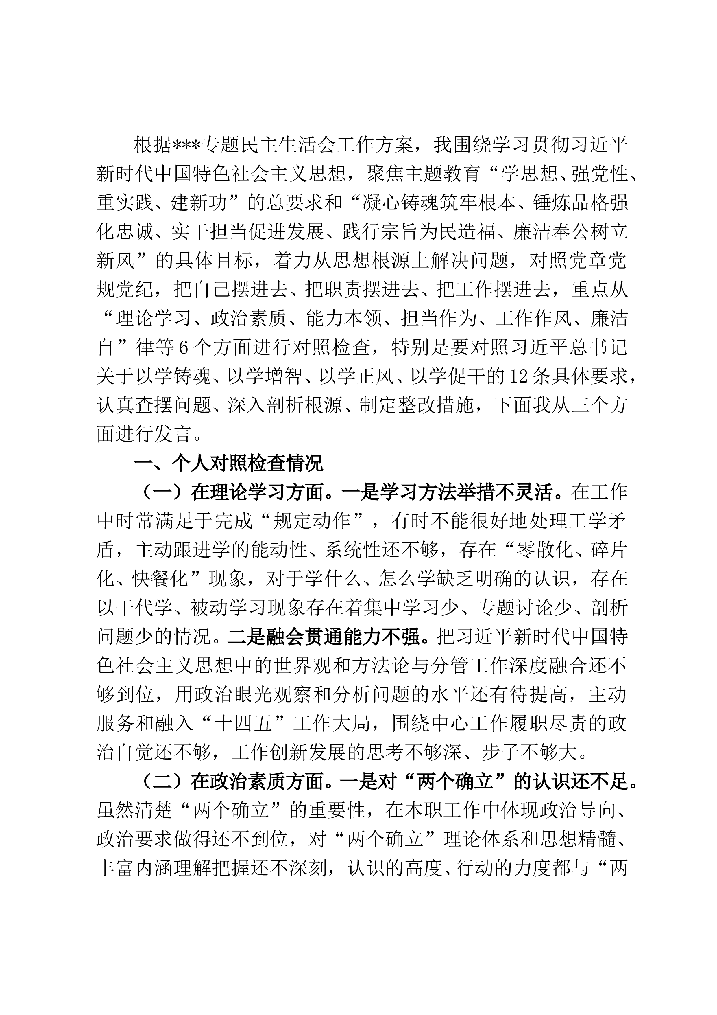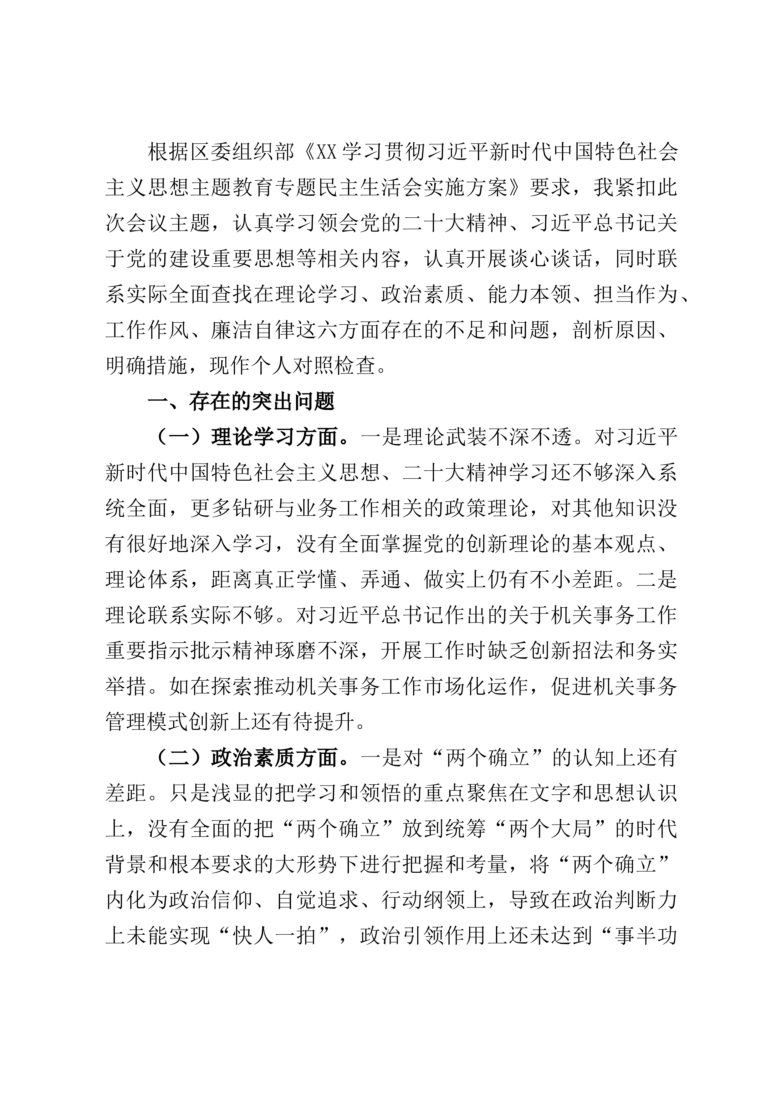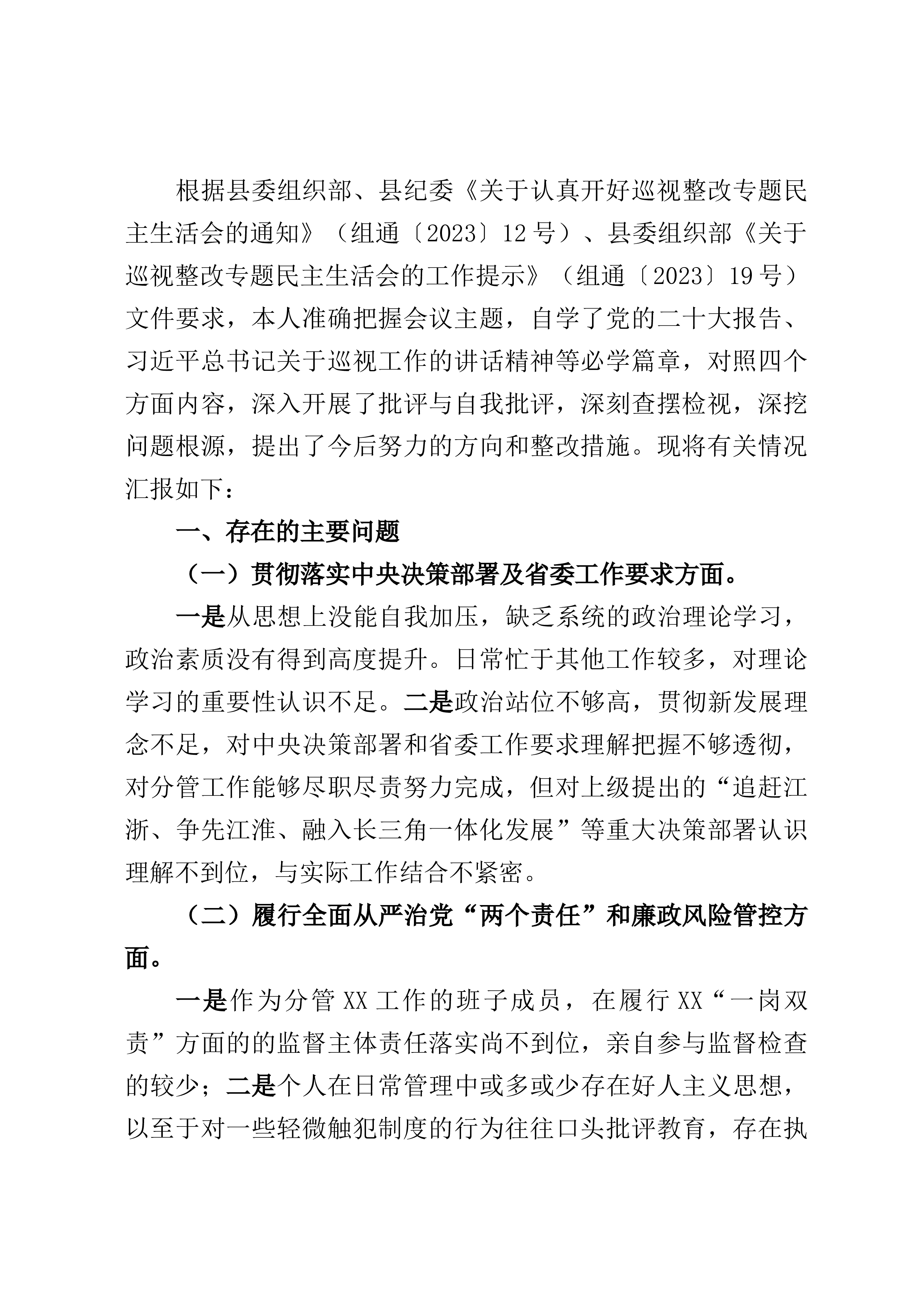 根据县委组织部、县纪委《关于认真开好巡视整改专题民主生活会的通知》(组通〔2023〕12号)、县委组织部《关于巡视整改专题民主生活会的工作提示》(组通〔2023〕19号)文件要求,本人准确把握会议主题,自学了党的二十大报告、习近平总书记关于巡视工作的讲话精神等必学篇章,对照四个方面内容,深入开展了批评与自我批评,深刻查摆检视,深挖问题根源,提出了今后努力的方向和整改措施。现将有关情况汇报如下:一、存在的主要问题(一)贯彻落实中央决策部署及省委工作要求方面。一是从思想上没能自我加压,缺乏系统的政治理论学习,政治素质没有得到高度提升。日常忙于其他工作较多,对理论学习的重要性认识不足。二是政治站位不...