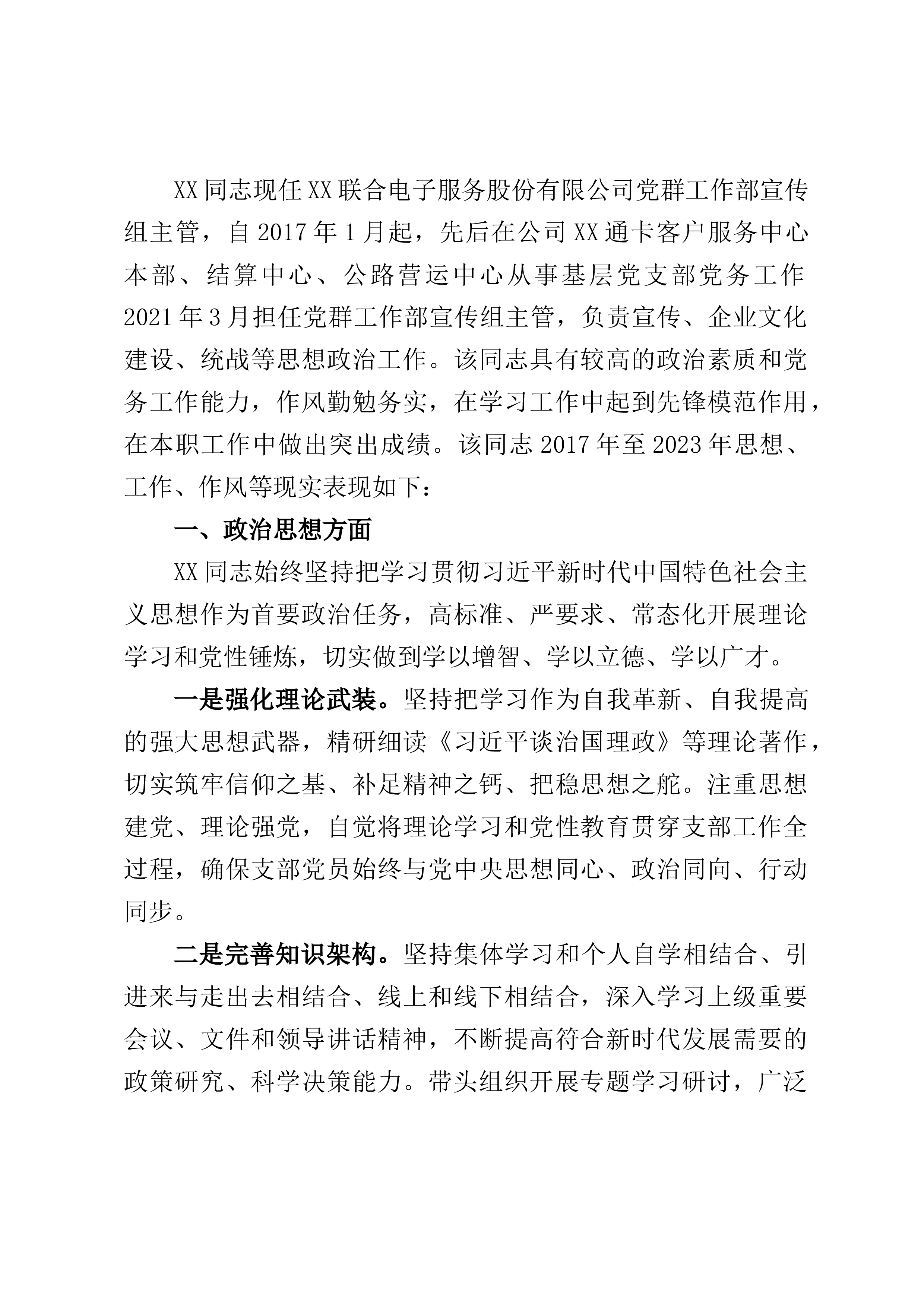 XX同志现任XX联合电子服务股份有限公司党群工作部宣传组主管,自2017年1月起,先后在公司XX通卡客户服务中心本部、结算中心、公路营运中心从事基层党支部党务工作2021年3月担任党群工作部宣传组主管,负责宣传、企业文化建设、统战等思想政治工作。该同志具有较高的政治素质和党务工作能力,作风勤勉务实,在学习工作中起到先锋模范作用,在本职工作中做出突出成绩。该同志2017年至2023年思想、工作、作风等现实表现如下:一、政治思想方面XX同志始终坚持把学习贯彻习近平新时代中国特色社会主义思想作为首要政治任务,高标准、严要求、常态化开展理论学习和党性锤炼,切实做到学以增智、学以立德、学以广才。一是强化...