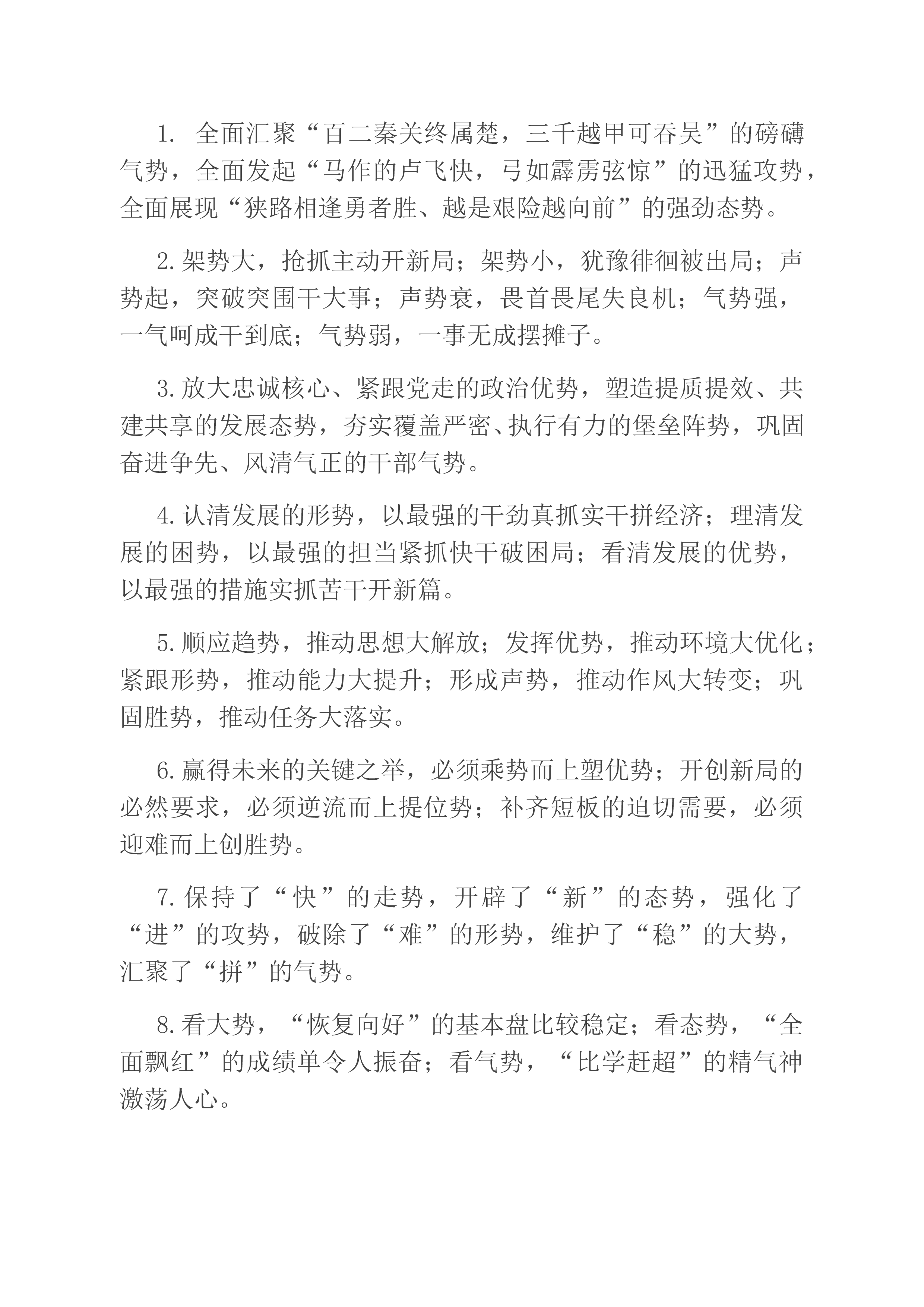 1.在“学思想”中接受精神洗礼、强化绝对忠诚;在“强党性”中树牢宗旨意识、厚植为民情怀;在“重实践”中勇于砥砺奋斗、锻造过硬本领;在“建新功”中锤炼过硬作风、狠抓任务落实。2.在“知足知不足”中扬长避短、积厚成势,在“有为有不为”中真抓实干、攻坚克难,在“润物细无声”中严于律己、和谐相处。3.在理论学习中悟真理、铸忠诚,在调查研究中察真情、谋实策,在推动发展中下真功、强担当,在检视整改中见真章、促提升。4.在问题整改中找思路、寻办法,在创新机制中抢先机、提质效,在节约集约中增动能、促发展,在深化合作中找机遇、谋共赢。5.在传承红色基因中践行对党忠诚的大德,在践行初心使命中崇尚造福人民的公德,在...