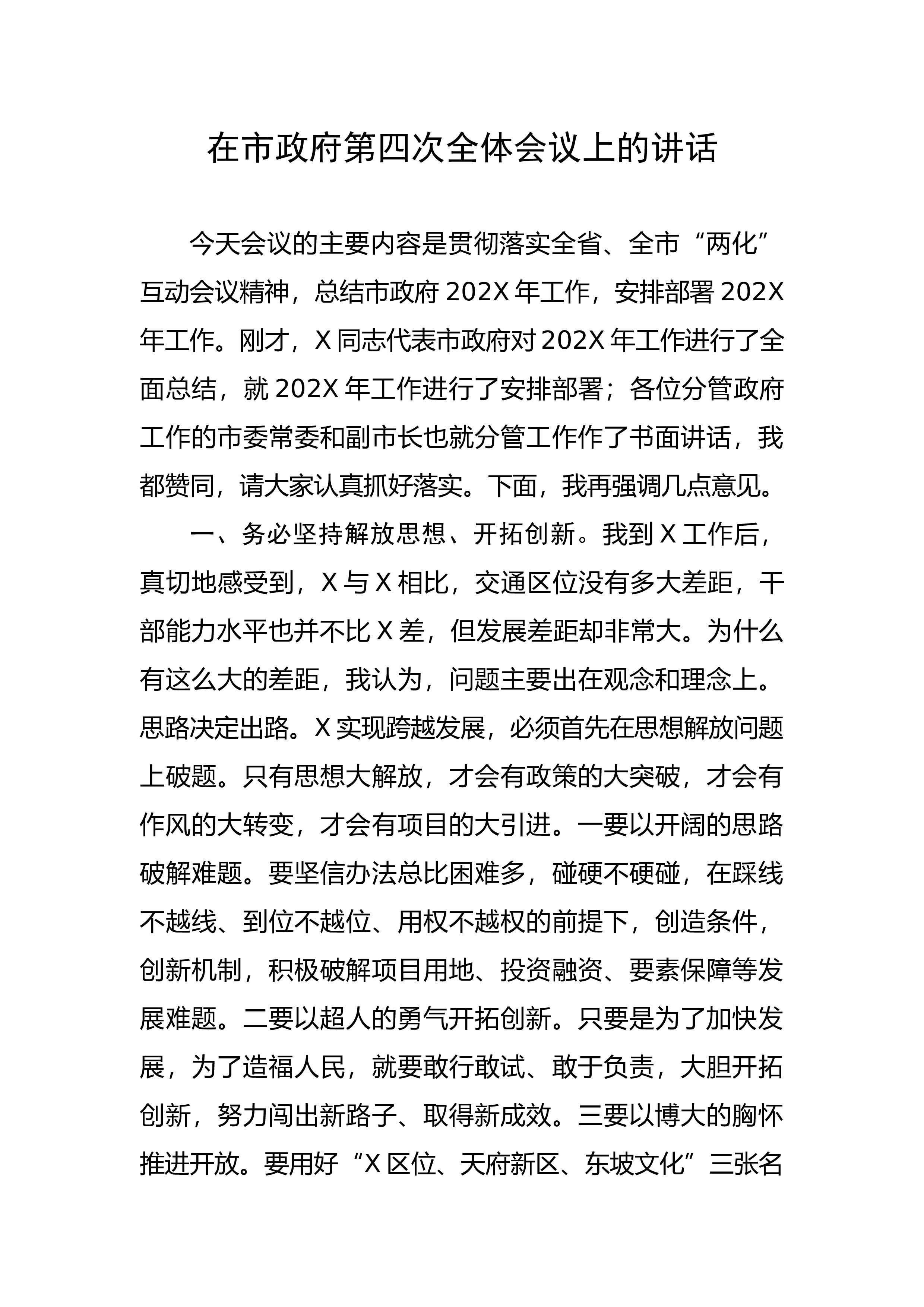 在县十七届人民政府第一次全体会议上的讲话同志们:这次会议的主要任务是:深入贯彻市县党代会、县委经济工作会议、县“两会”精神,紧紧围绕县委提出的聚力打造“改革创新高地品质生活新城”,对今年政府各项重点工作任务进行再动员、再部署、再落实,以沸腾的状态、争先的姿态、求实的心态,聚焦项目抓落实,高点起步开新局。一、“辩证看”当前,国际局势、国内环境、区域格局日趋复杂,对于我们来说,既面临严峻挑战,又蕴含无限机遇。这就要求我们坚持辩证思维方式、掌握系统科学方法,提高把握方向、把握大势、把握全局的能力。一要把握宏观大势。从利好的角度看,一是政策有“大礼包”。去年底,中央经济工作会议对今年工作提出了“稳字当...