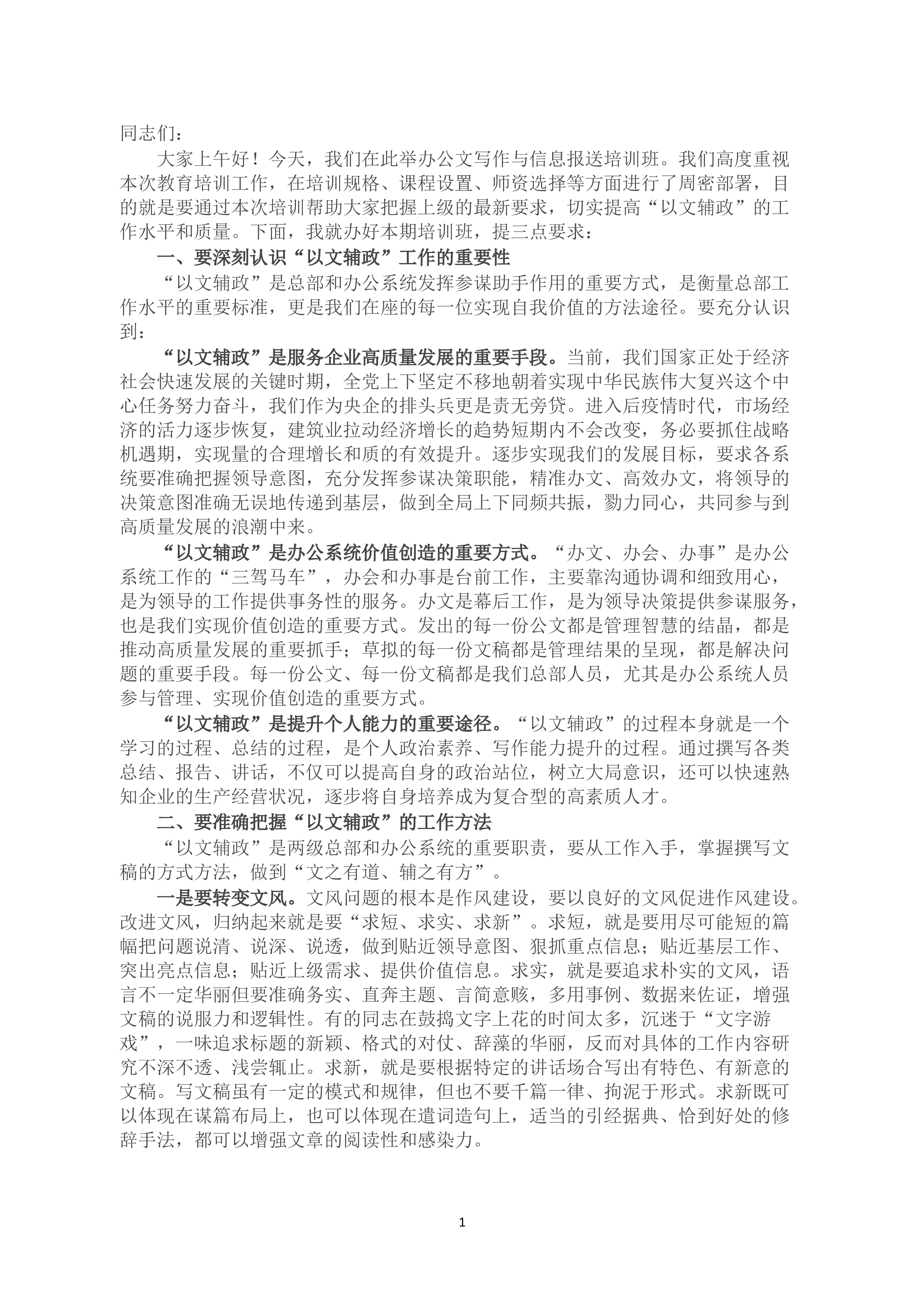 同志们:大家上午好!今天,我们在此举办公文写作与信息报送培训班。我们高度重视本次教育培训工作,在培训规格、课程设置、师资选择等方面进行了周密部署,目的就是要通过本次培训帮助大家把握上级的最新要求,切实提高“以文辅政”的工作水平和质量。下面,我就办好本期培训班,提三点要求:一、要深刻认识“以文辅政”工作的重要性“以文辅政”是总部和办公系统发挥参谋助手作用的重要方式,是衡量总部工作水平的重要标准,更是我们在座的每一位实现自我价值的方法途径。要充分认识到:“以文辅政”是服务企业高质量发展的重要手段。当前,我们国家正处于经济社会快速发展的关键时期,全党上下坚定不移地朝着实现中华民族伟大复兴这个中心任务...