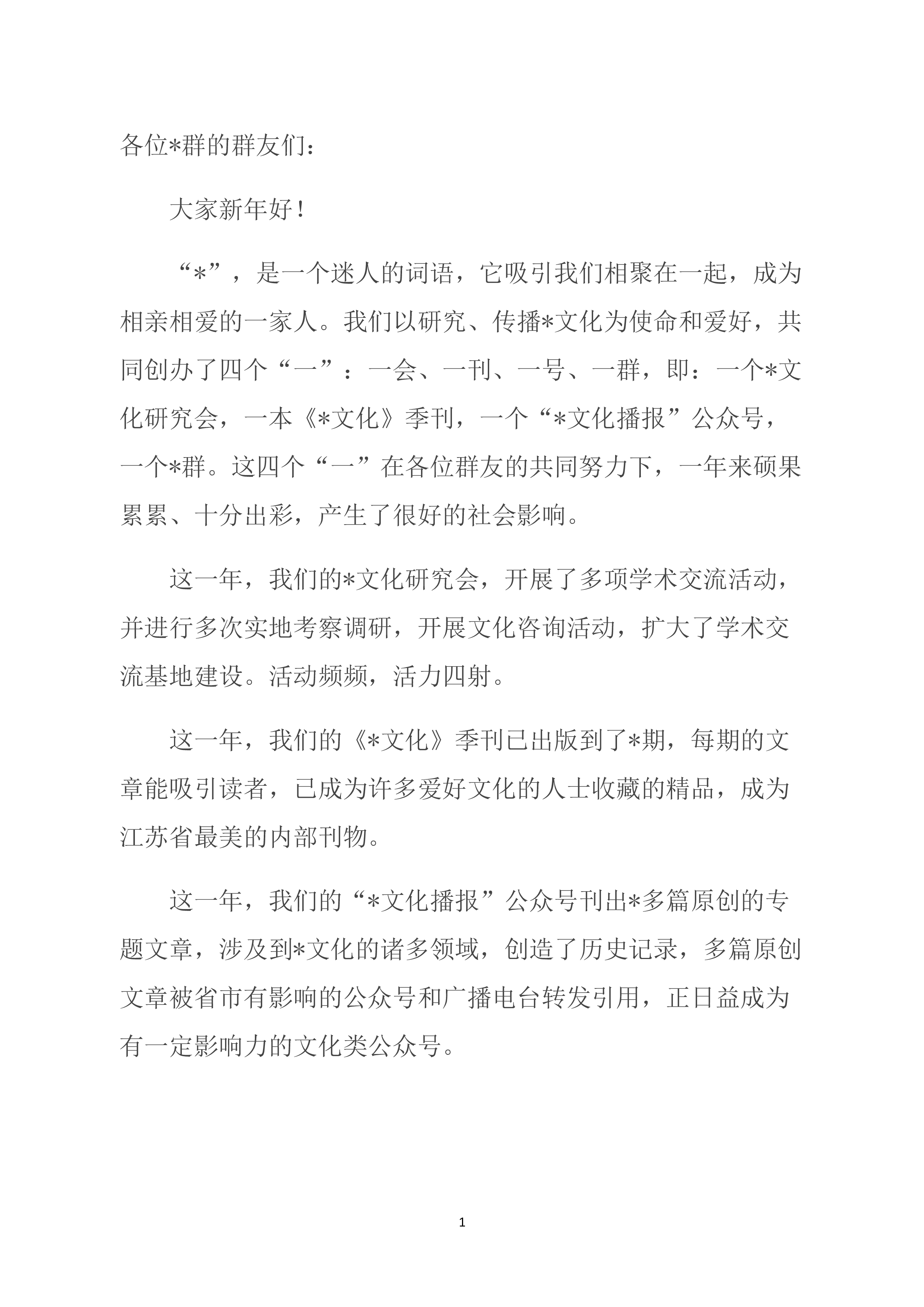 各位*群的群友们:大家新年好!“*”,是一个迷人的词语,它吸引我们相聚在一起,成为相亲相爱的一家人。我们以研究、传播*文化为使命和爱好,共同创办了四个“一”:一会、一刊、一号、一群,即:一个*文化研究会,一本《*文化》季刊,一个“*文化播报”公众号,一个*群。这四个“一”在各位群友的共同努力下,一年来硕果累累、十分出彩,产生了很好的社会影响。这一年,我们的*文化研究会,开展了多项学术交流活动,并进行多次实地考察调研,开展文化咨询活动,扩大了学术交流基地建设。活动频频,活力四射。这一年,我们的《*文化》季刊已出版到了*期,每期的文章能吸引读者,已成为许多爱好文化的人士收藏的精品,成为江苏省最美的...