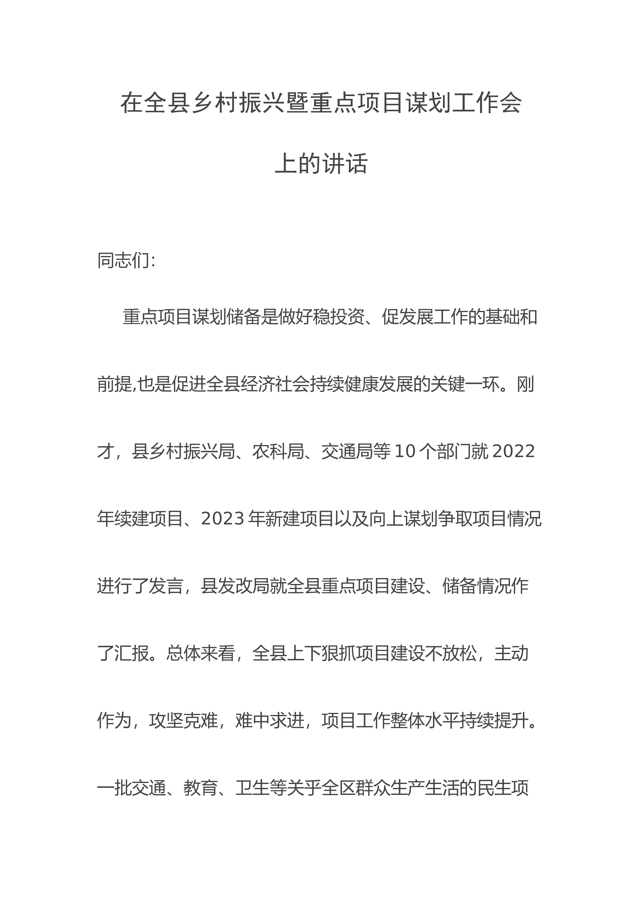 储备是做好稳投资、促发展工作的基础和前提,也是促进全县经济社会持续健康发展的关键一环。刚才,县乡村振兴局、农科局、交通局等10个部门就2022年续建项目、2023年新建项目以及向上谋划争取项目情况进行了发言,县发改局就全县重点项目建设、储备情况作了汇报。总体来看,全县上下狠抓项目建设不放松,主动作为,攻坚克难,难中求进,项目工作整体水平持续提升。一批交通、教育、卫生等关乎全区群众生产生活的民生项目得以顺利实施,城乡基础设施、生态环境建设取得明显成效,人民群众生产生活条件得到了显著改善,有力地支撑了全县经济社会高质量发展。在肯定成绩的...