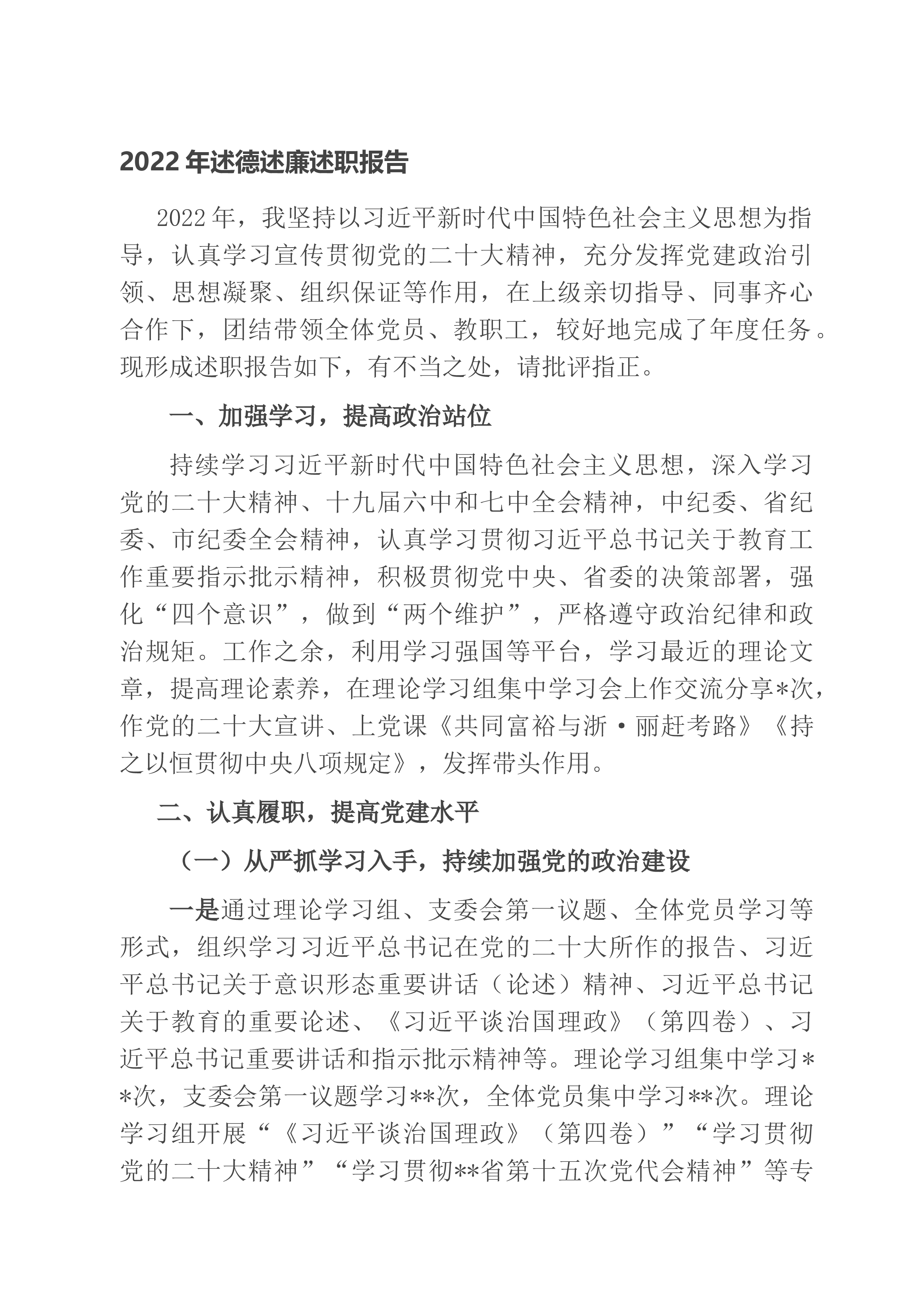 2022年支部书记抓党建工作述职报告2022年,在市直机关工委的关心指导下,我始终坚持以习近平新时代中国特色社会主义思想为指导,以党的政治建设为统领,牢固树立抓好党建就是最大政绩的理念,认真贯彻落实新时代党的建设总要求和组织路线,紧紧围绕市委中心工作,全面履行管党治党责任,抓品牌、建机制,强党建、筑堡垒,抓班子、带队伍,巩固提升“让党中央放心,让人民群众满意”模范机关创建成果,创新“********”党建品牌,促进党建与业务工作深度融合,以高质量党建引领****工作高质量发展,***整体工作迈入了发展提速、工作提质、精神提振的快车道。一、狠抓政治建设,把牢前进“方向盘”坚持把党的政治建设摆在首...