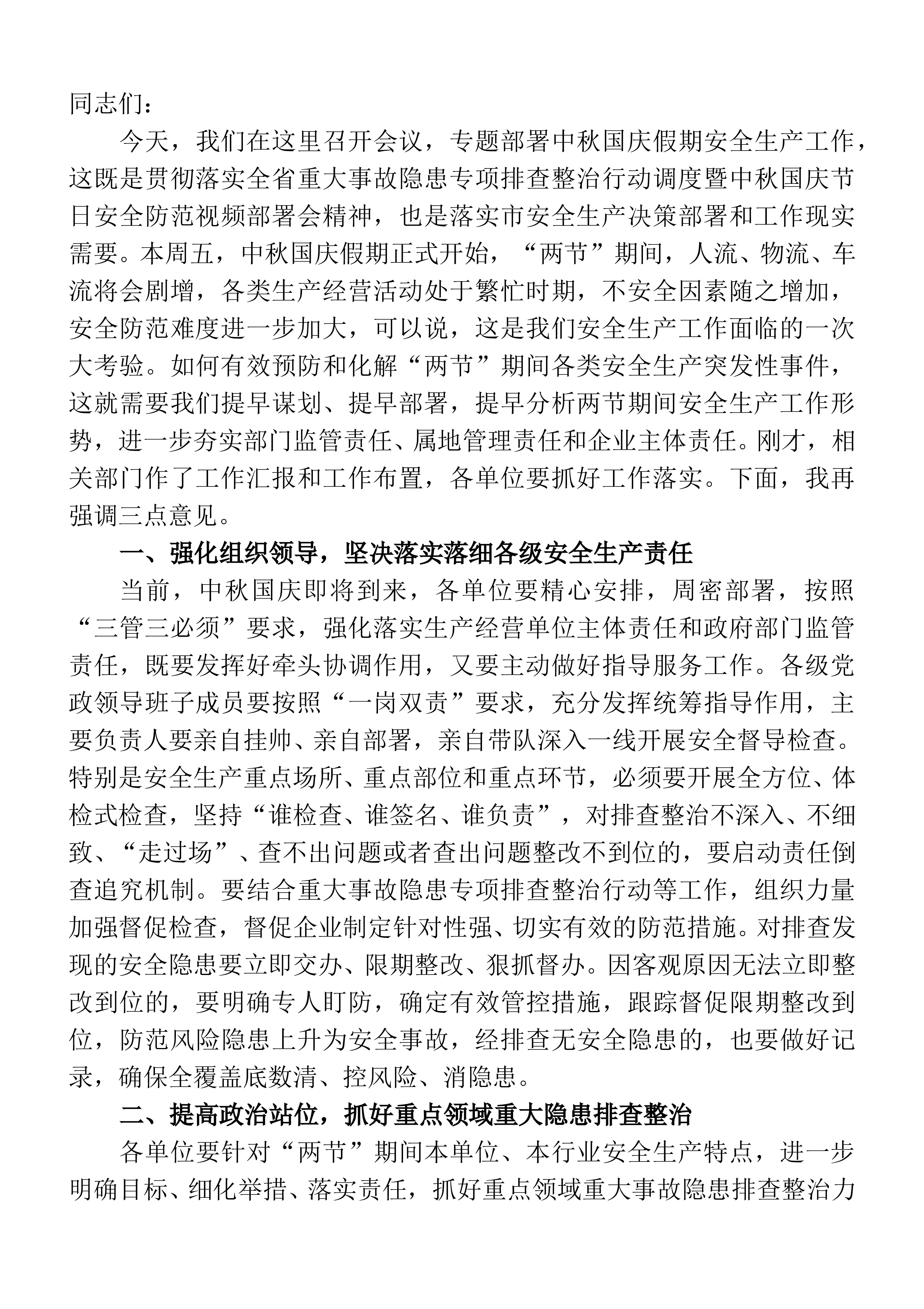 、国庆“双节”前安全专项排查整治部署会上的讲话